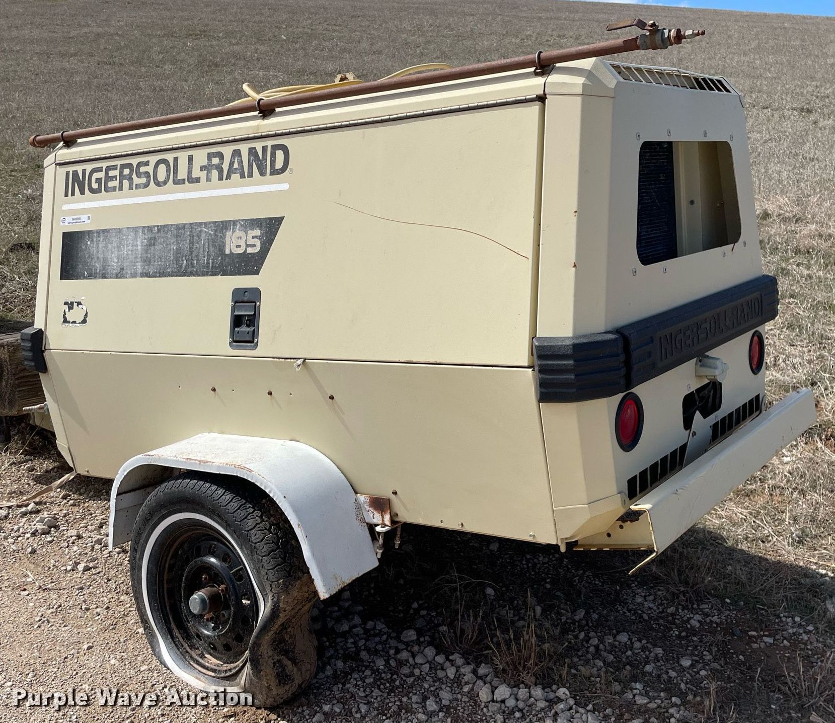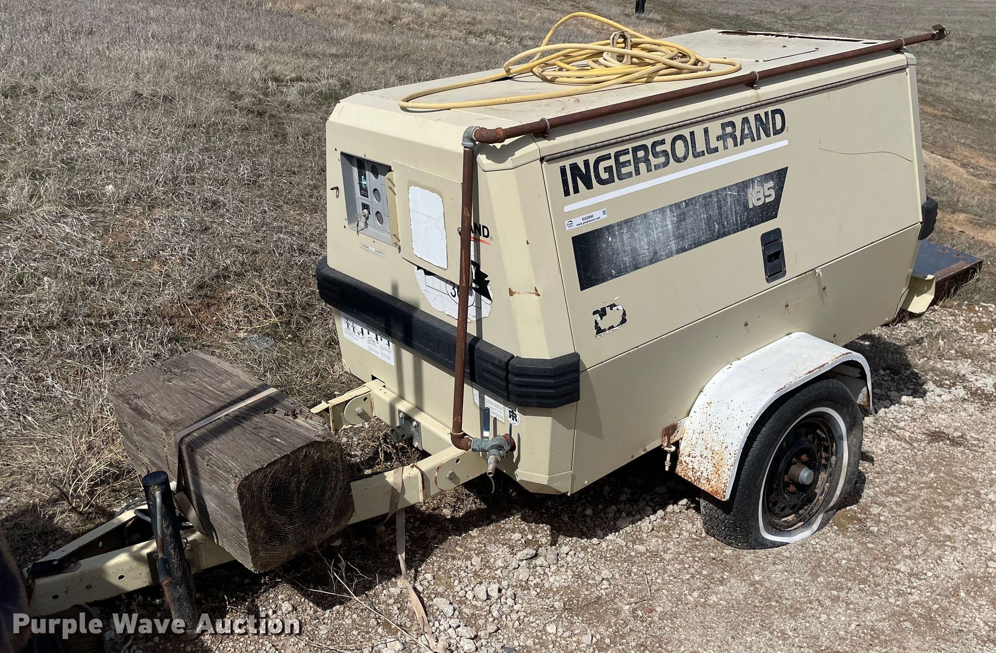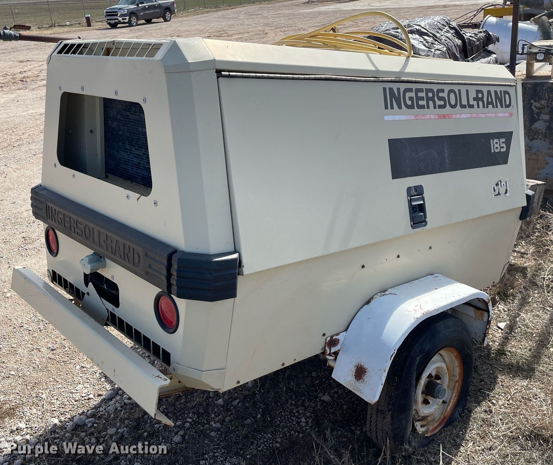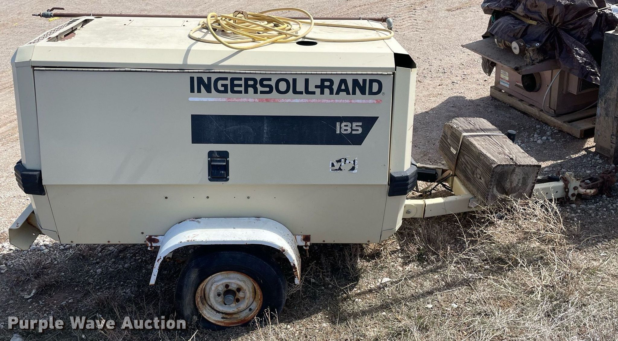 Purple Wave is selling a used Air Compressor in Kansas. This item is a 1998 Ingersoll Rand 185 air compressor with the following: Hours: Unknown, VIN: 285734UAI222, Serial: S09651050-100