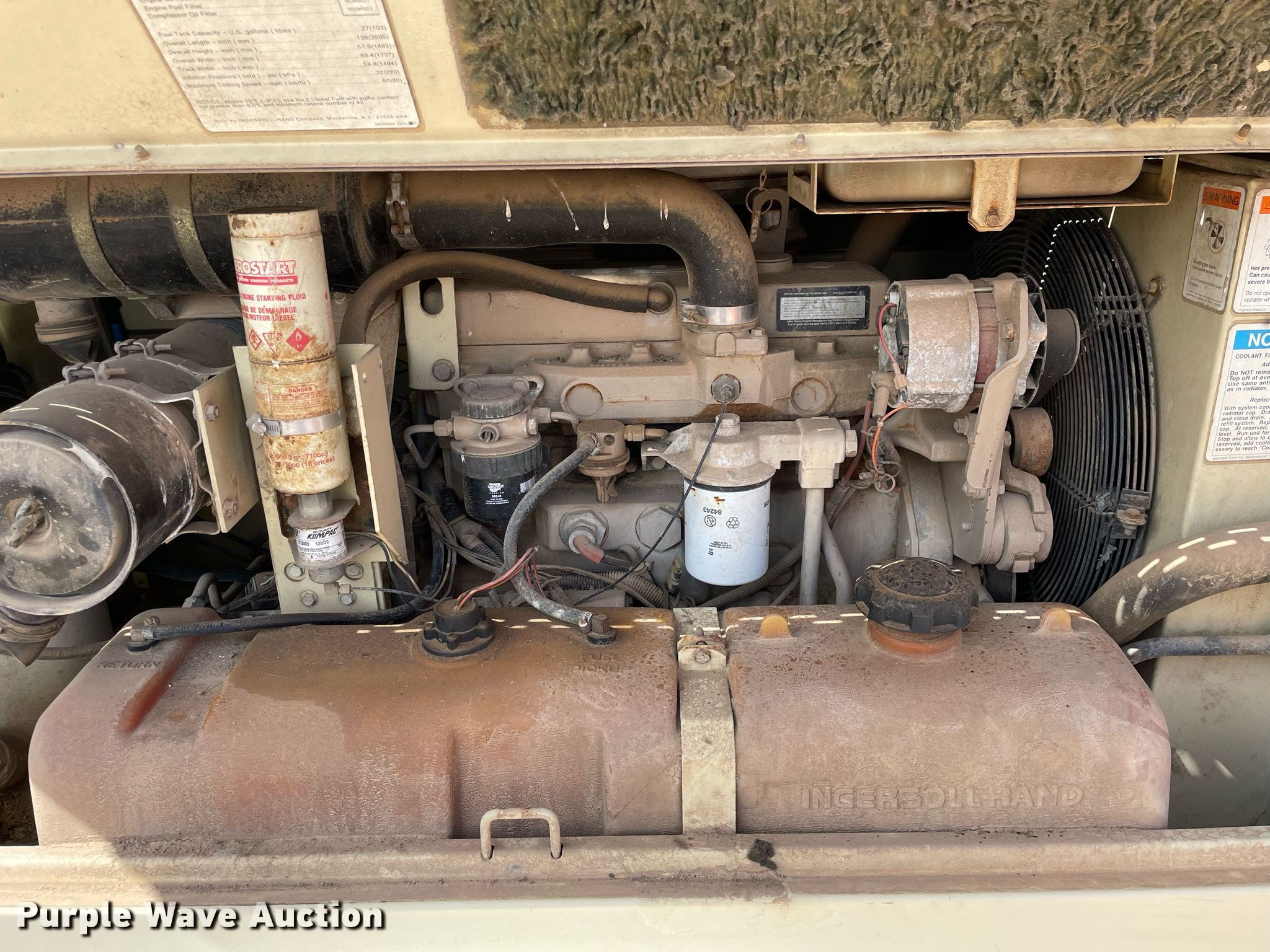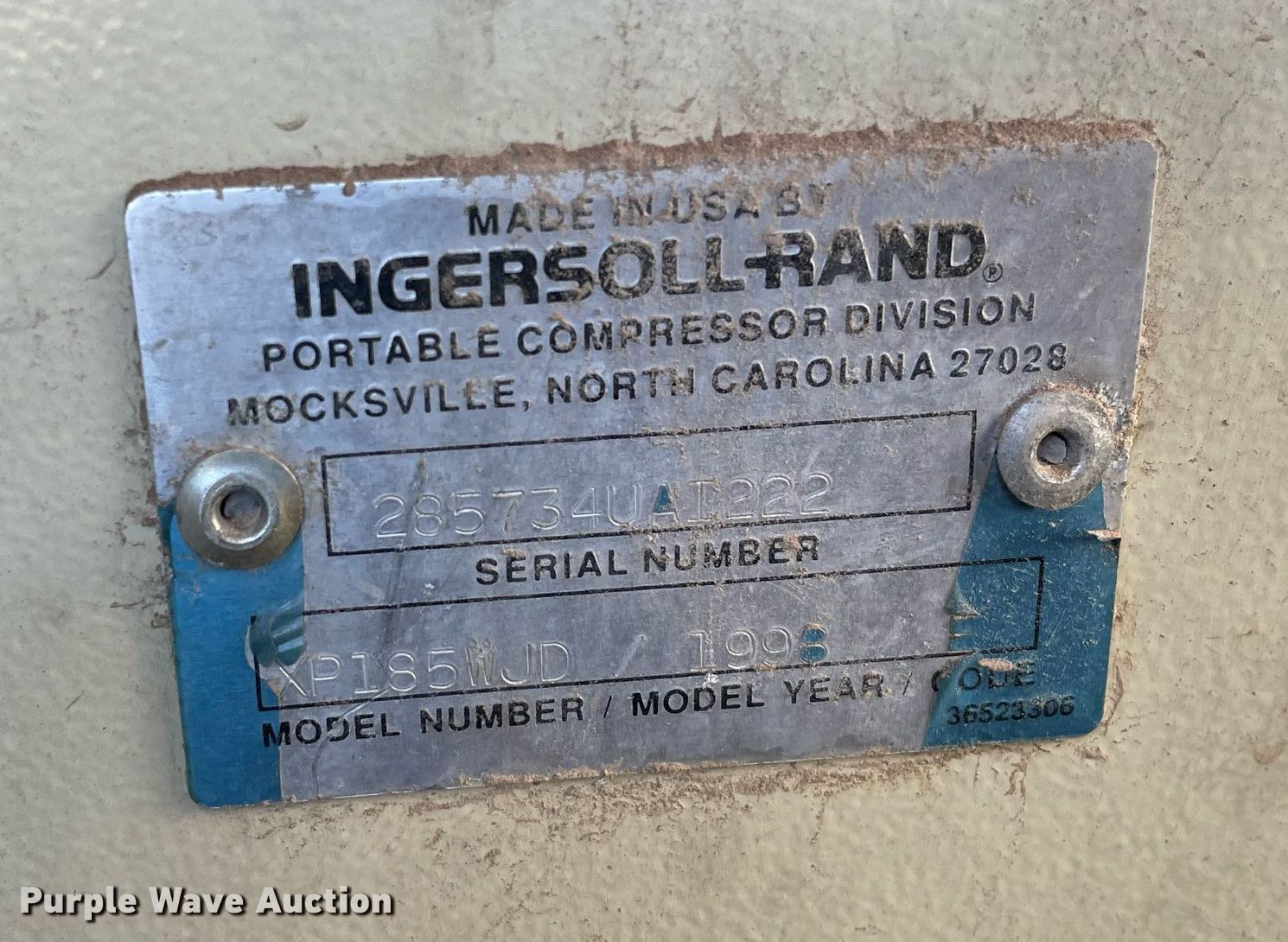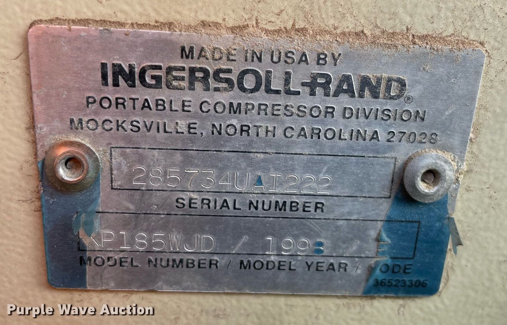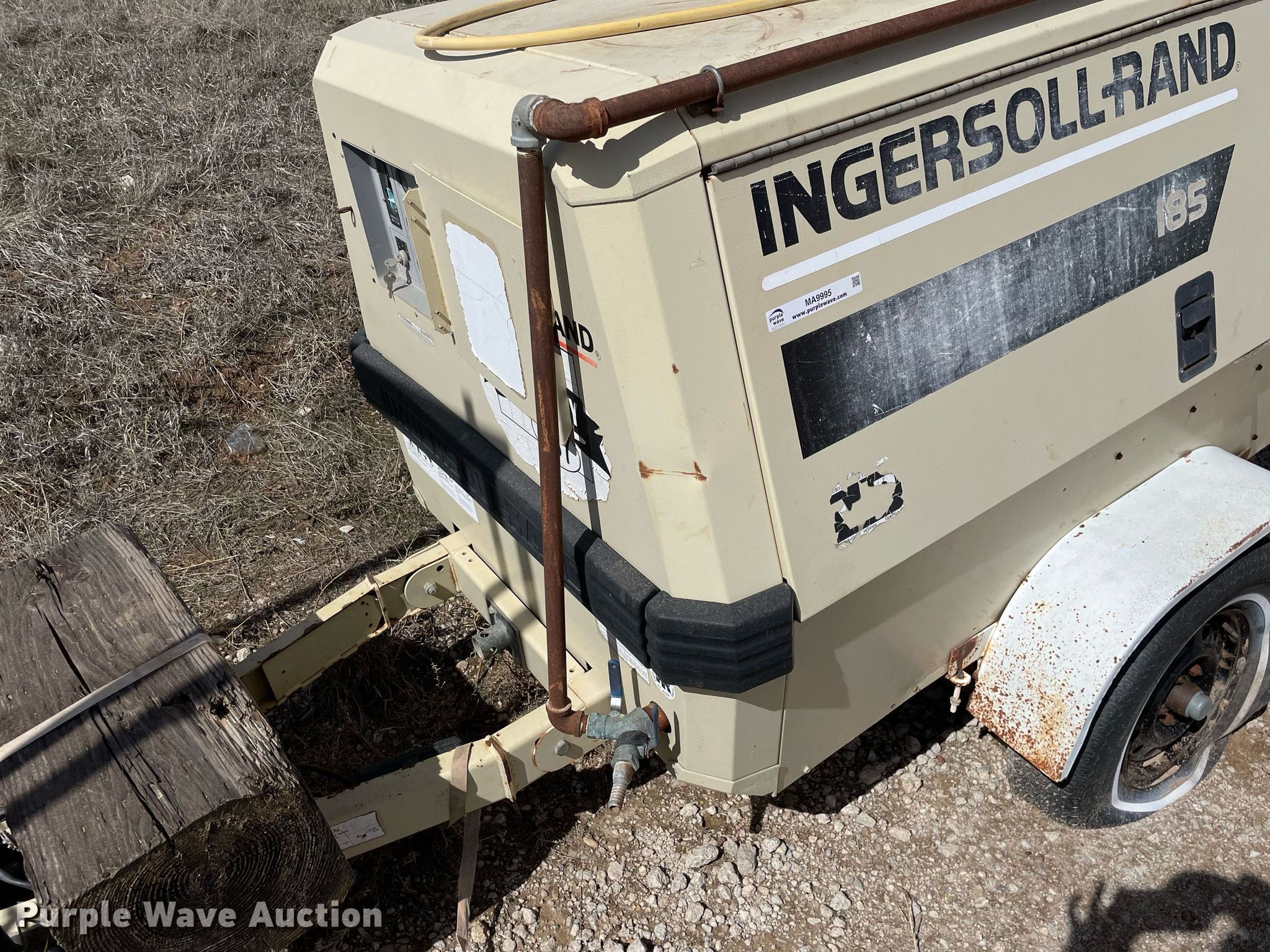 Purple Wave is selling a used Air Compressor in Kansas. This item is a 1998 Ingersoll Rand 185 air compressor with the following: Hours: Unknown, VIN: 285734UAI222, Serial: S09651050-100