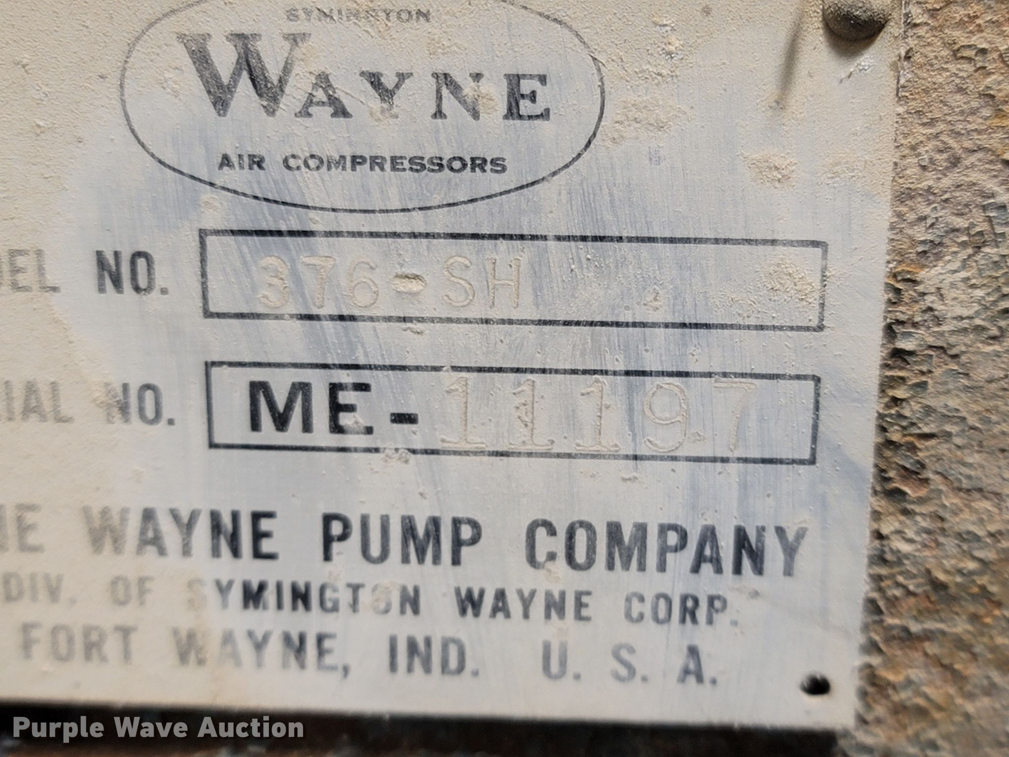 Purple Wave is selling a used Air Compressor in Missouri. This item is a Wayne 376-SH air compressor with the following: Serial: ME-11197