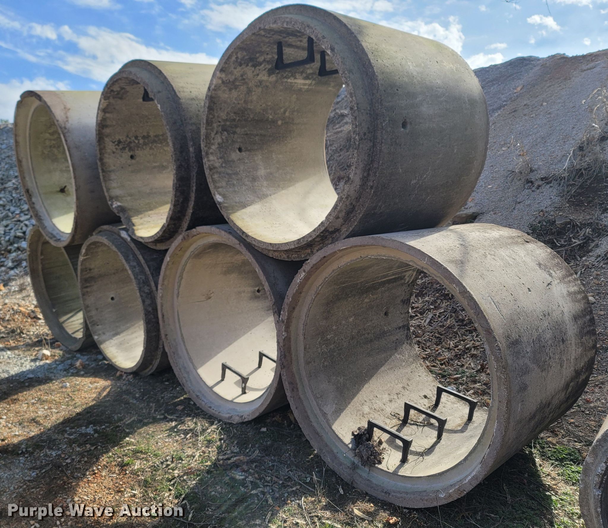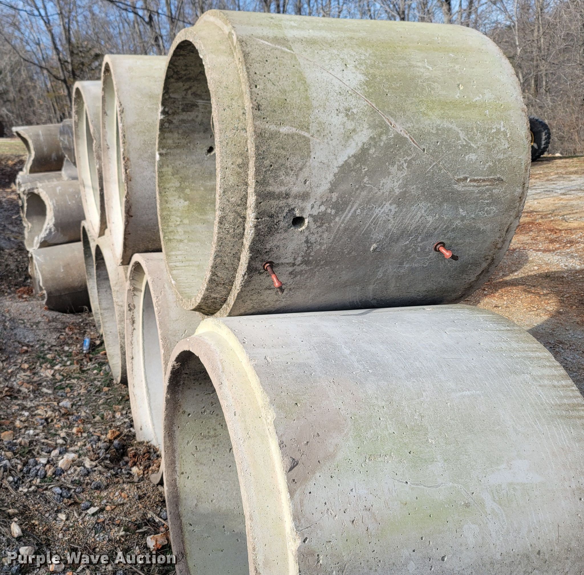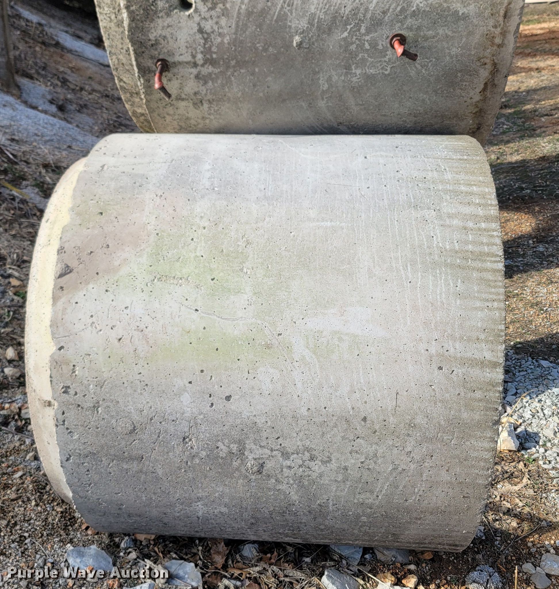 Purple Wave is selling a used Building Materials in Missouri. This item is a Building materials with the following: (7) man hole drops, 4' L x 55" diameter, Ladder steps, (10) concrete culvert pipes, 6' L x 37" diameter, 3" lip