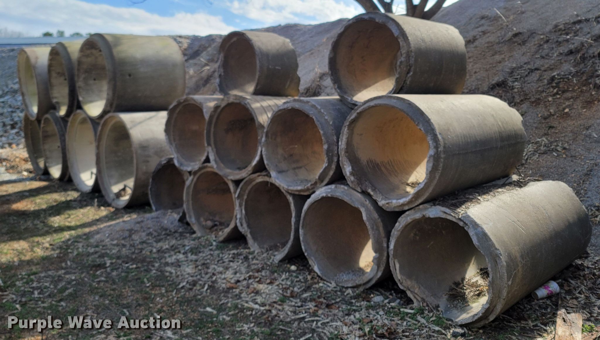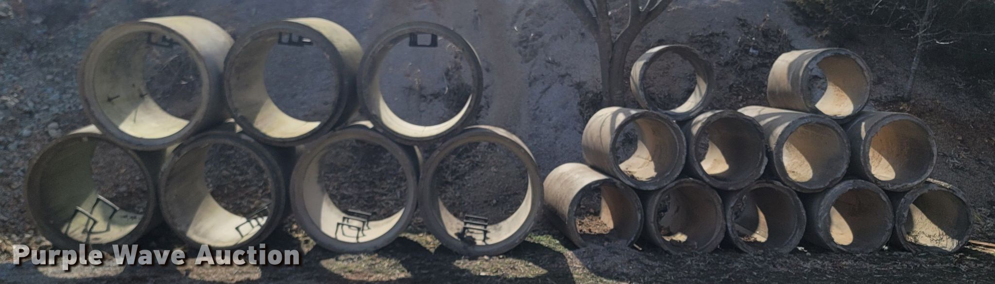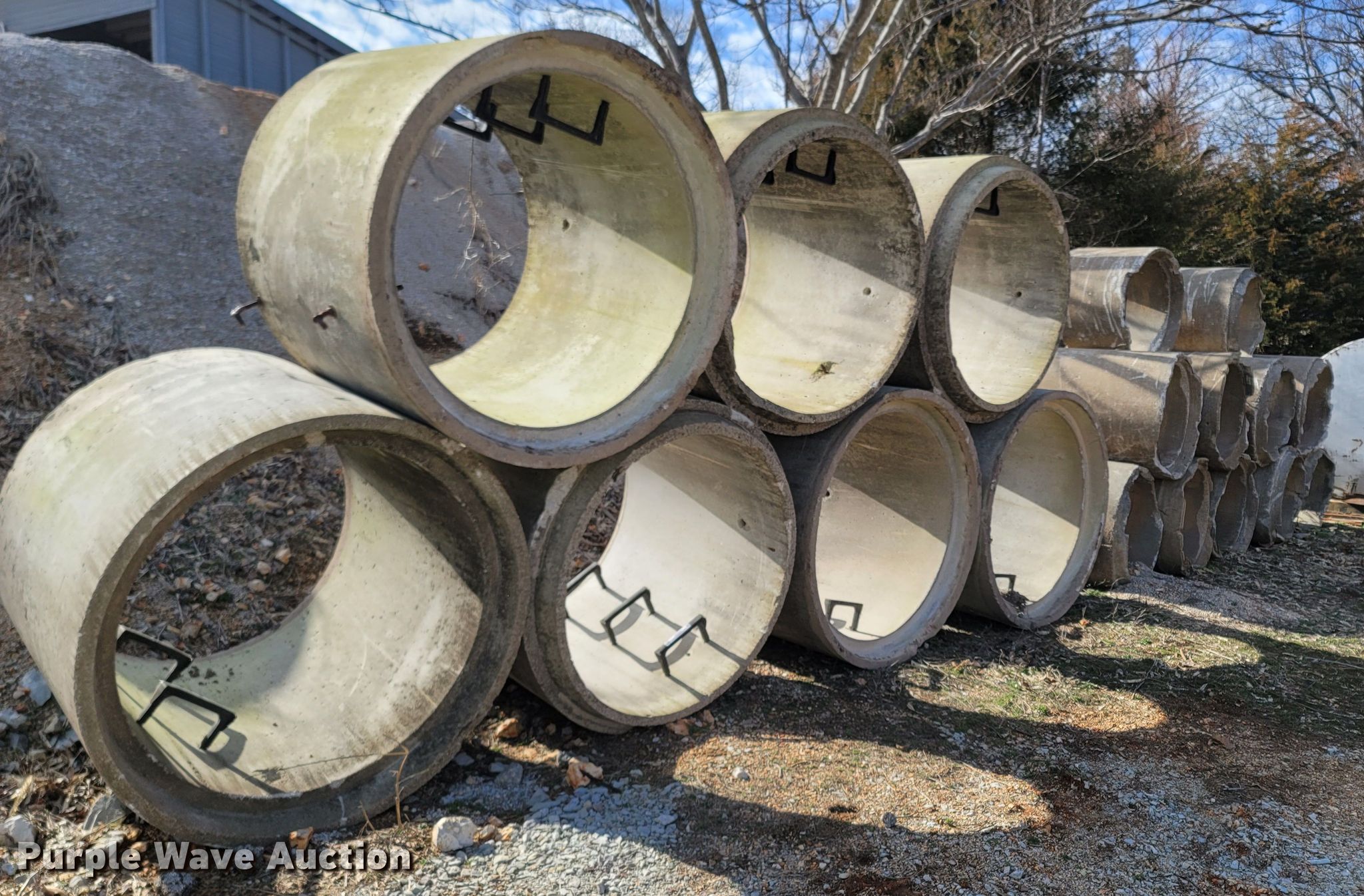 Purple Wave is selling a used Building Materials in Missouri. This item is a Building materials with the following: (7) man hole drops, 4' L x 55" diameter, Ladder steps, (10) concrete culvert pipes, 6' L x 37" diameter, 3" lip