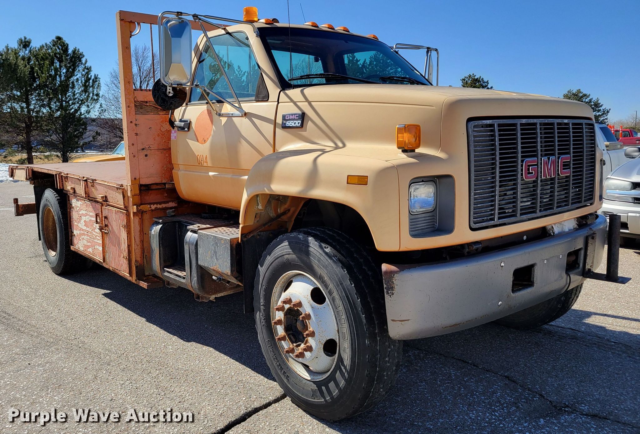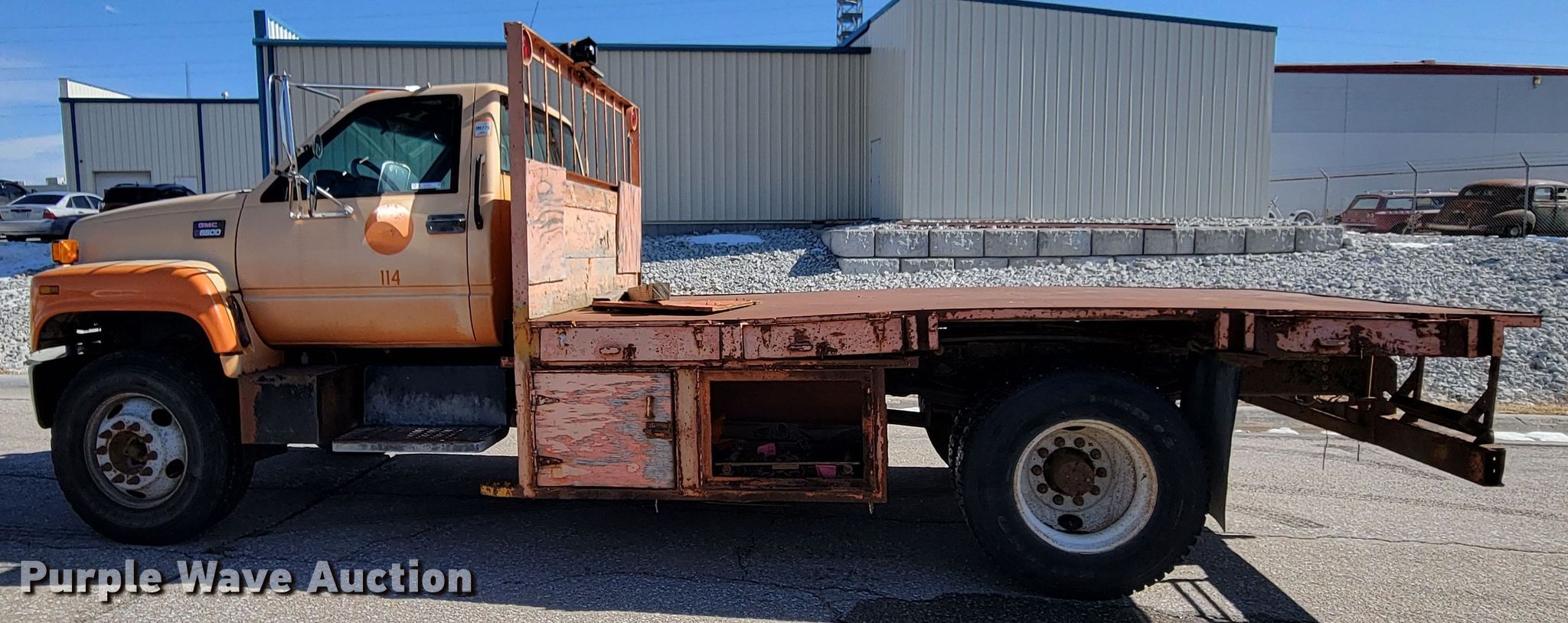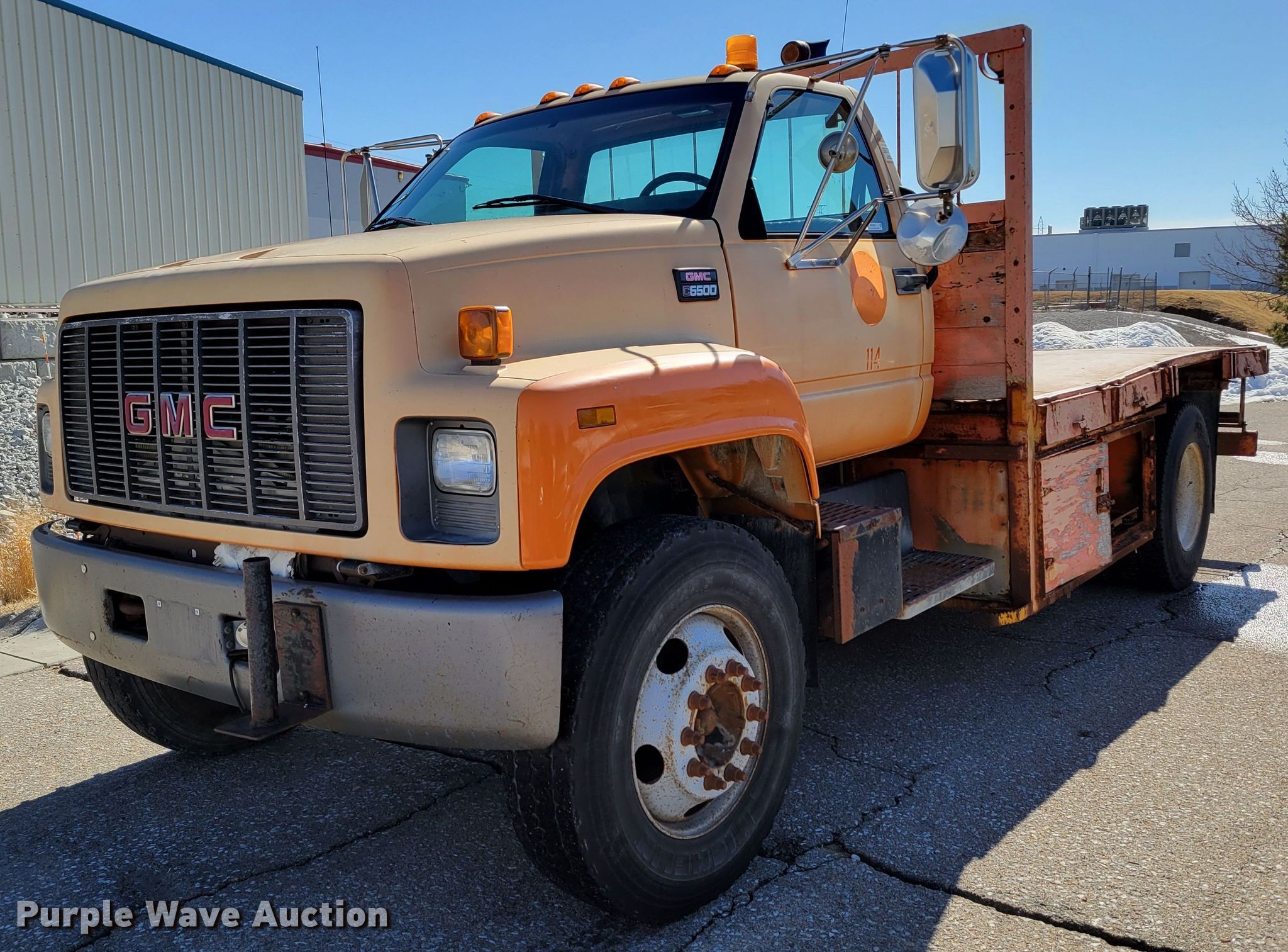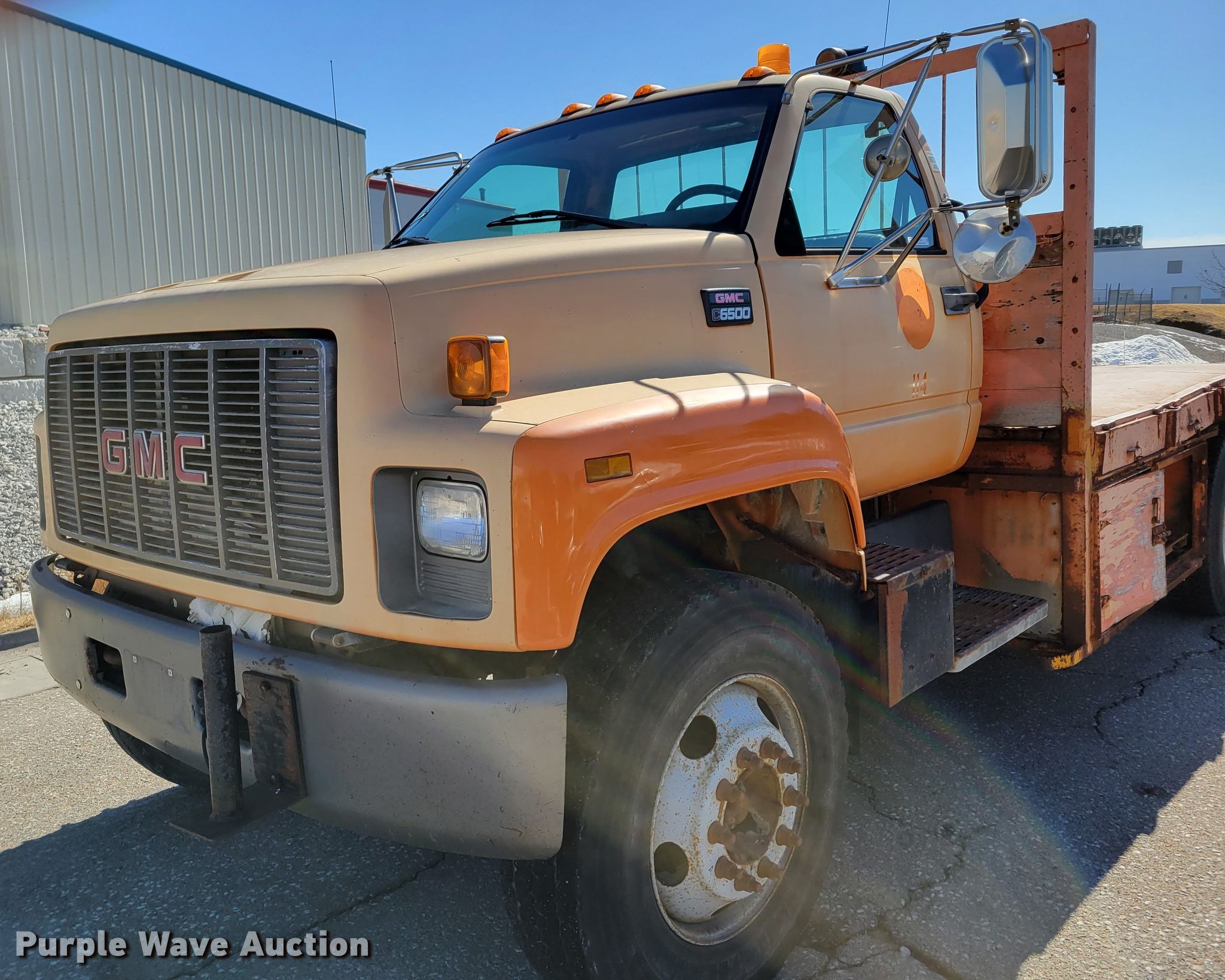 Purple Wave is selling a used Flat Bed Truck in Nebraska. This item is a 2000 GMC C6500 flatbed truck with the following: Miles: 106,888 on odometer, Hours: 6,824 on meter, VIN: 1GDJ7H1C1YJ517669