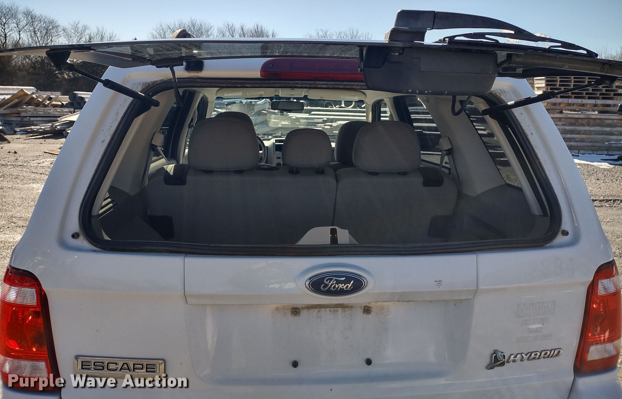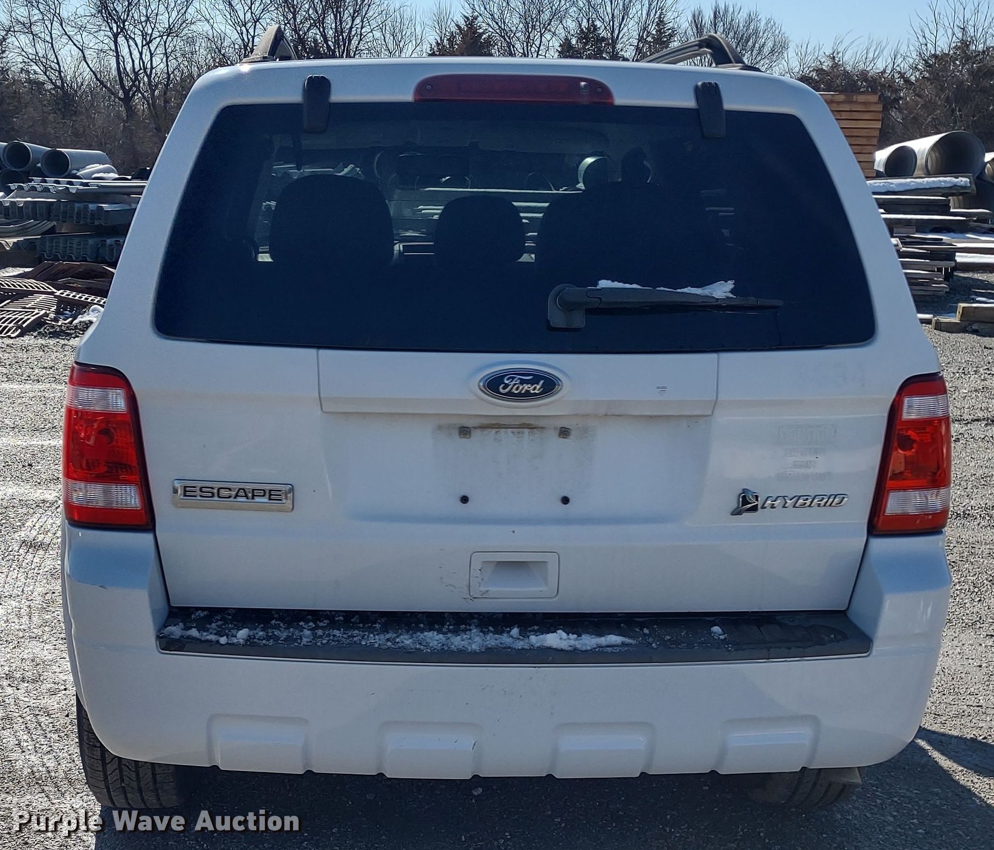2010 Ford Escape Hybrid SUV. Miles: 78,726 on odometer, VIN: 1FMCU4K39AKC13675, Unit #: APR 3384. Engine Displacement: 2.5L L4 DOHC, Cylinders: 4, Fuel type: Hybrid. Transmission Automatic, All wheel drive. Interior AC, Heat, Seat: Power driver, Power windows, Power locks, Cruise control. Tires Size: 235/70R16. Kansas title. Title distribution may be delayed up to 14 days from verification of funds. Johnson County, KS. 1800 W Old 56 Hwy. Olathe, KS 66061