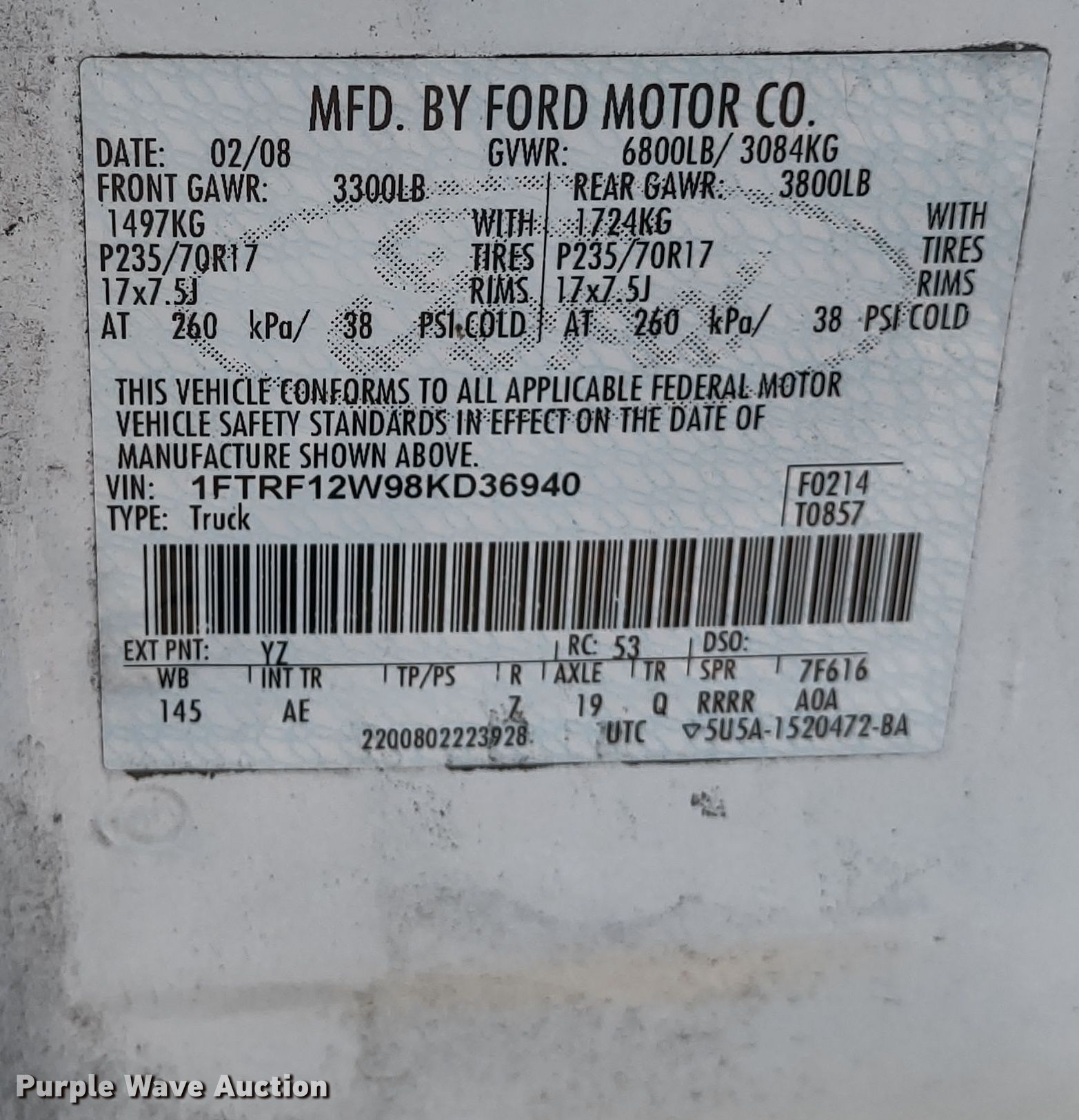 Purple Wave is selling a used 1/2 Ton Pickup or Van in Kansas. This item is a 2008 Ford F150 pickup truck with the following: Miles: 98,321 on odometer, VIN: 1FTRF12W98KD36940, Unit #: FAC 3979