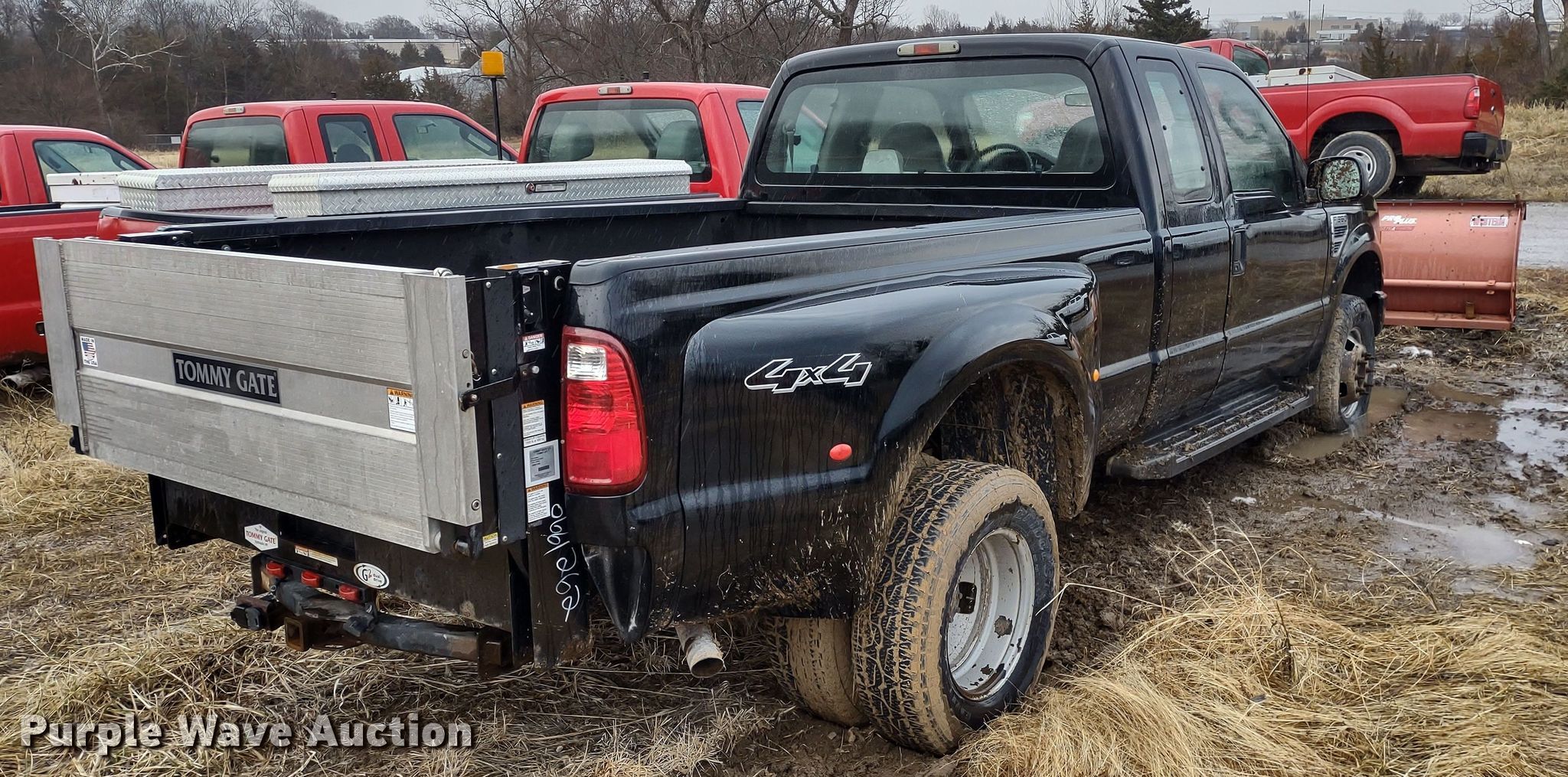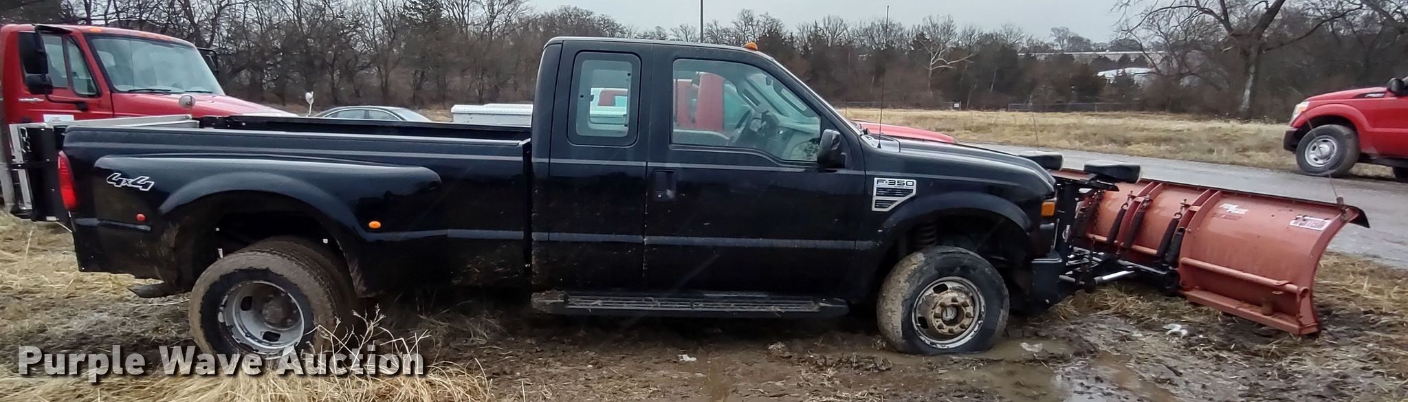 2008 Ford F350 Super Duty pickup truck. Miles: 64,441 on odometer, Hours: 3,112 on meter, VIN: 1FTWX33508EE59106, Unit #: FAC 3359. Engine Displacement: 5.4L V8 OHV, Cylinders: 8, Fuel type: Gas. Transmission Automatic, Four wheel drive. Interior AC, Heat, Power windows, Power locks. Features End gate lift Tommy Gate, Snow plow Western Pro Plus, Width: 9'. Tires Size: 245/75R17. Kansas title. Title distribution may be delayed up to 14 days from verification of funds. Johnson County, KS. 1800 W Old 56 Hwy. Olathe, KS 66061