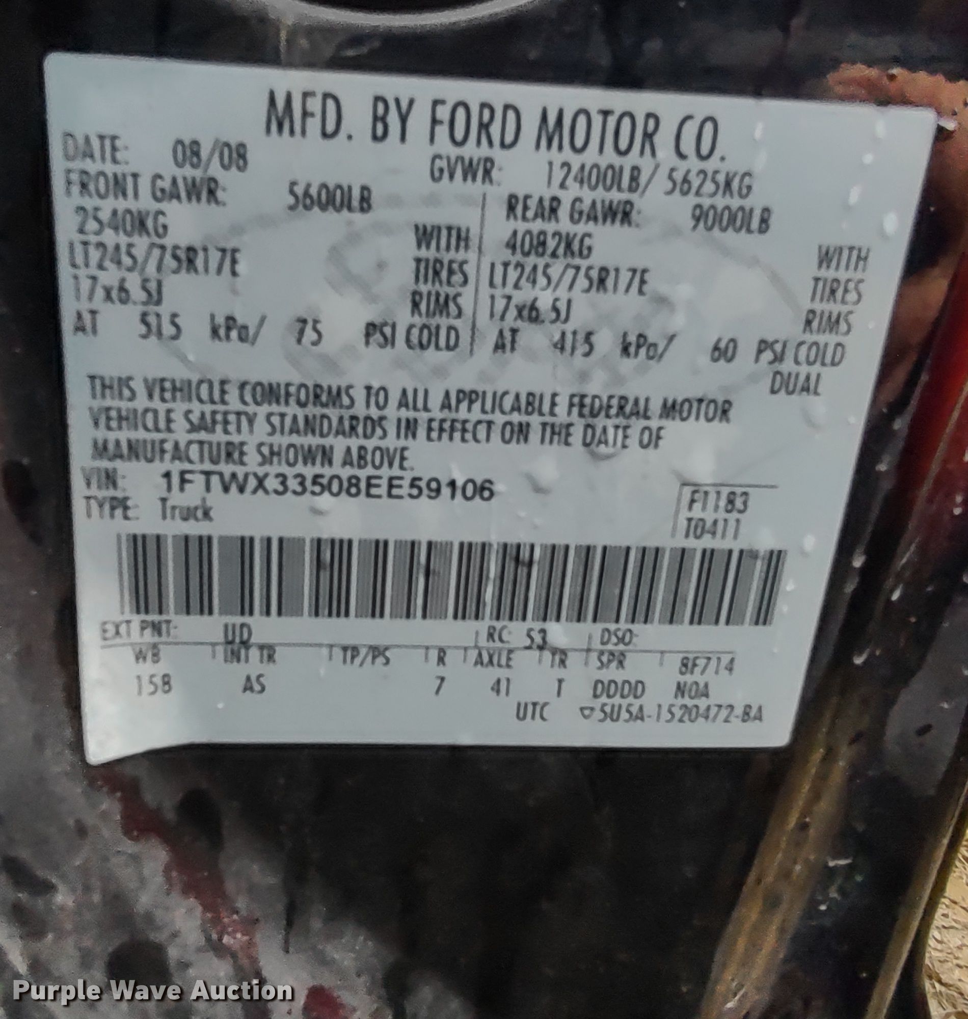 Purple Wave is selling a used 3/4 or 1 Ton Pickup or Van in Kansas. This item is a 2008 Ford F350 Super Duty pickup truck with the following: Miles: 64,441 on odometer, Hours: 3,112 on meter, VIN: 1FTWX33508EE59106, Unit #: FAC 3359