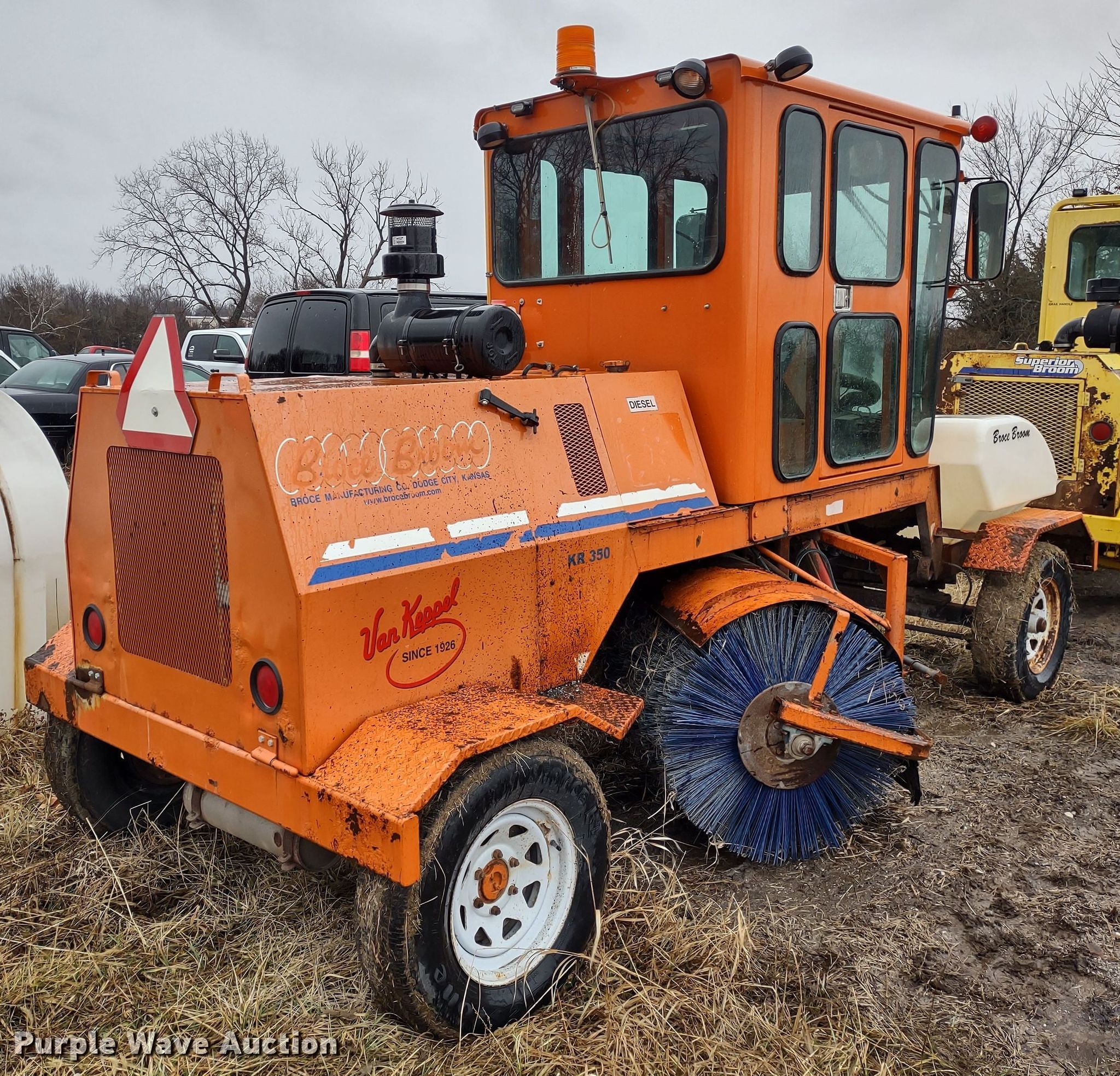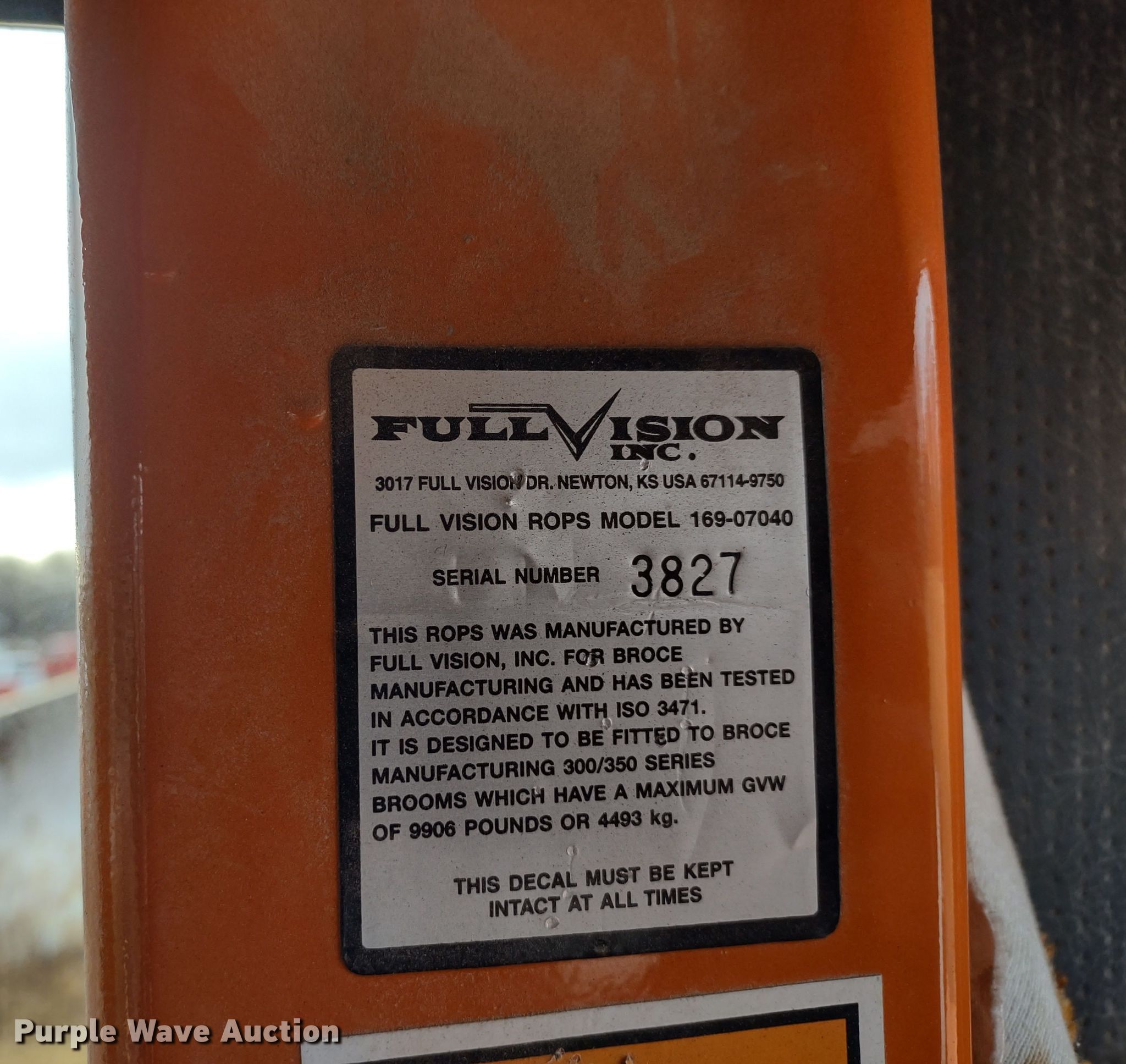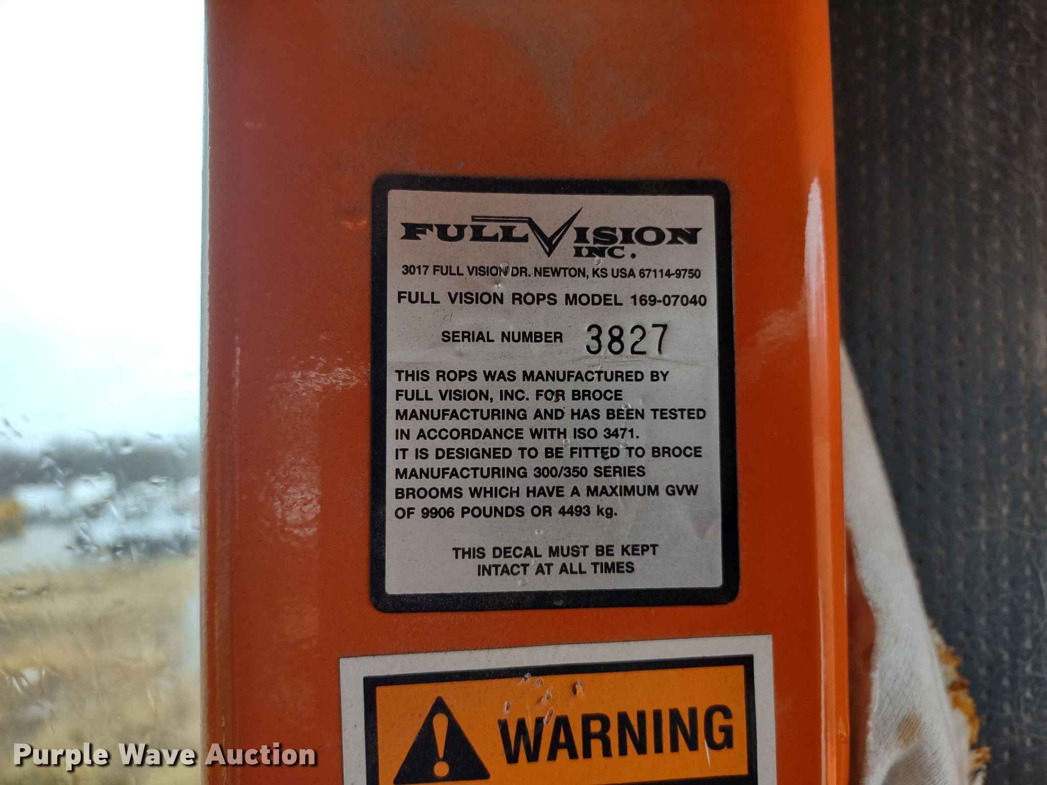 2012 Broce KR350 broom. Hours: 1,753 on meter, Serial: 407638, Unit #: PWK 5415. Engine Kubota V3600-T, Serial: BL3752, Cylinders: 4, Fuel type: Diesel. Transmission Hydrostatic. Chassis Brakes: Hydraulic. Operators station EROPS, AC, Heat. Features Broom Width: 96", Water spray system. Tires Size: 225/75R16, Brand: Firestone. Johnson County, KS. 1800 W Old 56 Hwy. Olathe, KS 66061