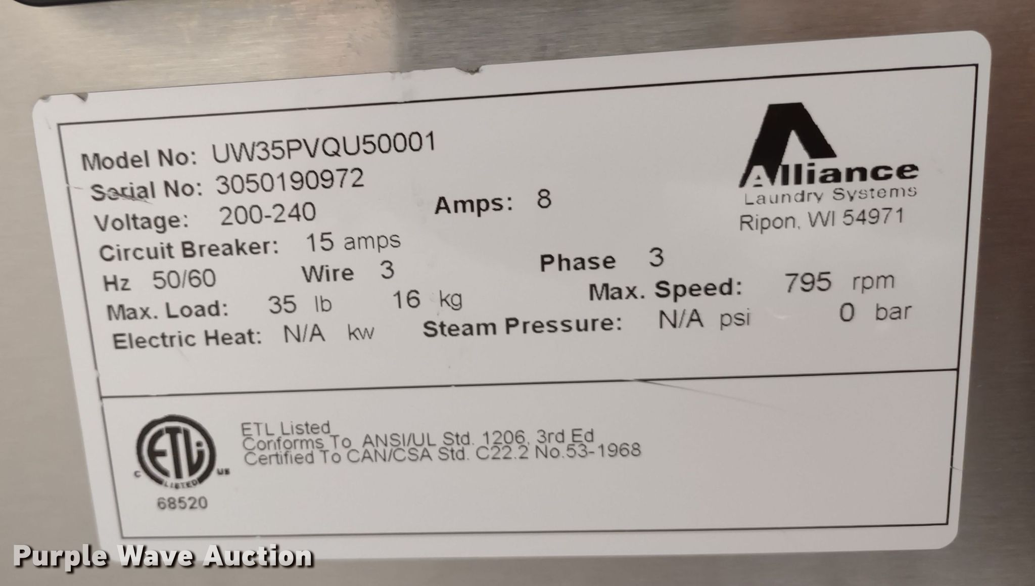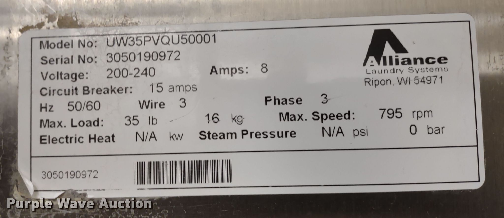 Purple Wave is selling a used Appliances in Kansas. This item is a Unimac UW35PVQU50001 washing machine with the following: Electrical will be disconnected prior to auction