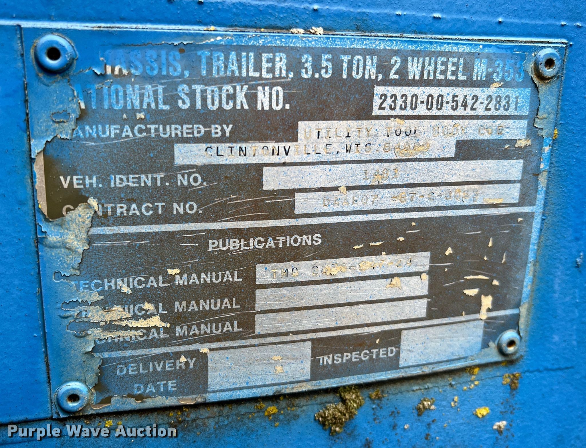 1984 Libby Corp MEP002A generator. Hours: 32 on meter, Serial: T-92-111-72. Engine Fuel type: Diesel. Features Generator kW: 5, Phase: Single, Three, Electric start. Trailer Utility Tool Body Co. M-353, 15' 7" L x 97" W, Suspension: Spring, Axles: Single, Tire size: 9.00-20. Notes Non-operational unit. Missouri municipality owned asset. No title will be provided.. Transfer of ownership documentation will be a notarized bill of sale in accordance with MSR 301.260. Bidders are responsible for verifying if this is sufficient to obtain title in their jurisdiction prior to bidding. 30870 Webb Loop. Stover, MO 65078