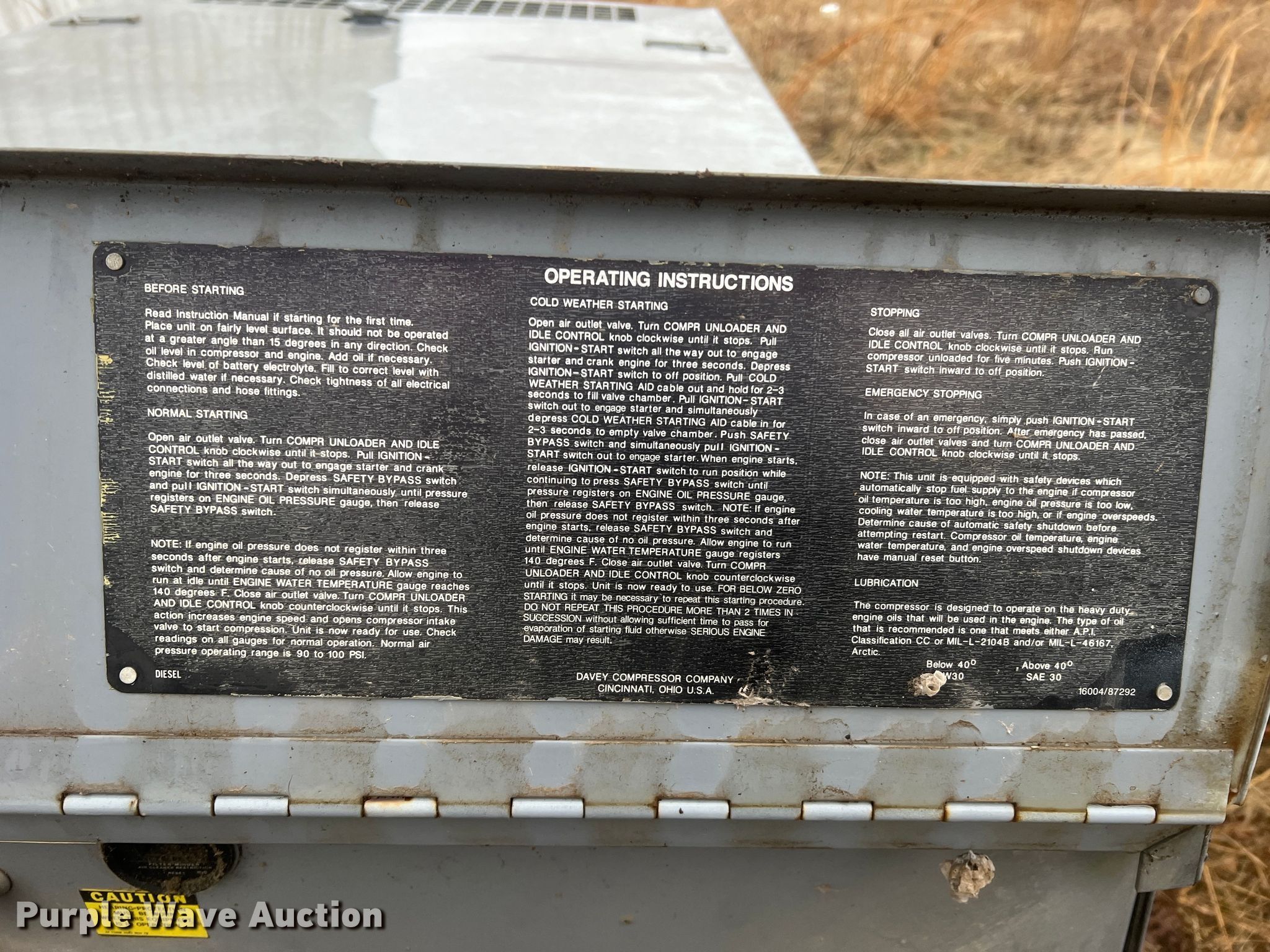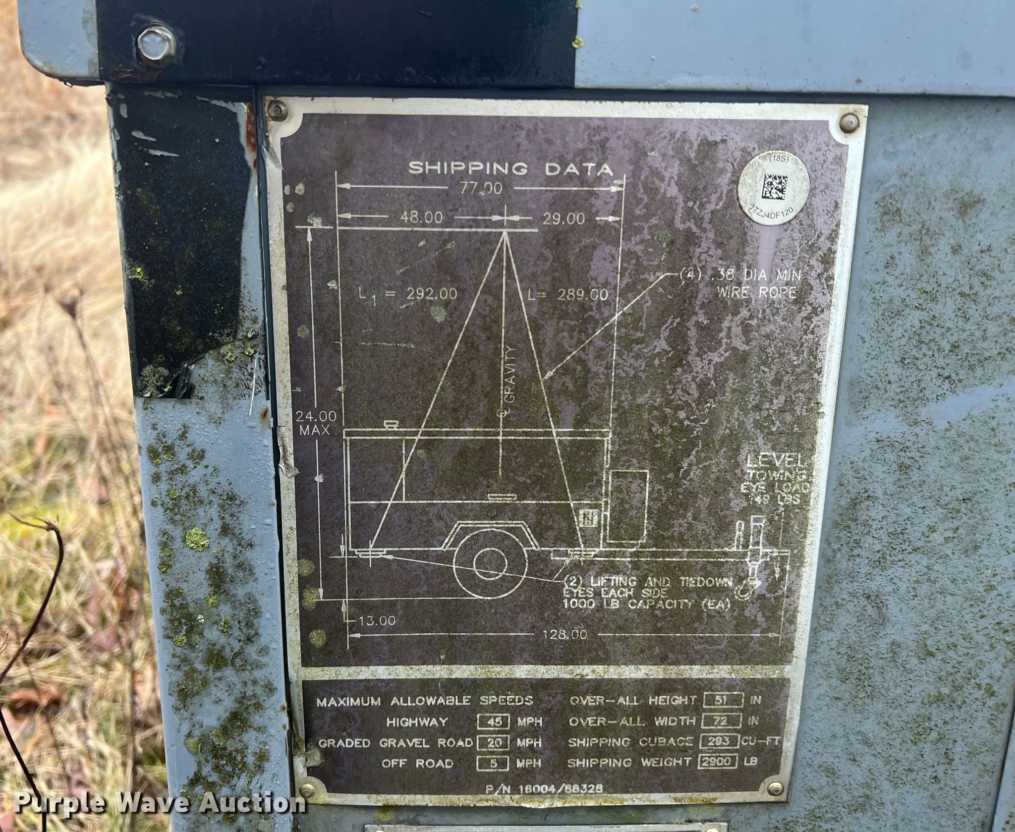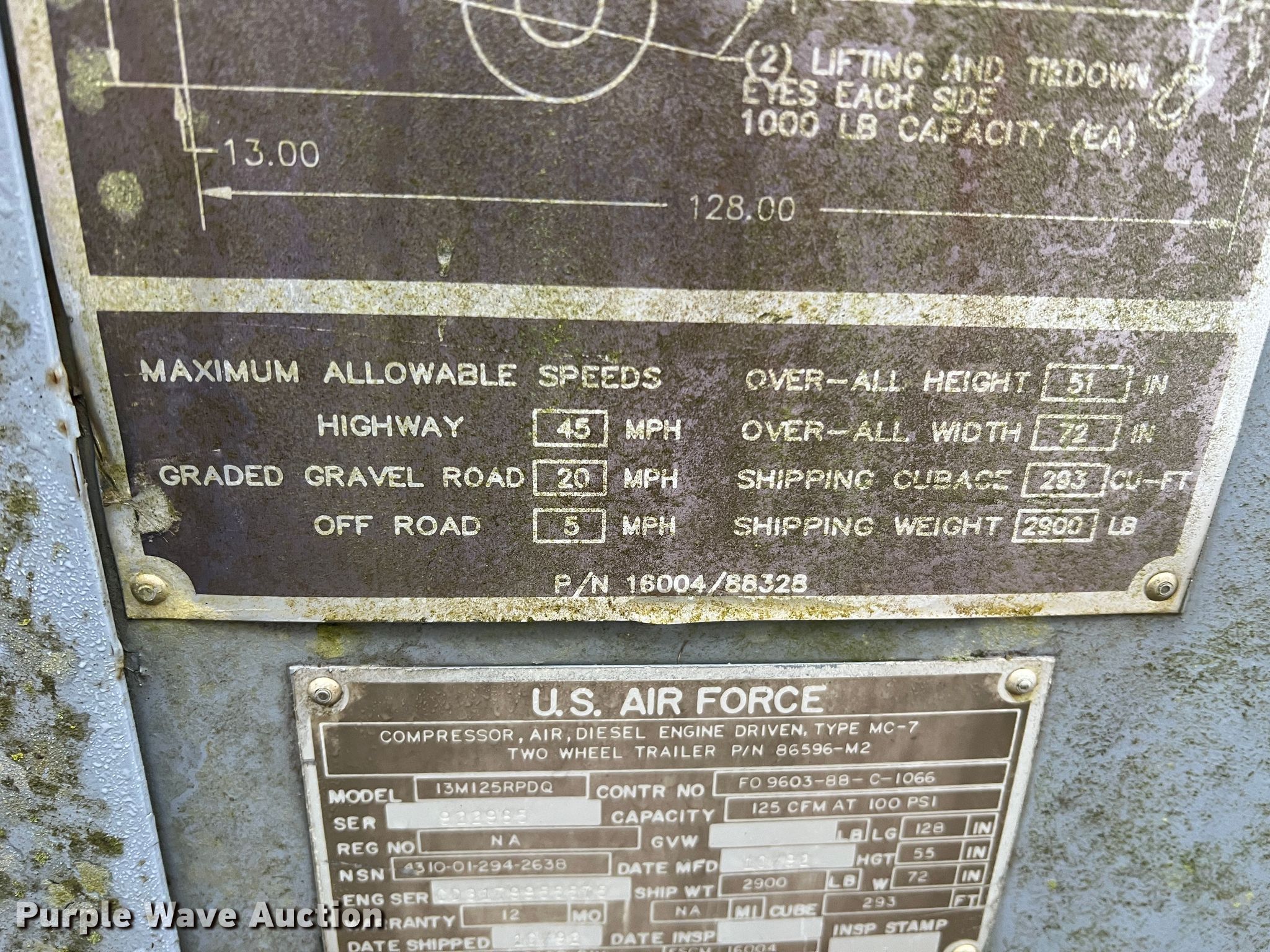 Purple Wave is selling a used Air Compressor in Missouri. This item is a 1992 US Military 13M125RPDQ air compressor with the following: Hours: 308 on meter, Serial: 922985
