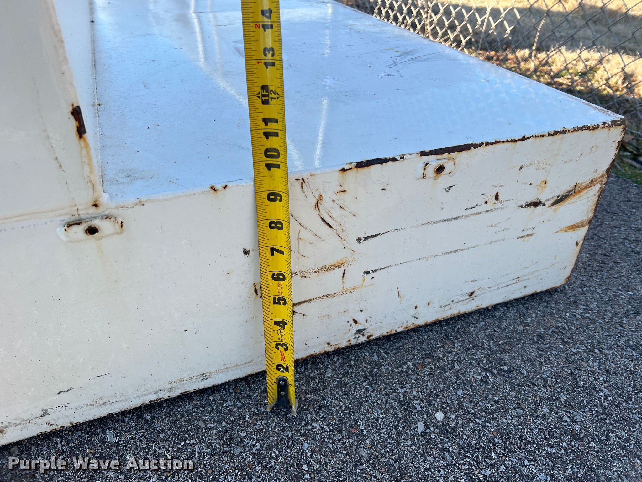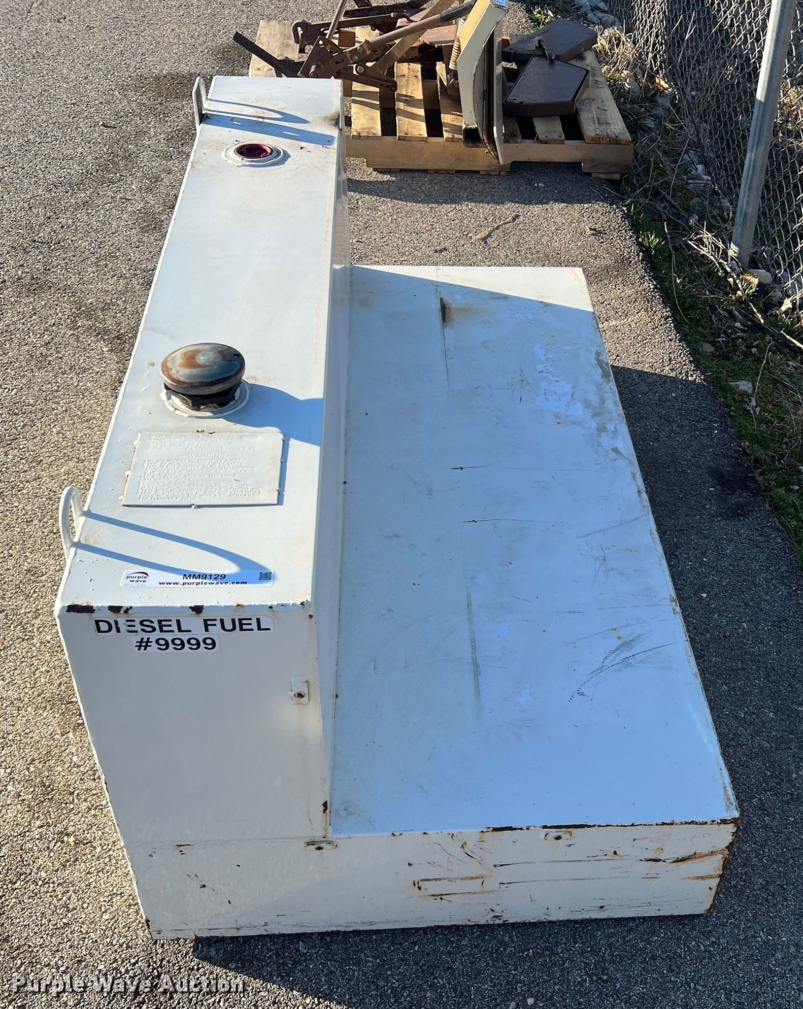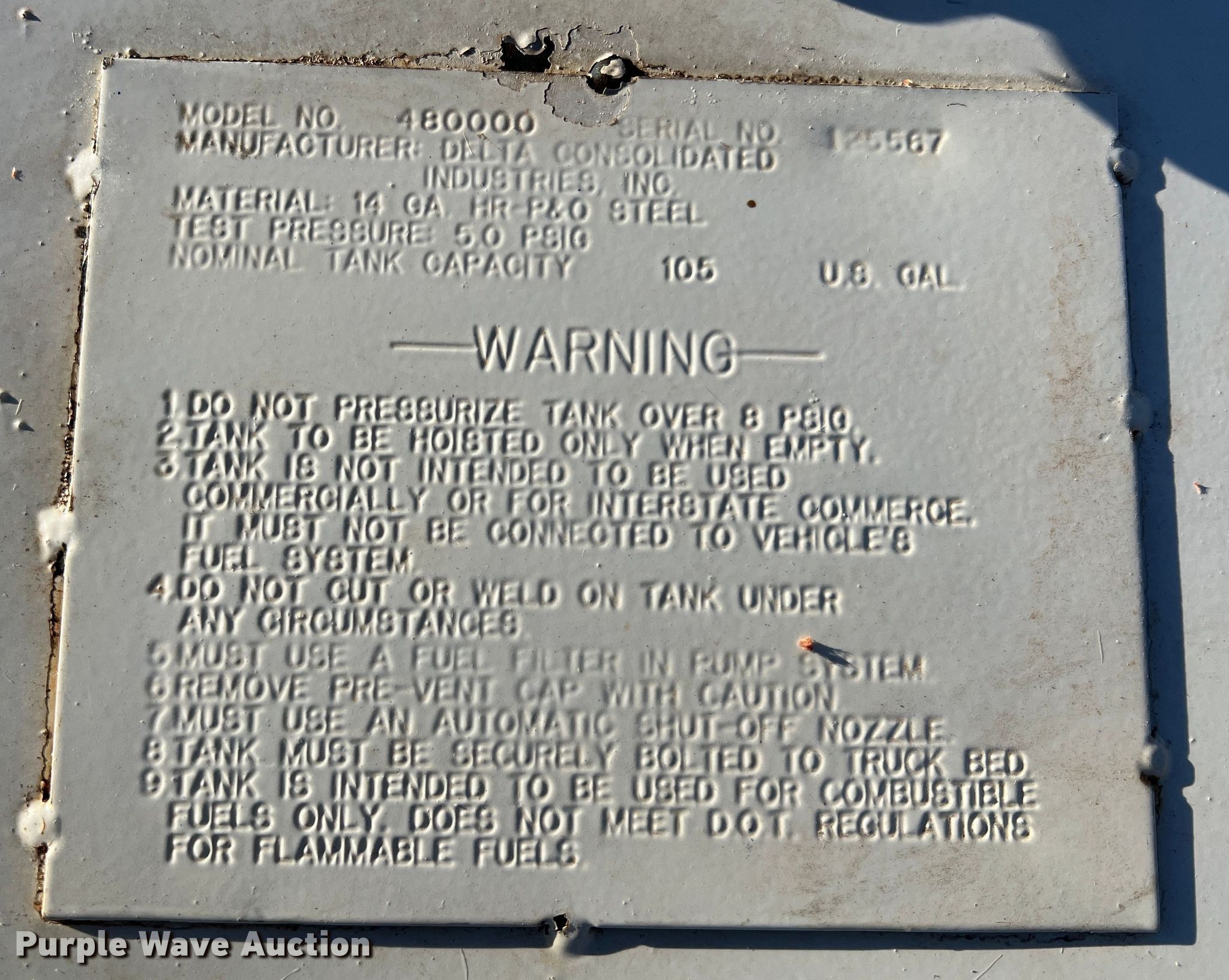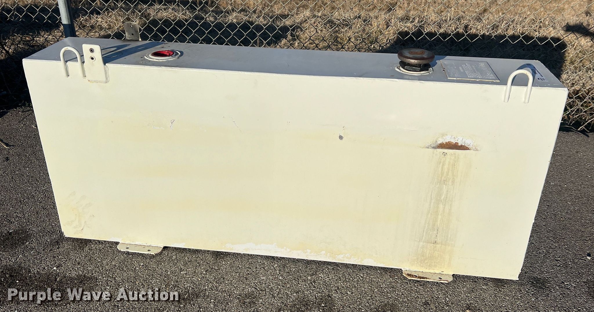 Purple Wave is selling a used Truck Part and Attach. in Missouri. This item is a Delta 480000 fuel transfer tank with the following: Serial: 125567, Capacity: 105 gallons, 31" L x 59.5" W x 26" H