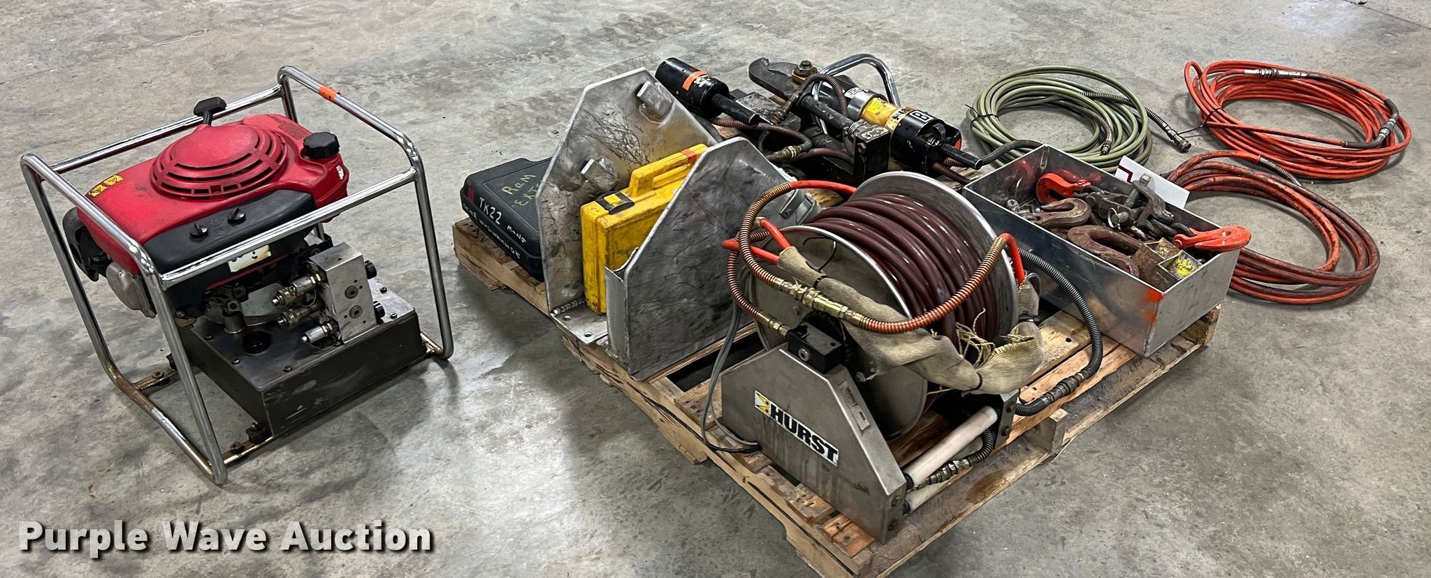 Purple Wave is selling a used Tools in Missouri. This item is a Rescue equipment with the following: Honda 4.8 dual port power unit, 100' hose reel, Electric rewind, Hydraulic lines, Hurst Gold cutter, Hurst Ram, 22", Hurst Spreader, 32", Hurst Ram, 18", Ram shoe kit, Ram extension kit, Chains