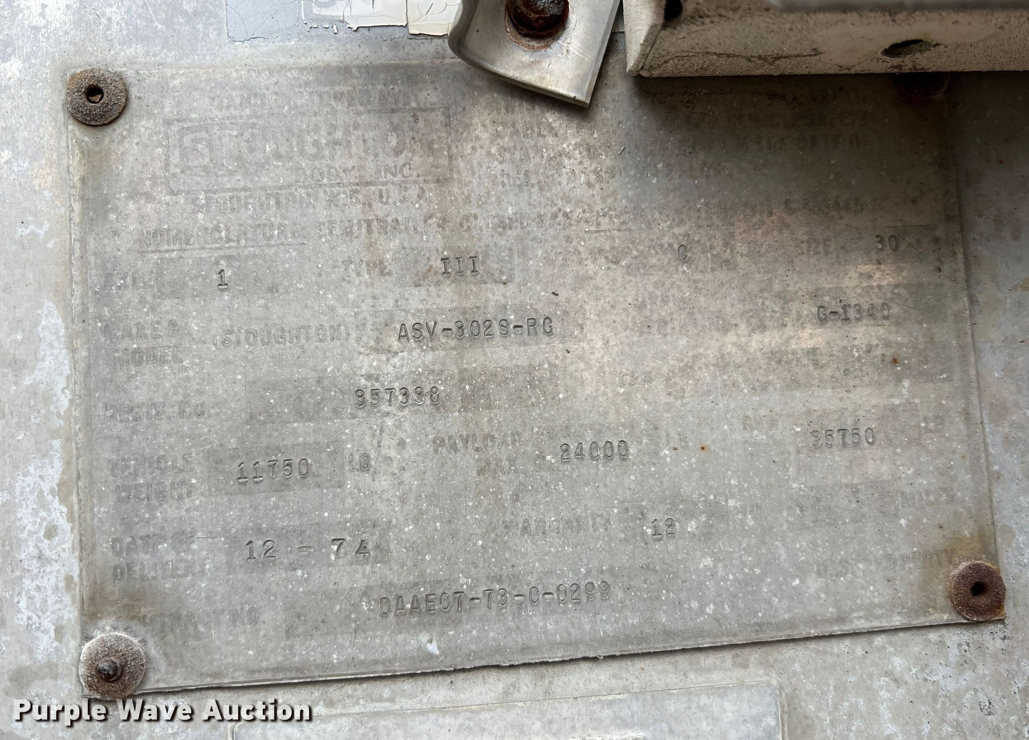 Purple Wave is selling a used Refrigerated Van Trailer in Missouri. This item is a 1974 Stoughton ASV-302S-RG refrigerated van trailer with the following: VIN: DAAE07-73-C-0299