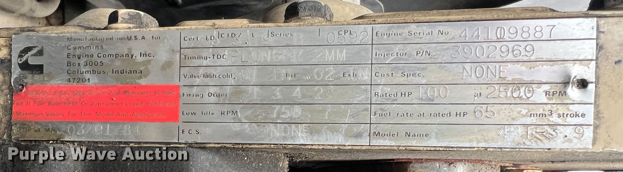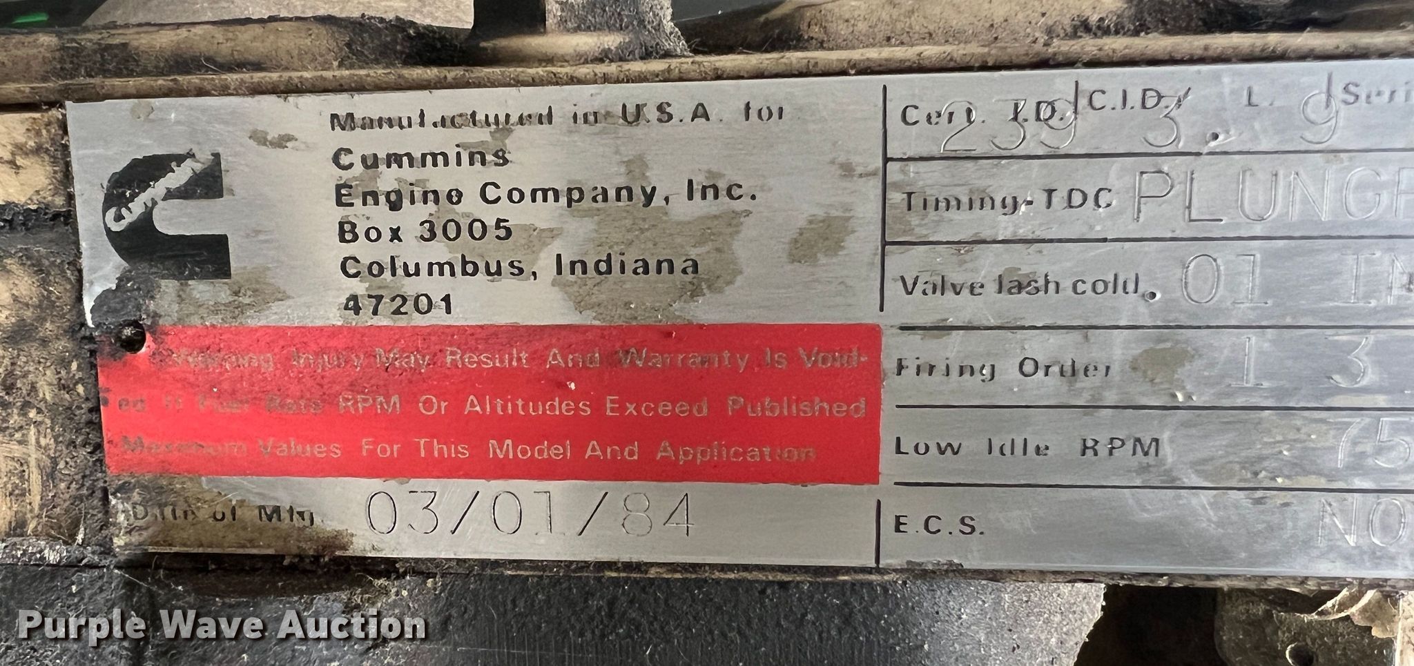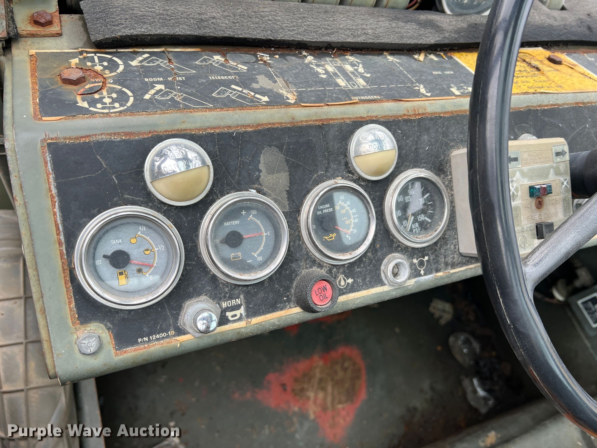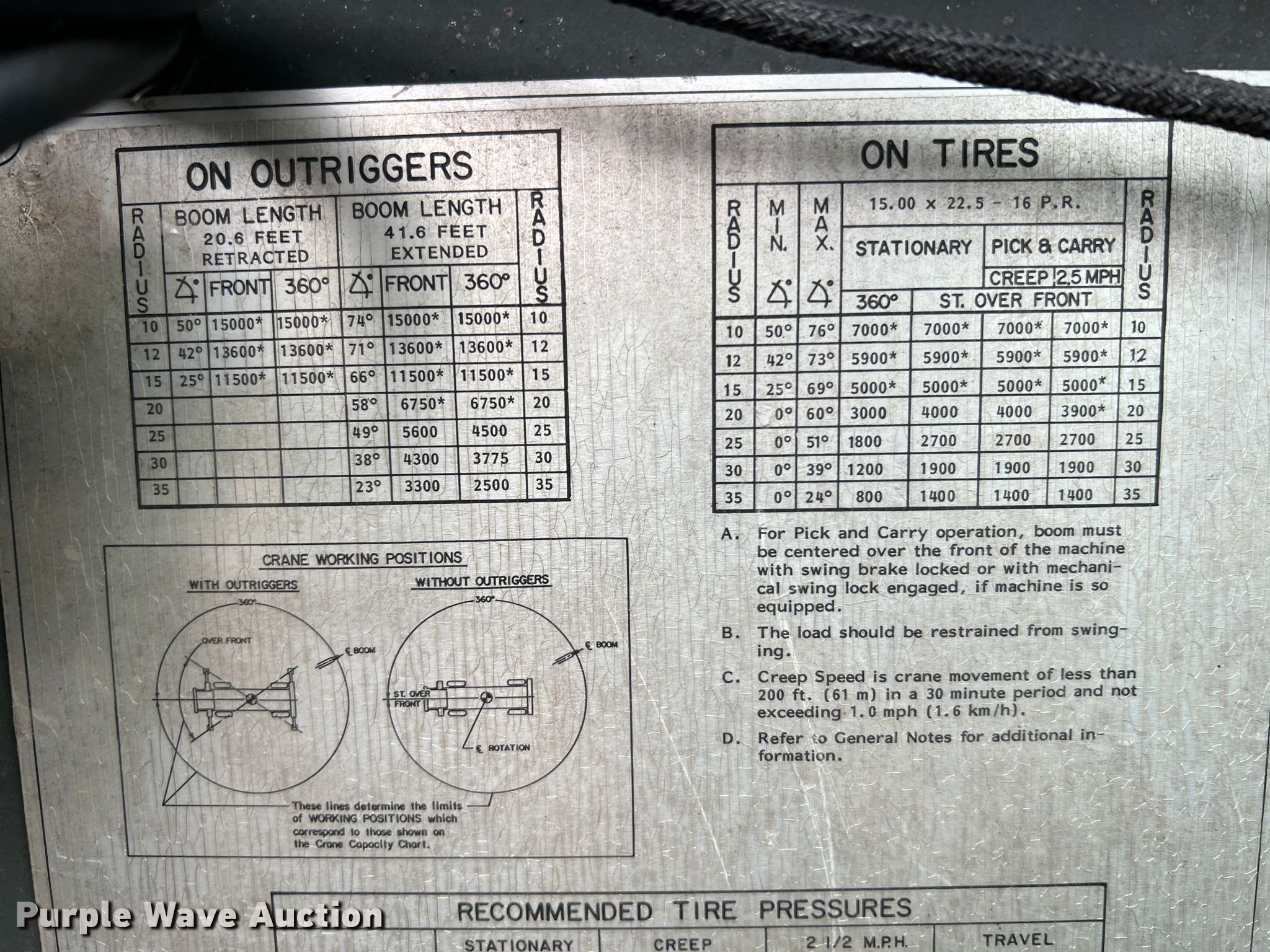 1984 Lorain LRT-100 crane. Hours: 831 on meter, Serial: 97114. Engine Cummins 4BT-3.9, Serial: 44109887, Displacement: 3.9L, Cylinders: 4, Fuel type: Diesel. Transmission 3F - 3R. Chassis Axles: Single, Brakes: Air. Operators station Enclosed cab, Crane controls: Joysticks. Features Boom Telescopic, Sections: 3, Maximum lift capacity: 15,000 lbs, Maximum lift height: 41.6', Stabilizers: 4, Boom controls In-cab, Winches: 1, Crane block Sheaves: 1, Lift chart. Tires Size: 15-22.5. Notes Non-operational parking brake. Transfer of ownership documentation will be a bill of sale. City of Jefferson, MO. 935 Ellis Boulevard. Jefferson City, MO 65101