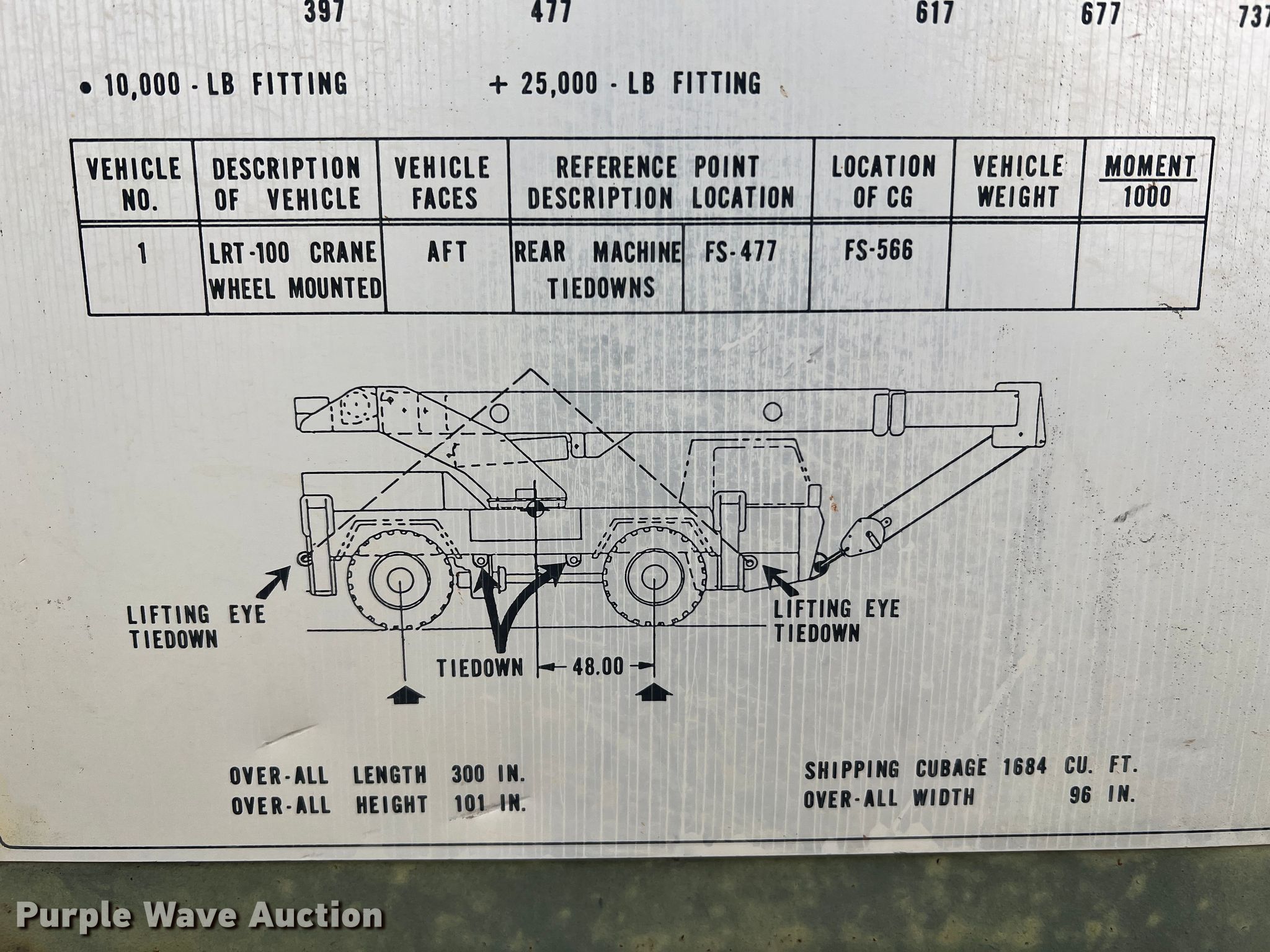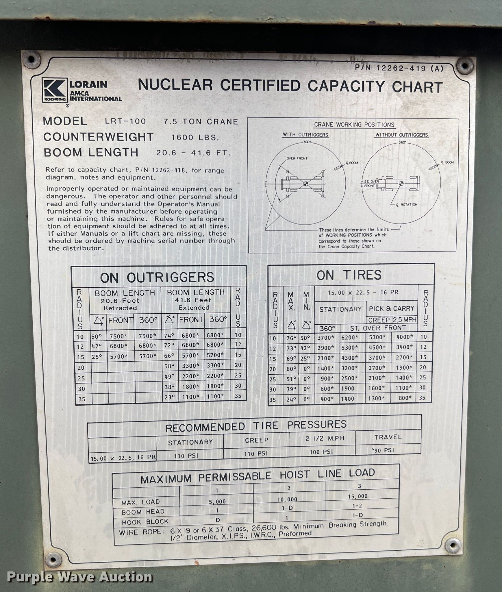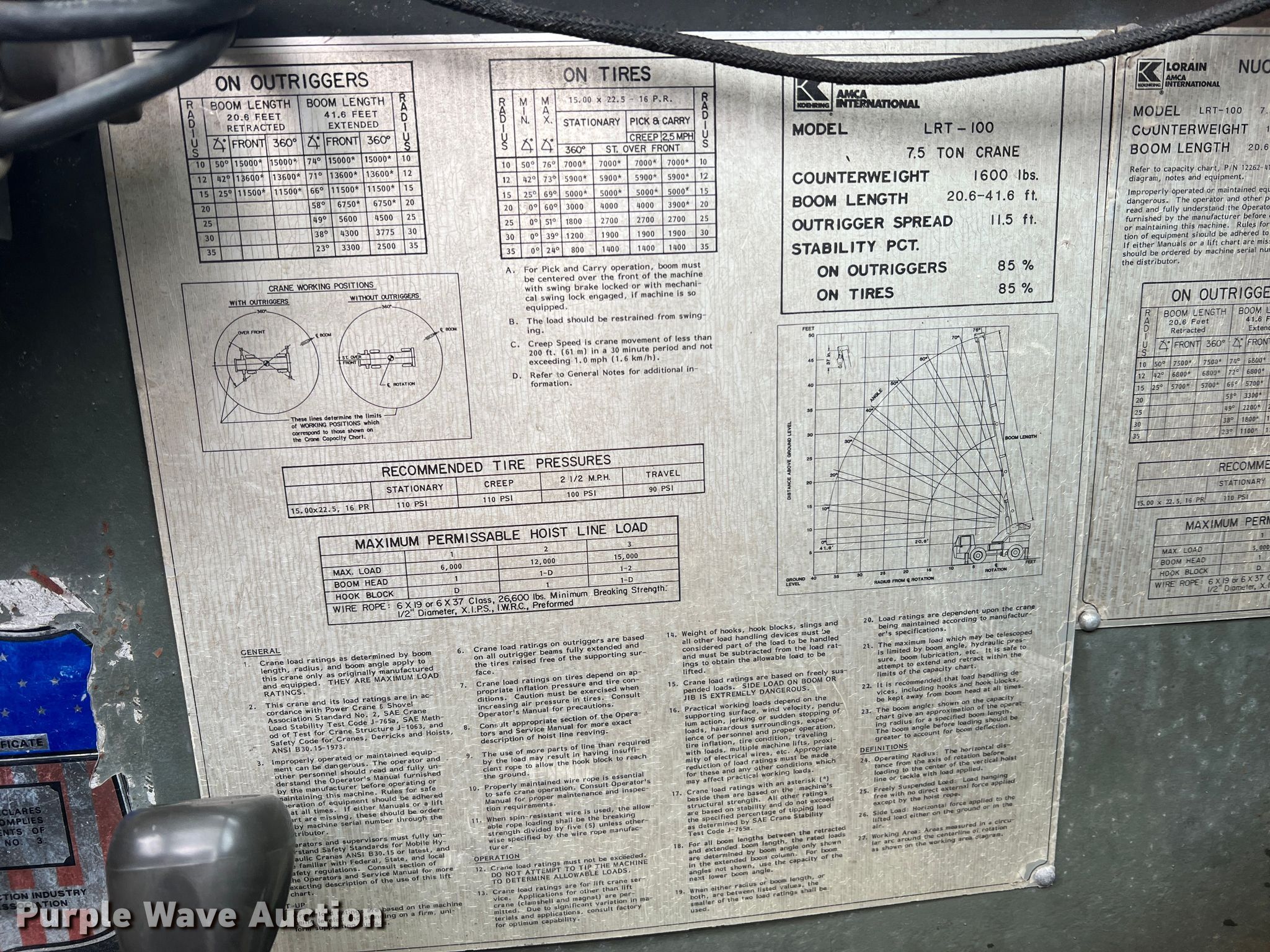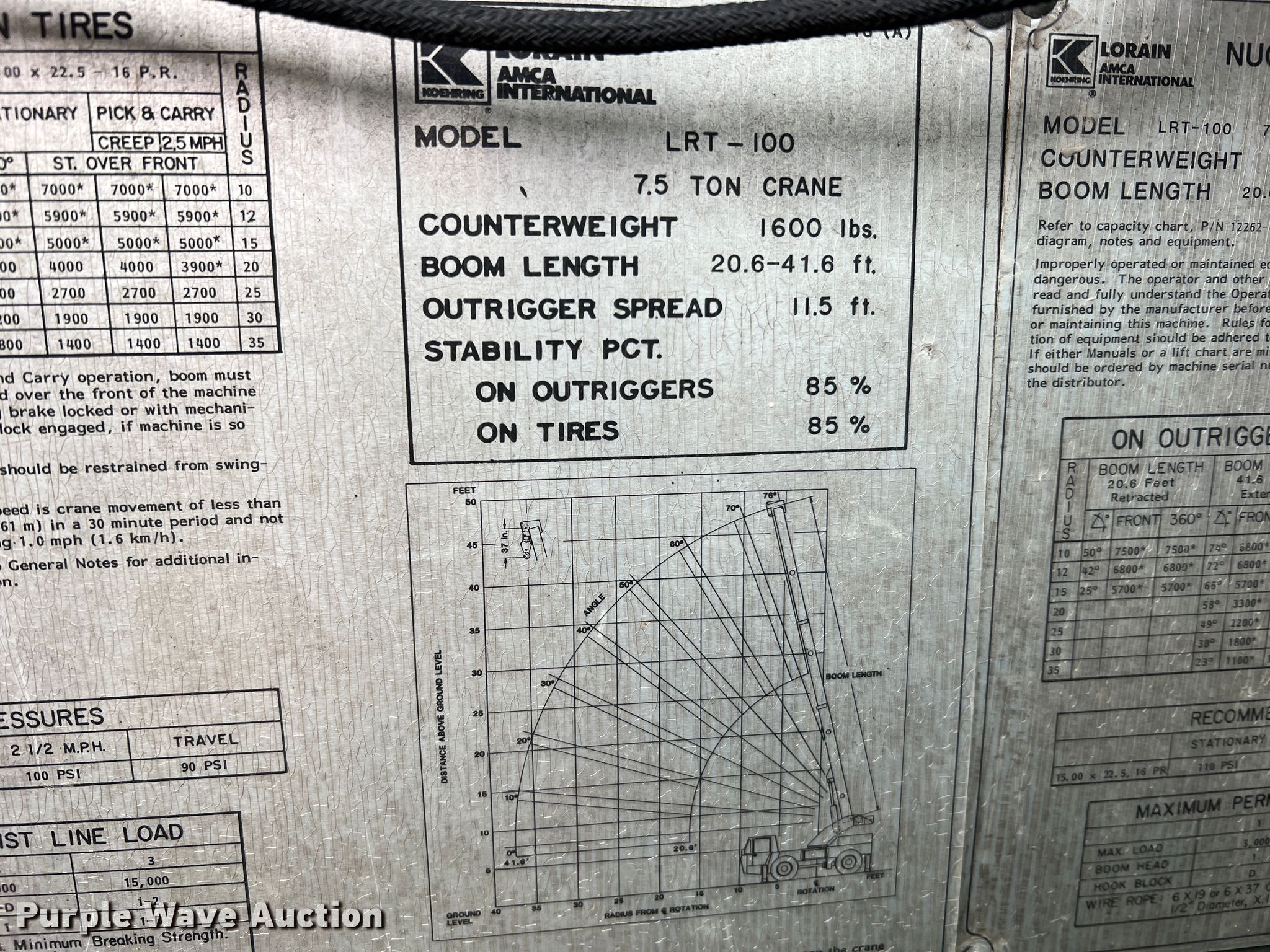 Purple Wave is selling a used Truck Crane in Missouri. This item is a 1984 Lorain LRT-100 crane with the following: Hours: 831 on meter, Serial: 97114