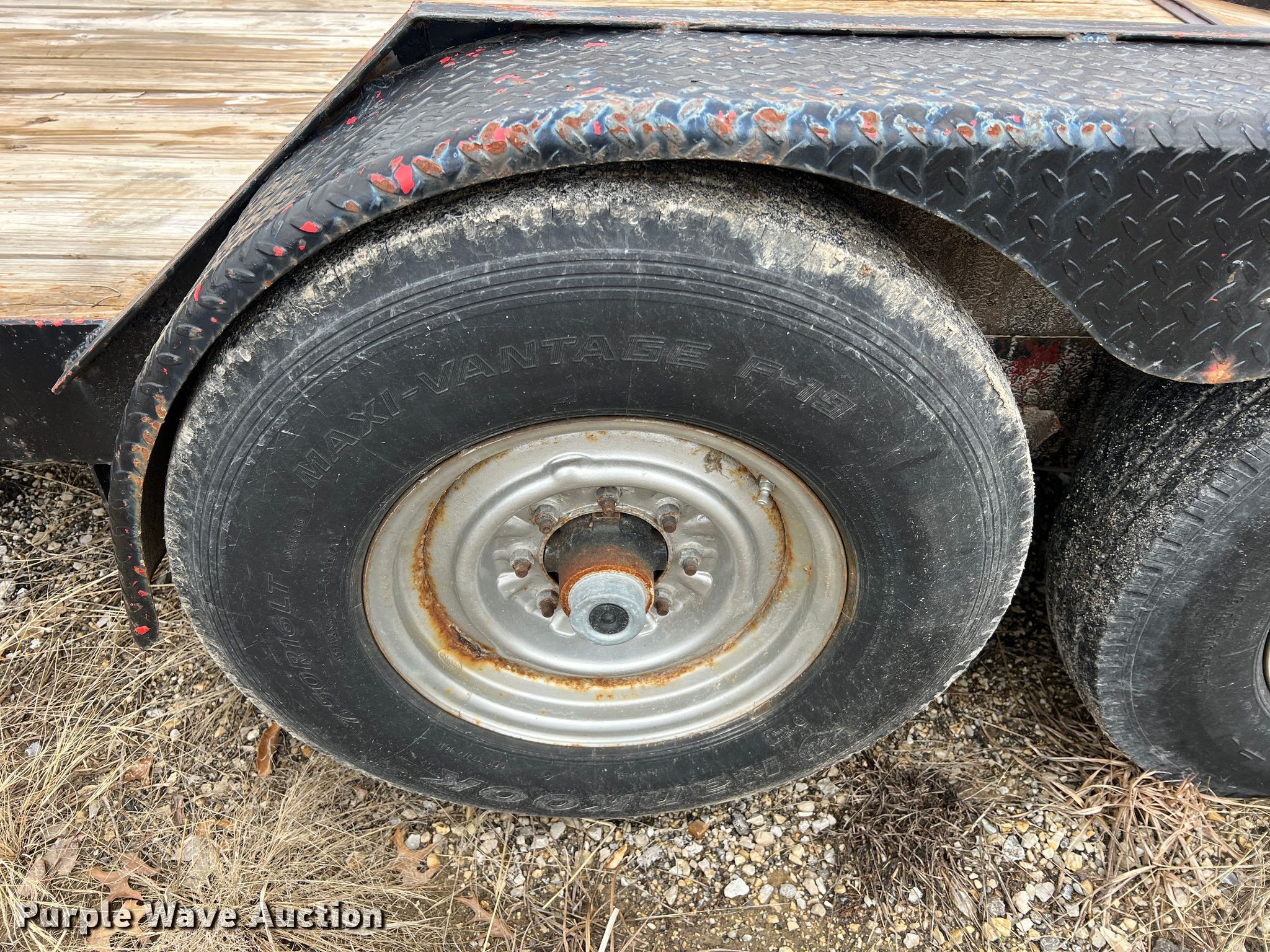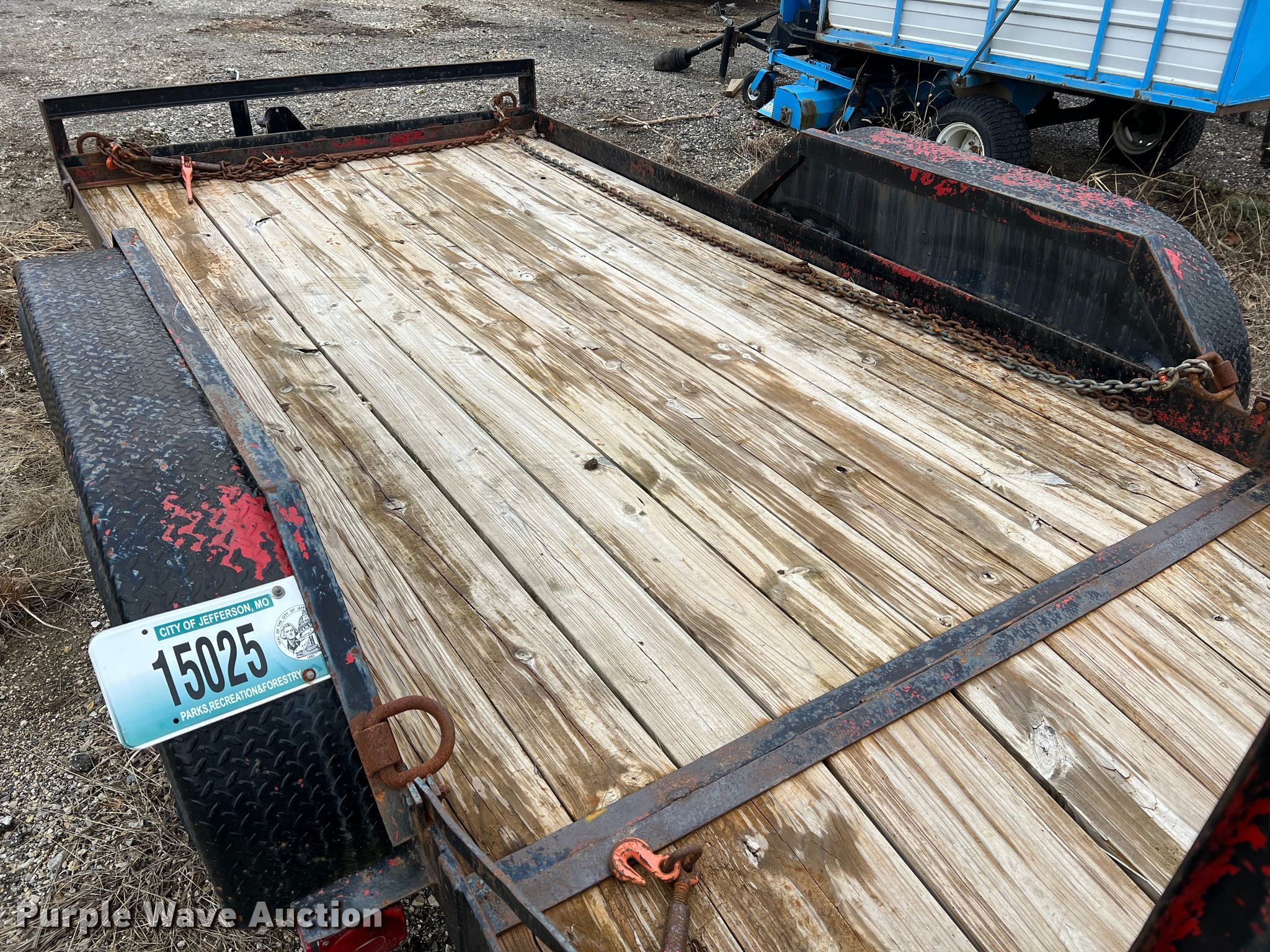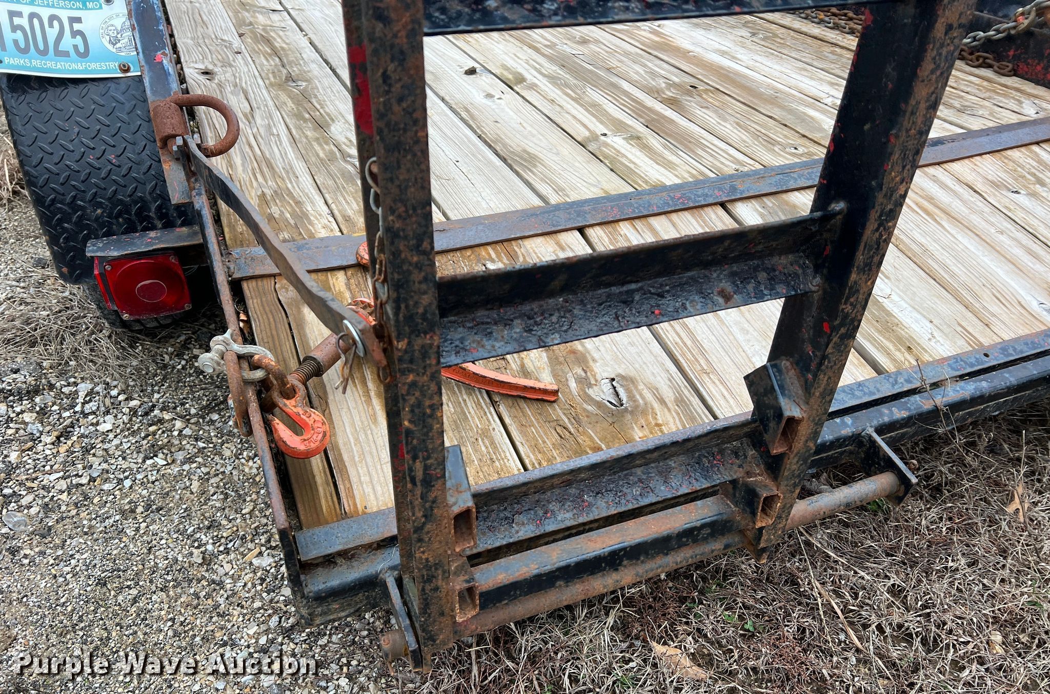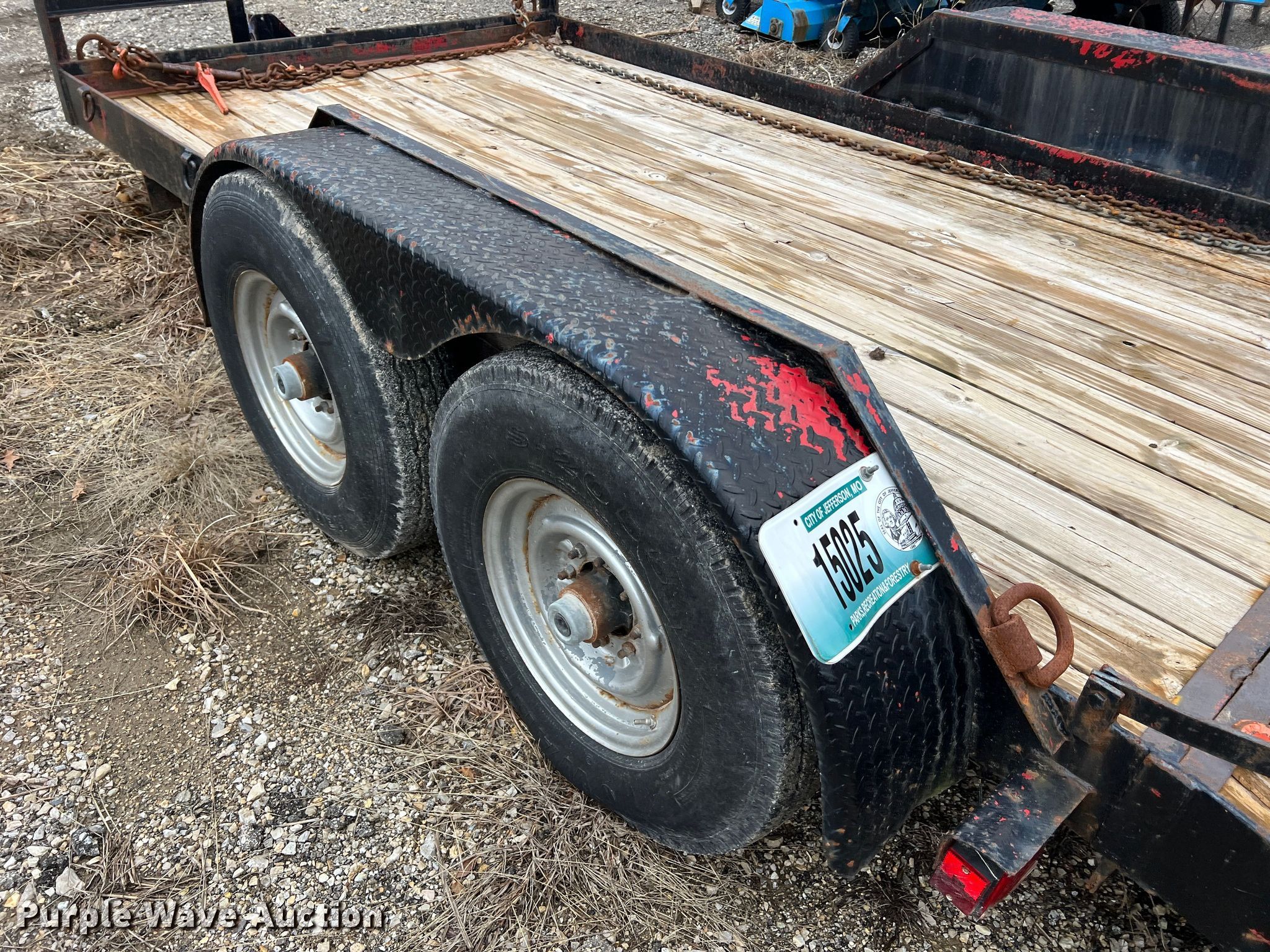 Equipment trailer. VIN: 15025. Dimensions Overall: 19' 6" L x 101" W, Deck: 14' 1" L x 80.5" W, Tail length: 22.5", Ramps: Manual Length: 60". Features Deck type: Wood. Chassis Hitch: Pintle, Landing gear: Single, Suspension: Spring, Brakes: Electric, Axles: Tandem. Tires Steel wheels, Size: 7.50R16LT. Notes Chains not included, Binders not included. Missouri municipality owned asset. No title will be provided.. Transfer of ownership documentation will be a notarized bill of sale in accordance with MSR 301.260. Bidders are responsible for verifying if this is sufficient to obtain title in their jurisdiction prior to bidding. City of Jefferson, MO. 935 Ellis Boulevard. Jefferson City, MO 65101