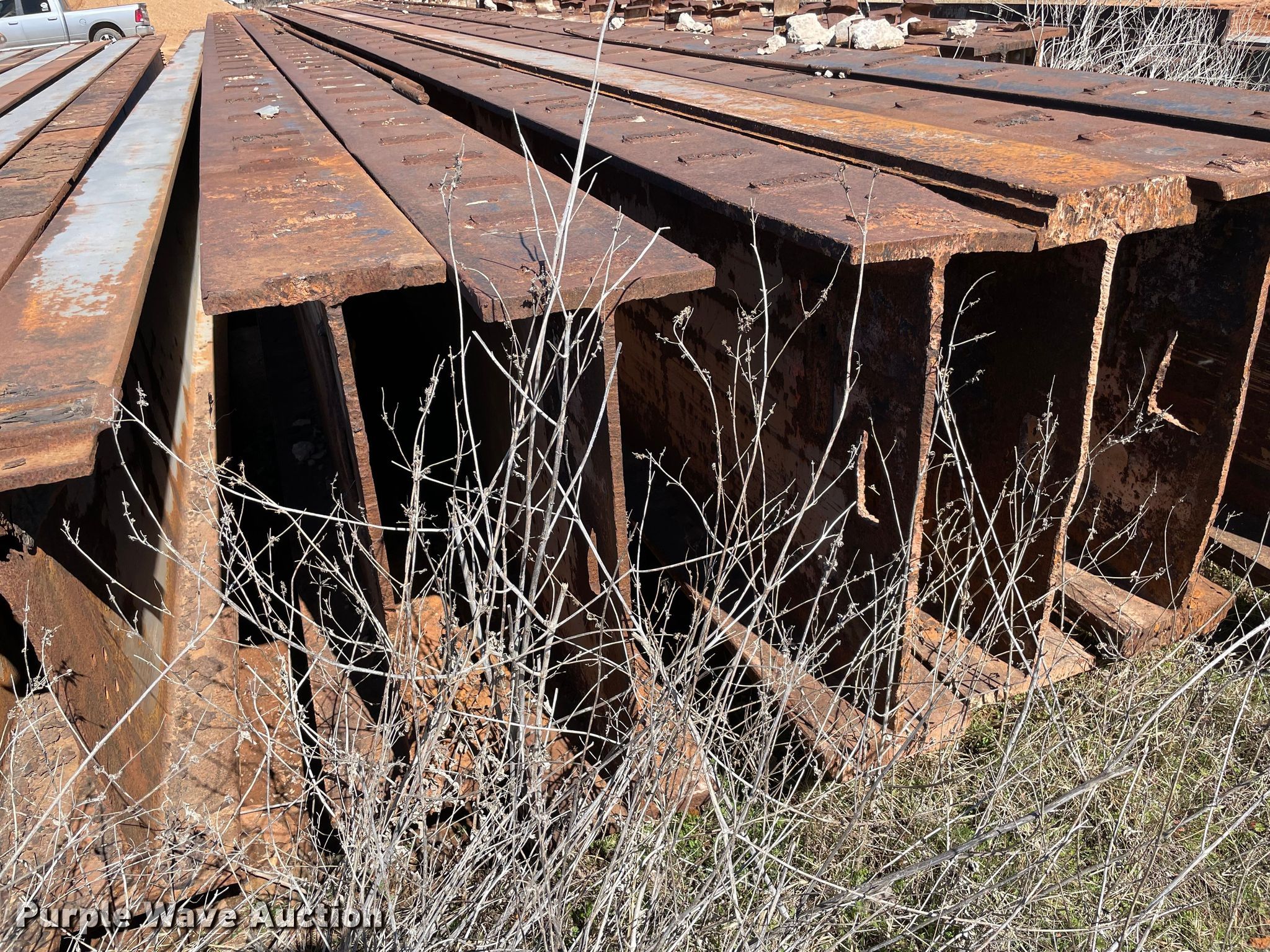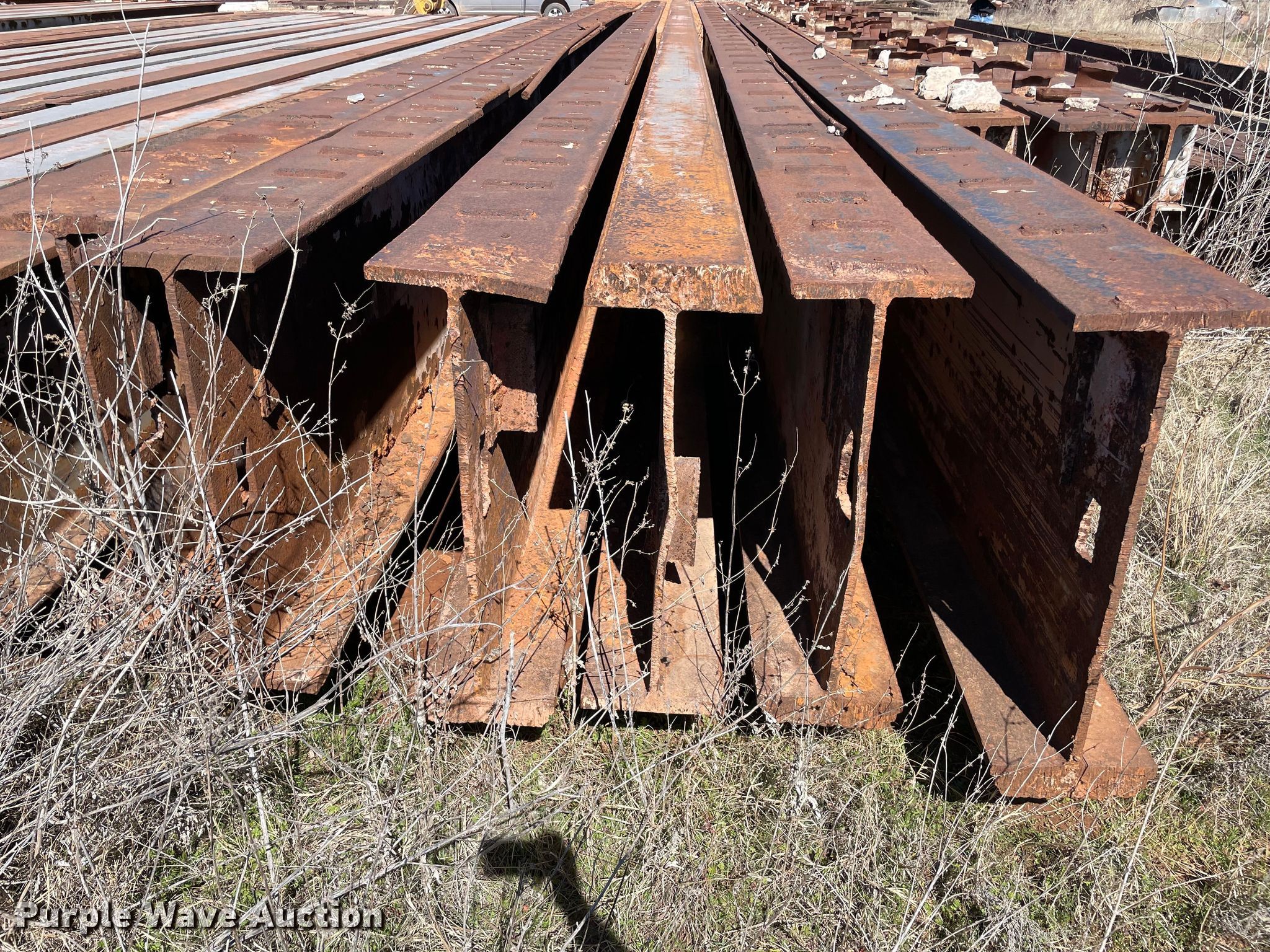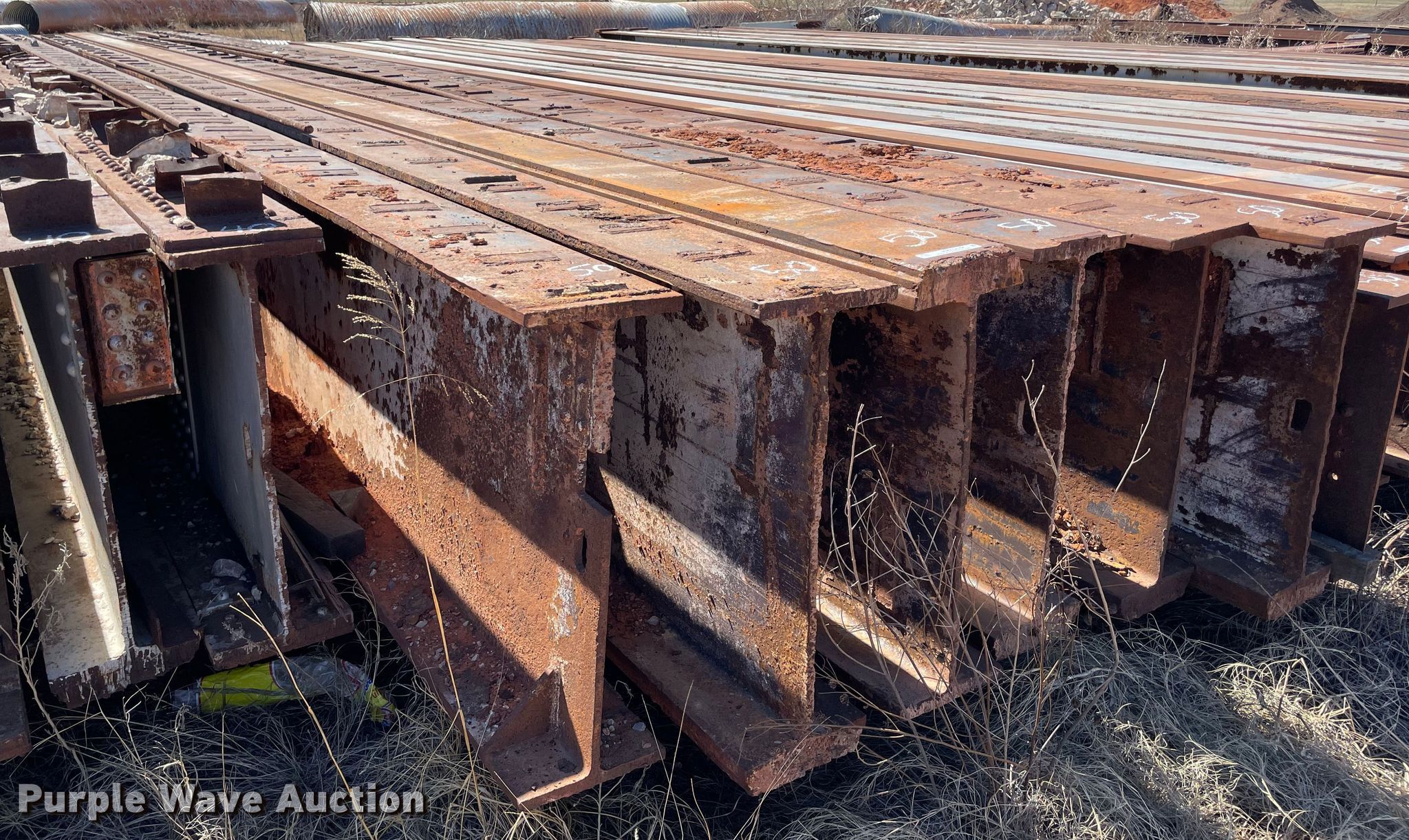 Purple Wave is selling a used Building Materials in Oklahoma. This item is a (6) steel I-beams with the following: 50' L x 12" W x 36" H, Flange thickness: 1", Web thickness: 5/8"