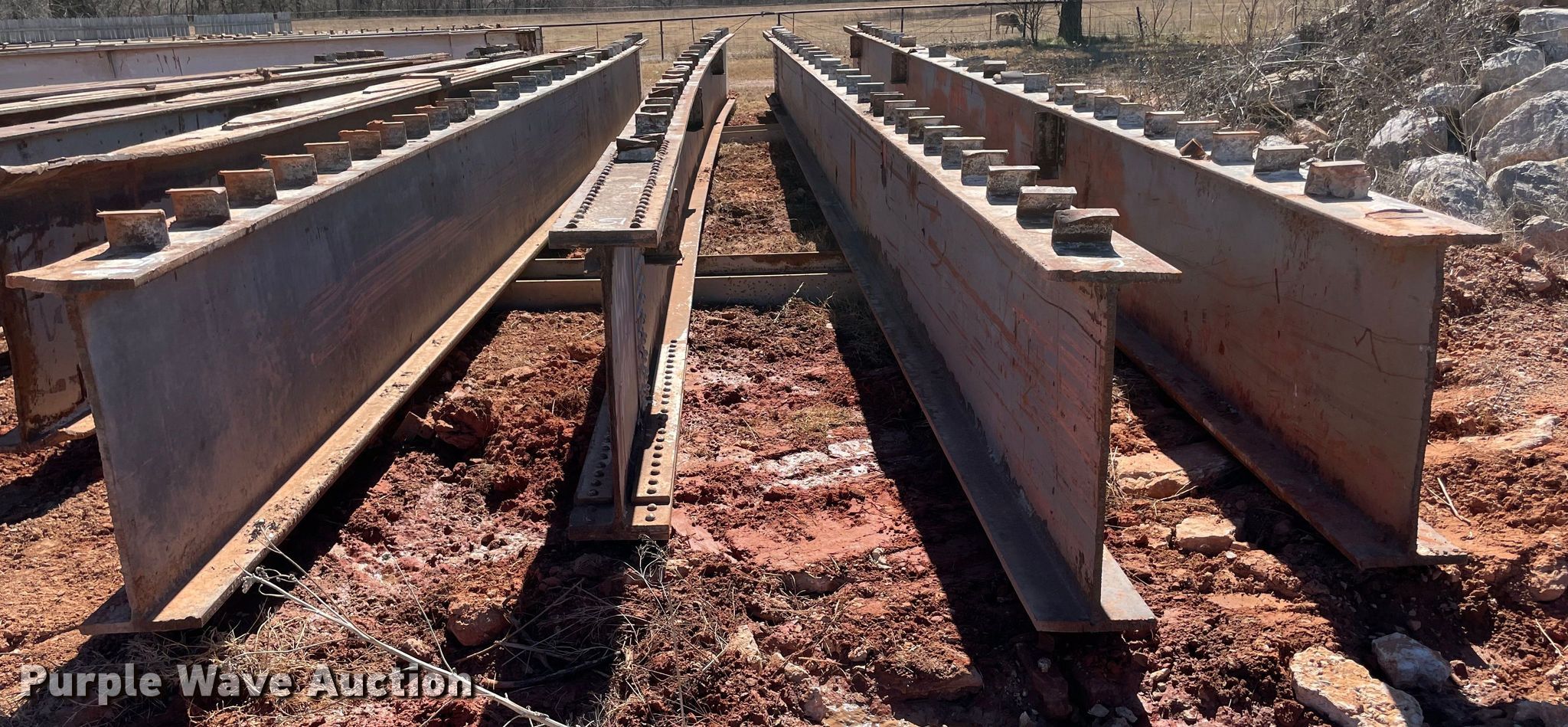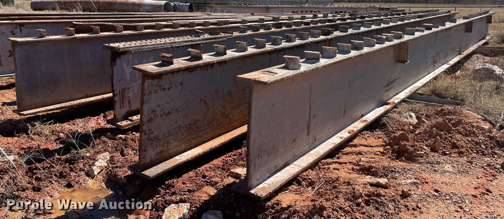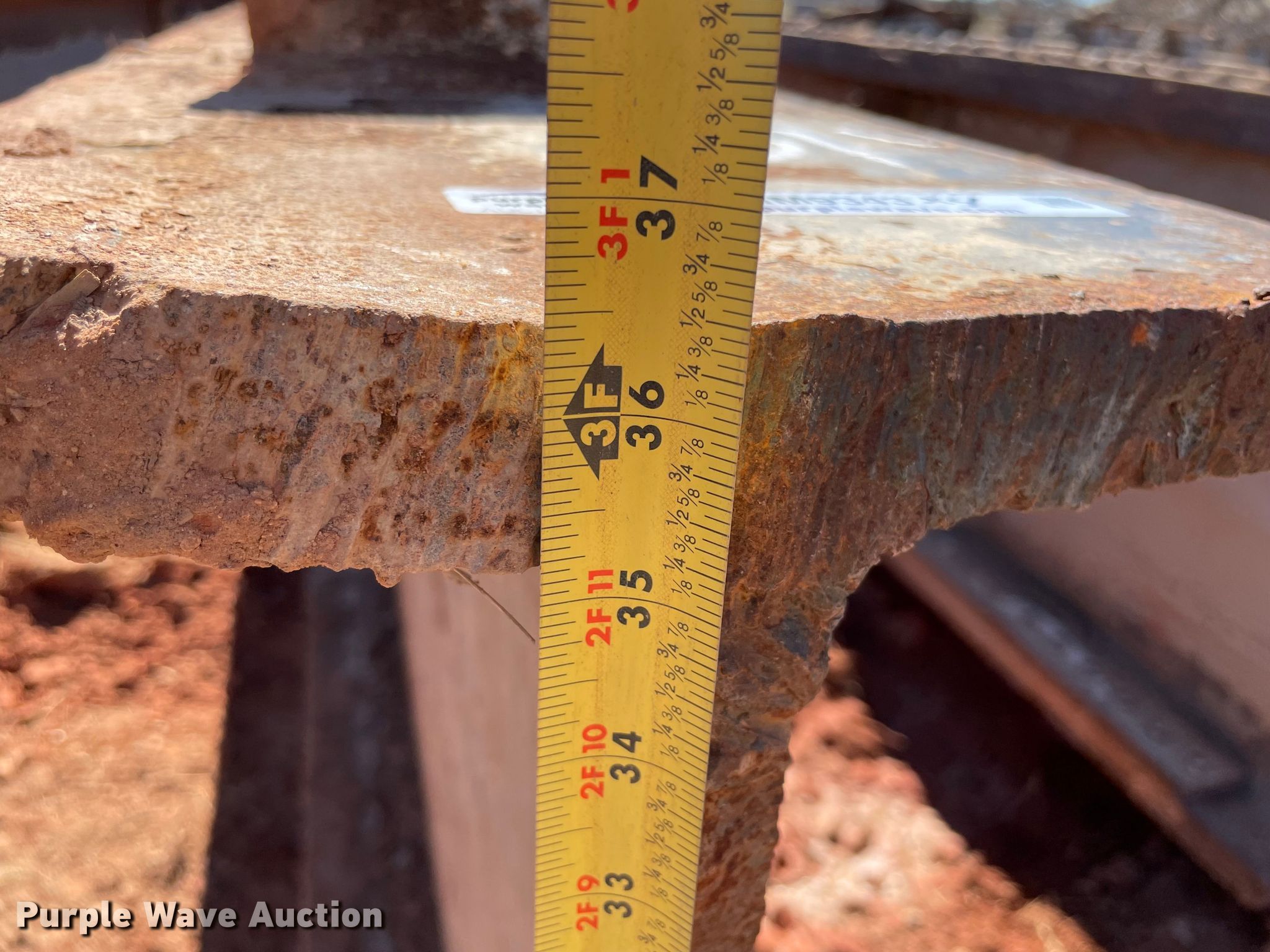 Purple Wave is selling a used Building Materials in Oklahoma. This item is a (4) steel I-beams with the following: 51' L x 12" W x 36" H, Flange thickness: 1 1/8", Web thickness: 7/8"