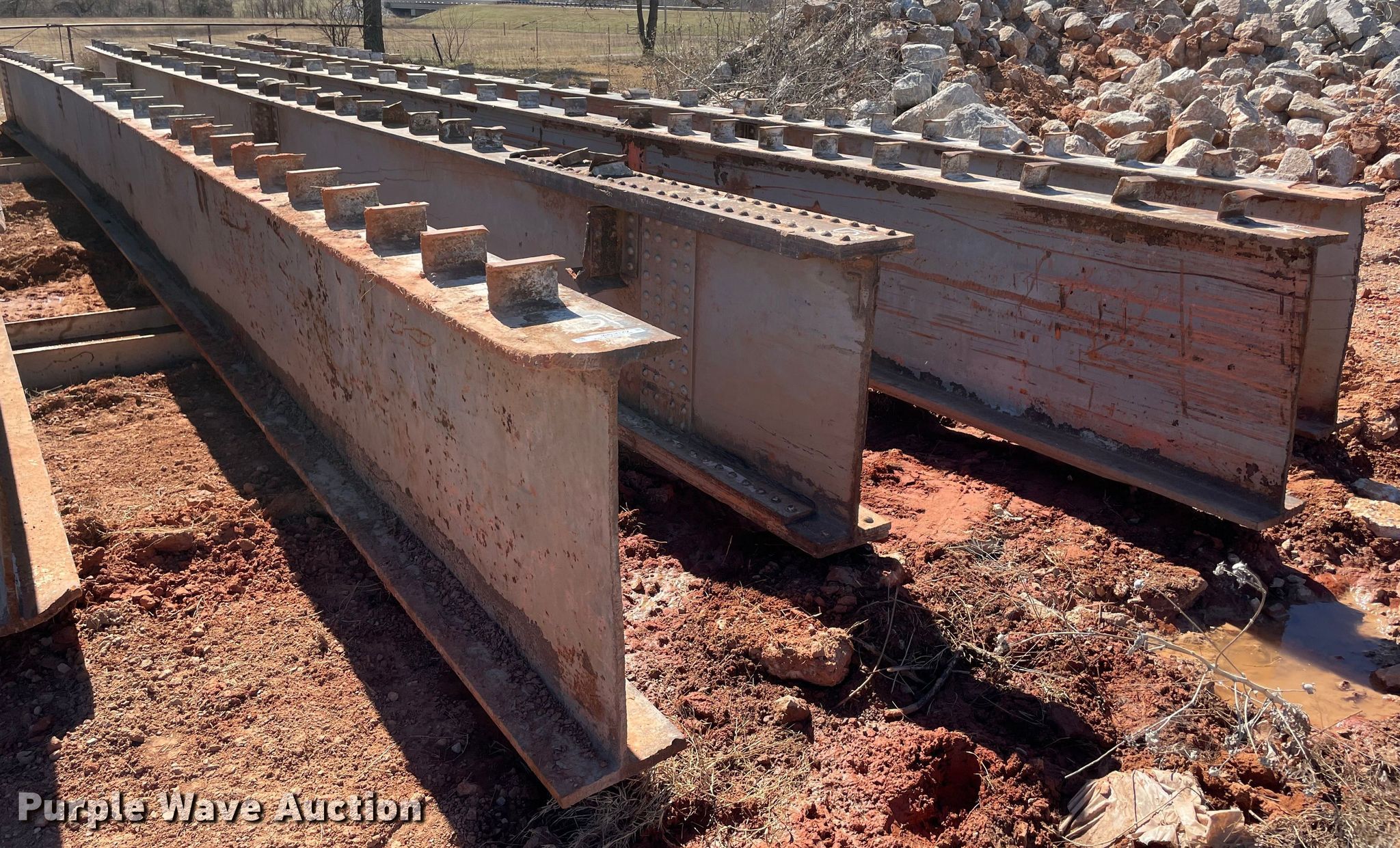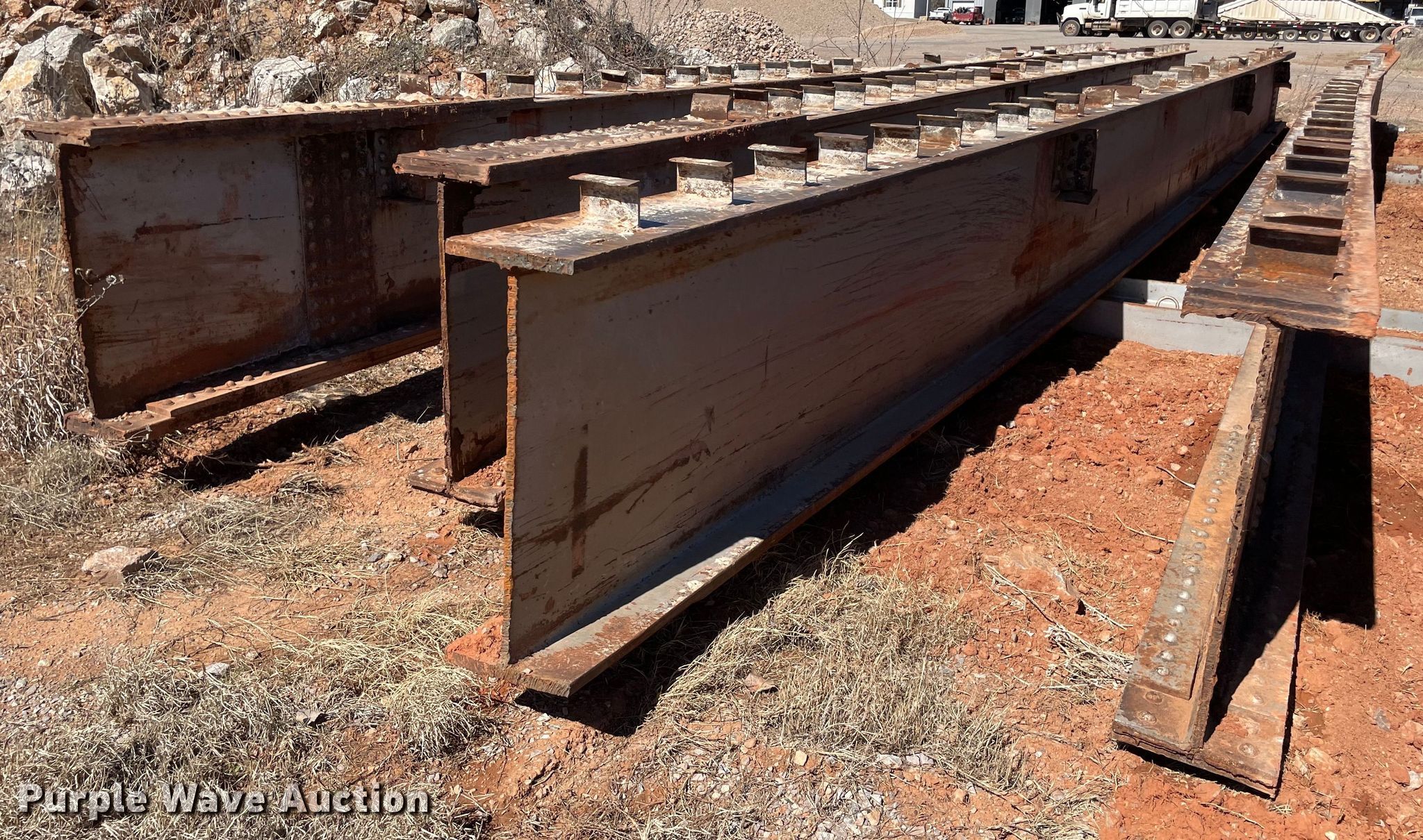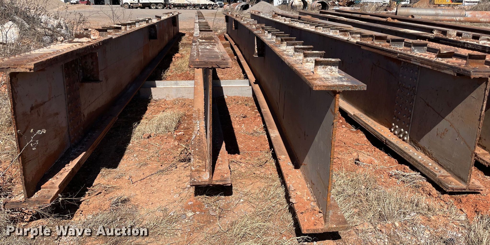 Purple Wave is selling a used Building Materials in Oklahoma. This item is a (4) steel I-beams with the following: 51' L x 12" W x 36" H, Flange thickness: 1 1/8", Web thickness: 7/8"