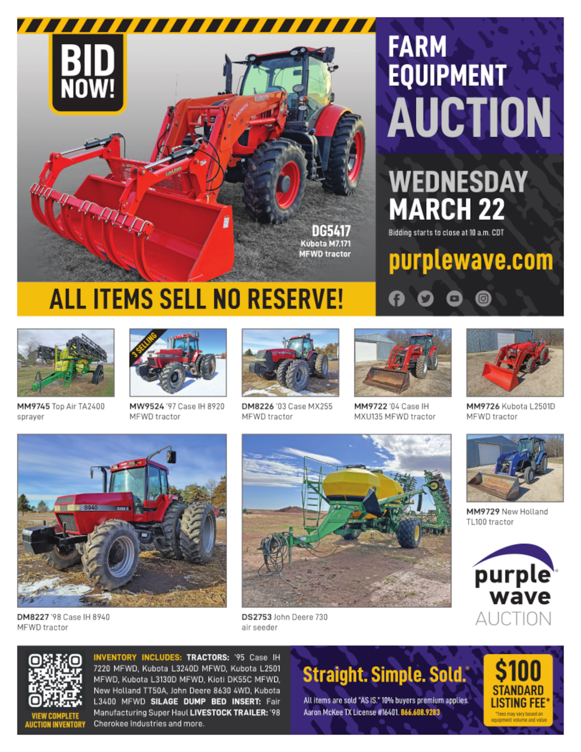 This auction is conducted by Purple Wave, Inc., whose home office is 825 Levee Drive, Manhattan, Kansas. Aaron McKee, Texas auctioneer license # 16401, operates Purple Wave, Inc. Complaints against us may be directed to the Texas Department of Licensing and Regulation, P.O. Box 12157, Austin, Texas 78711, (512) 463-6599. For additional required information, see the attached document.