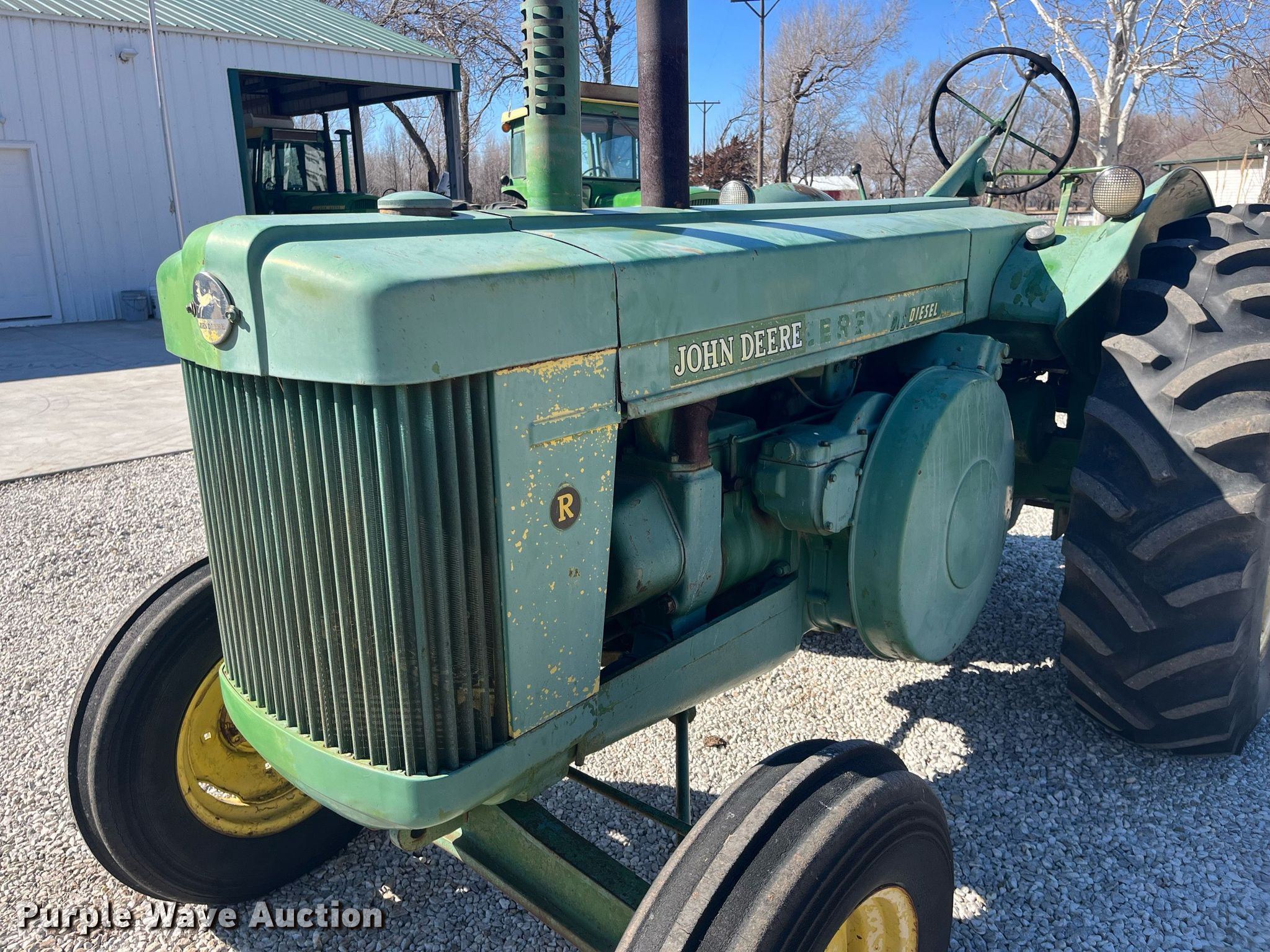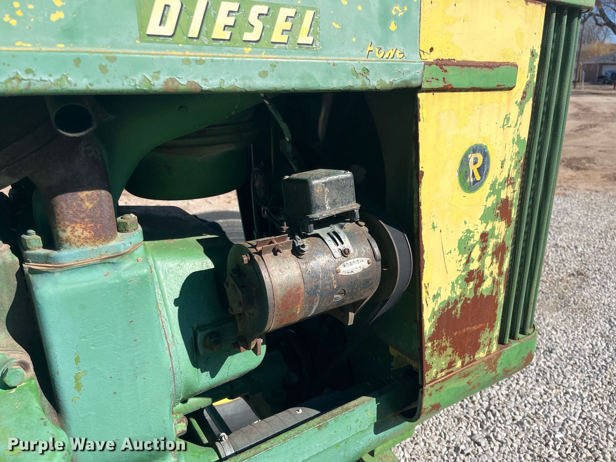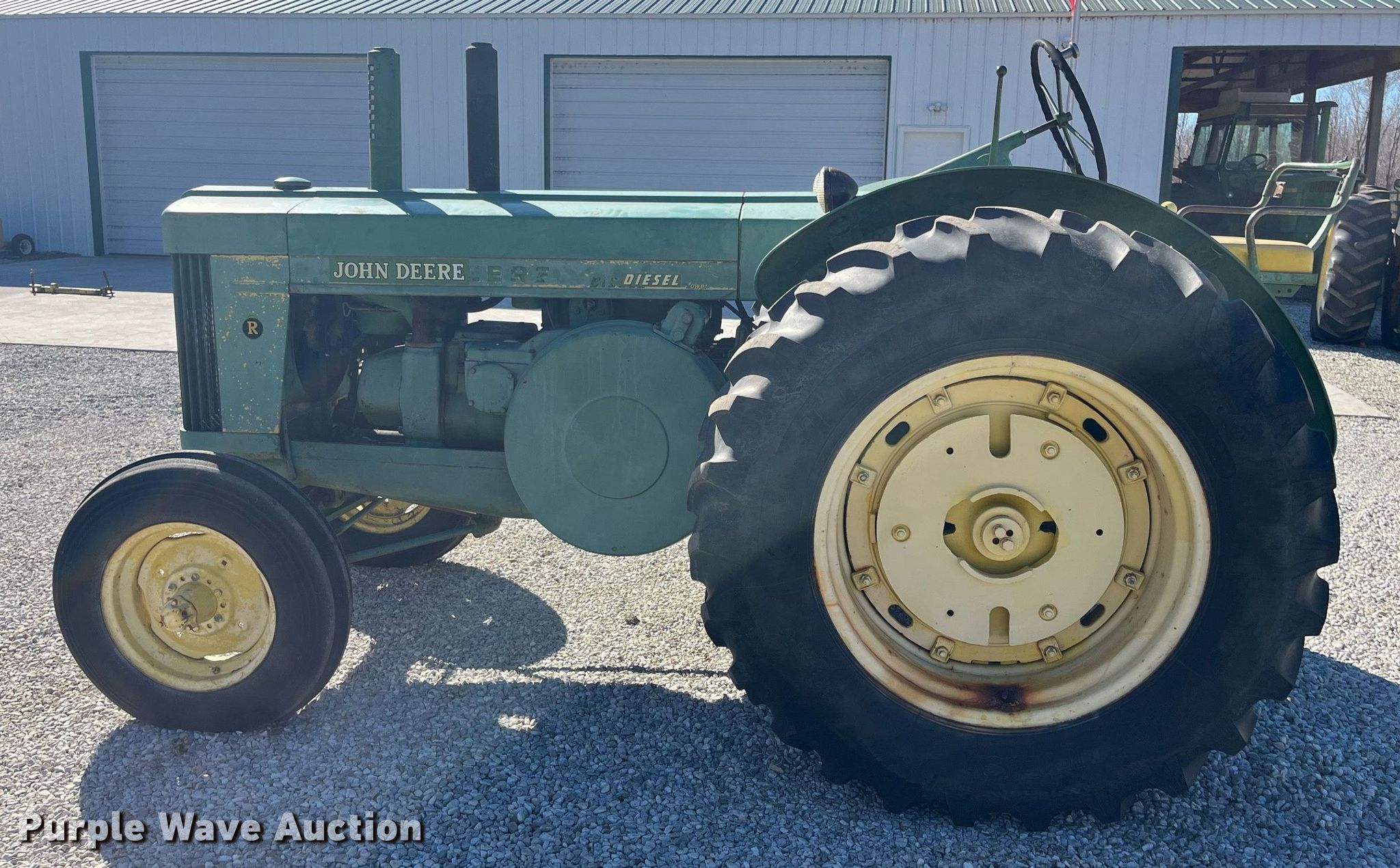 1953 John Deere R tractor. Hours: 2,781 on meter, Serial: 17767. Engine John Deere, Cylinders: 2, Fuel type: Diesel. Transmission Manual, 5F - 1R. Features PTO: 540, Hydraulic remote sets Rear: 1. Tires Front: 7.50-18, Rear: 16.9-34. Notes Set up to pull a tandem John Deere R tractor, Tailing tractor not included. View repairs. Andale, KS 67001