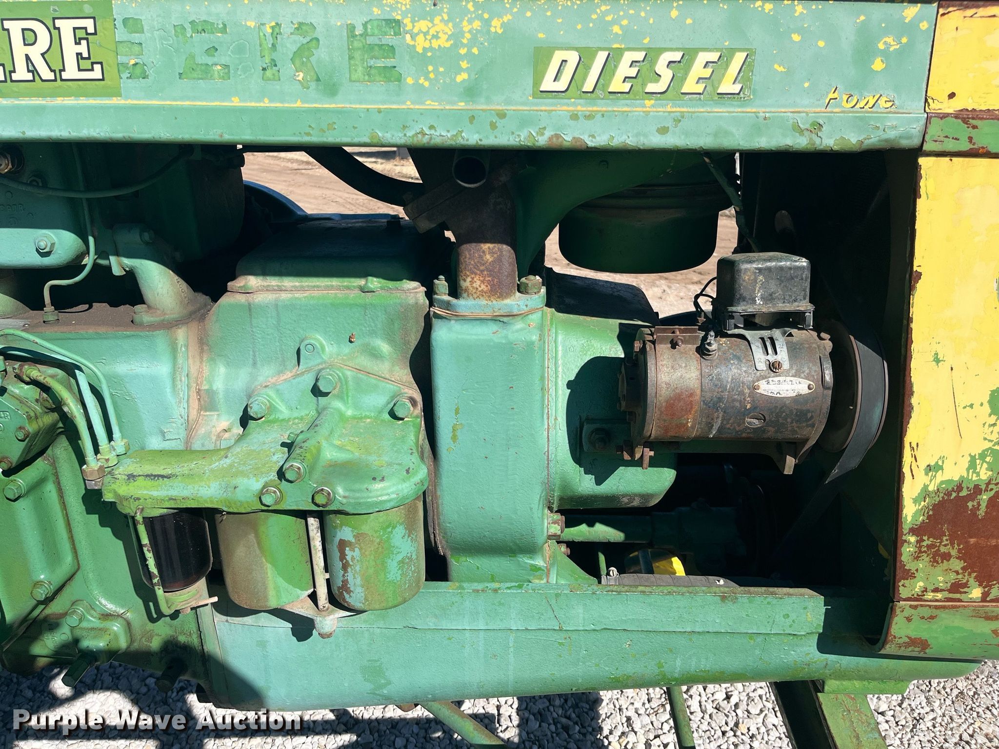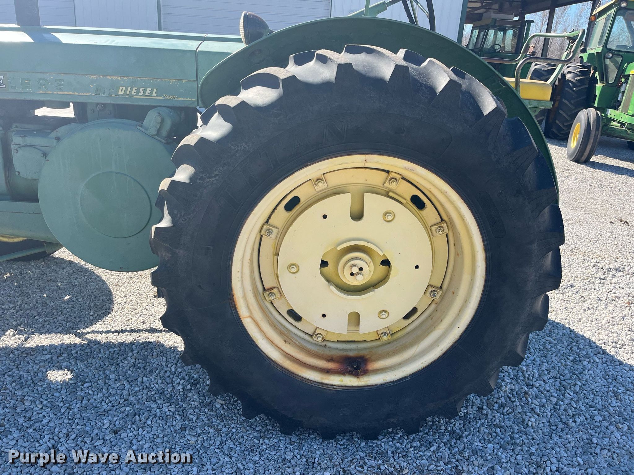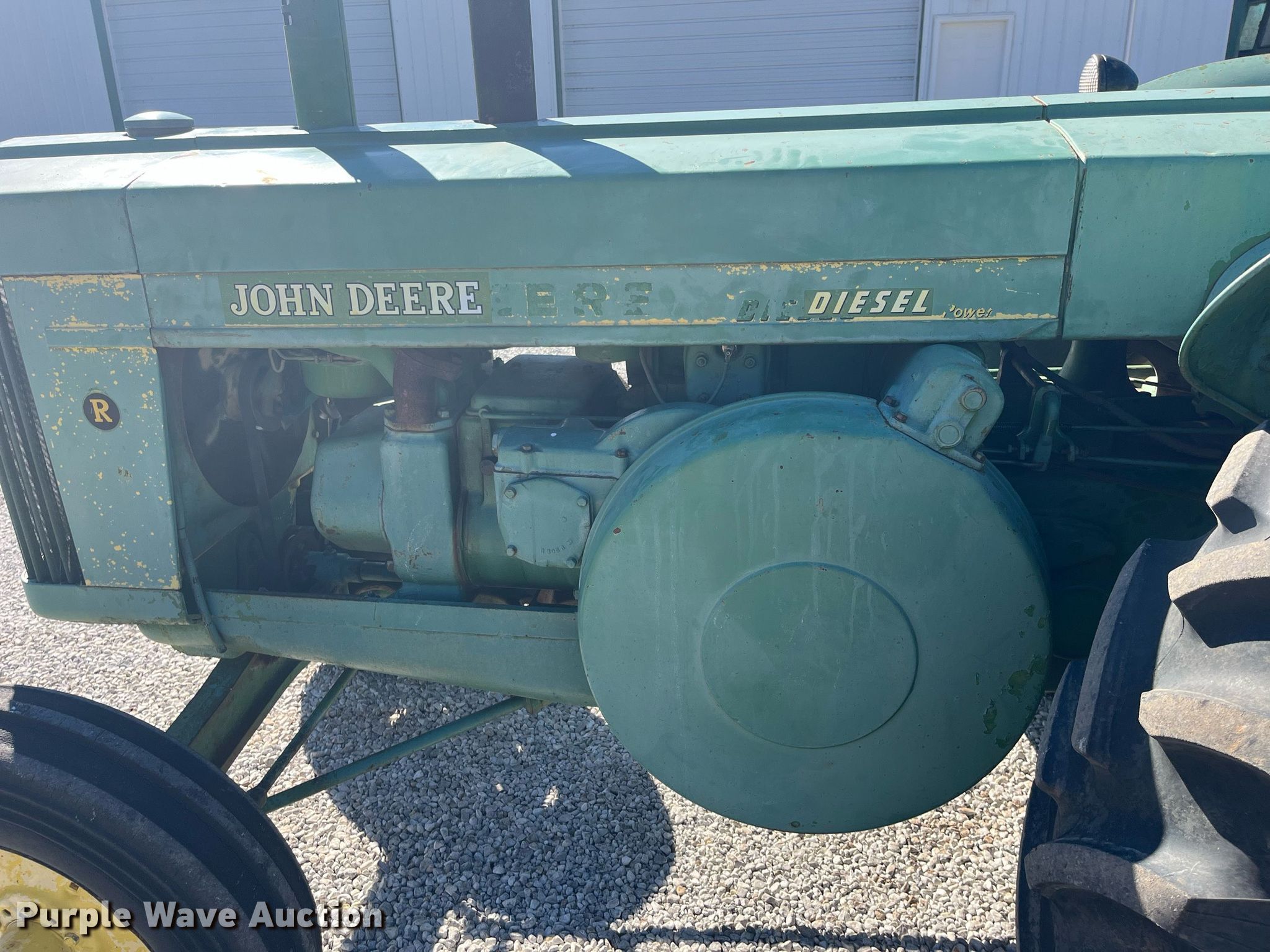 1953 John Deere R tractor. Hours: 2,781 on meter, Serial: 17767. Engine John Deere, Cylinders: 2, Fuel type: Diesel. Transmission Manual, 5F - 1R. Features PTO: 540, Hydraulic remote sets Rear: 1. Tires Front: 7.50-18, Rear: 16.9-34. Notes Set up to pull a tandem John Deere R tractor, Tailing tractor not included. View repairs. Andale, KS 67001