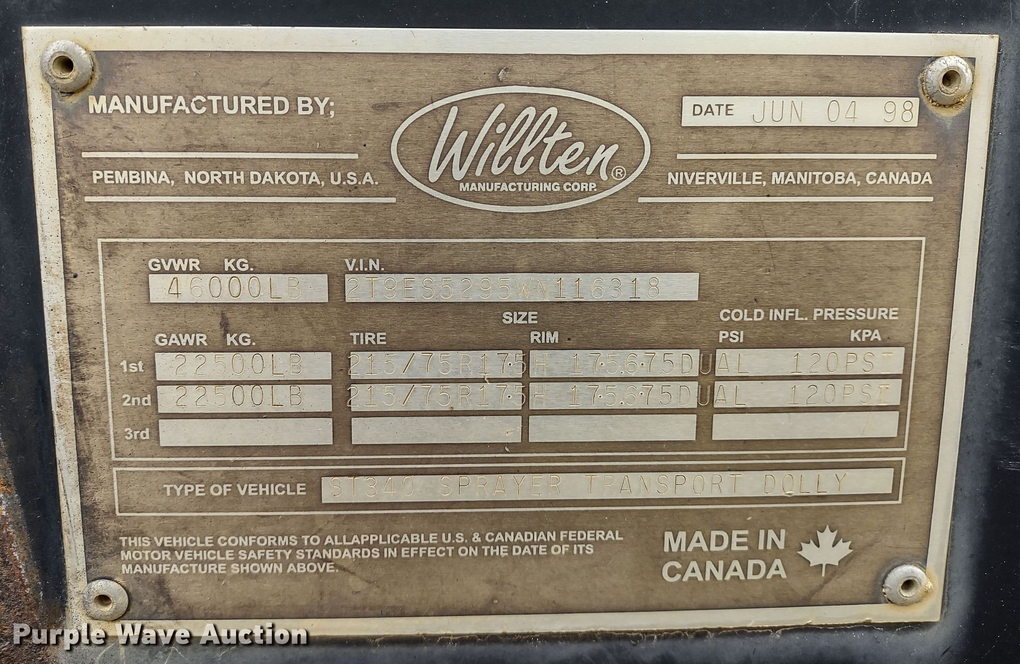Purple Wave is selling a used Ag Equip. or Header Trailer in Kansas. This item is a 1998 Willten ST340 sprayer trailer with the following: VIN: 2T9ES5295WN116318