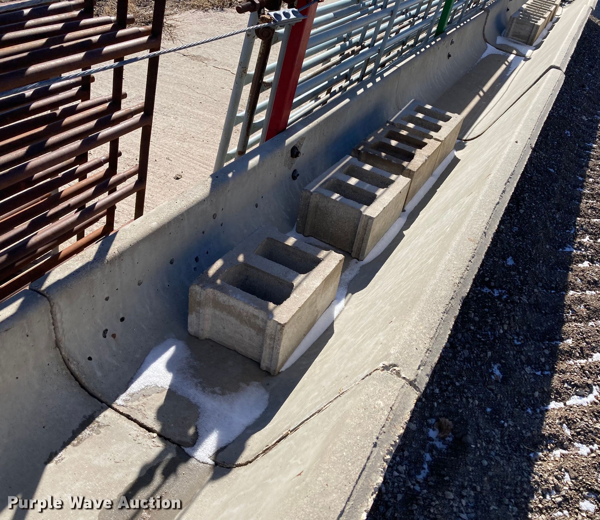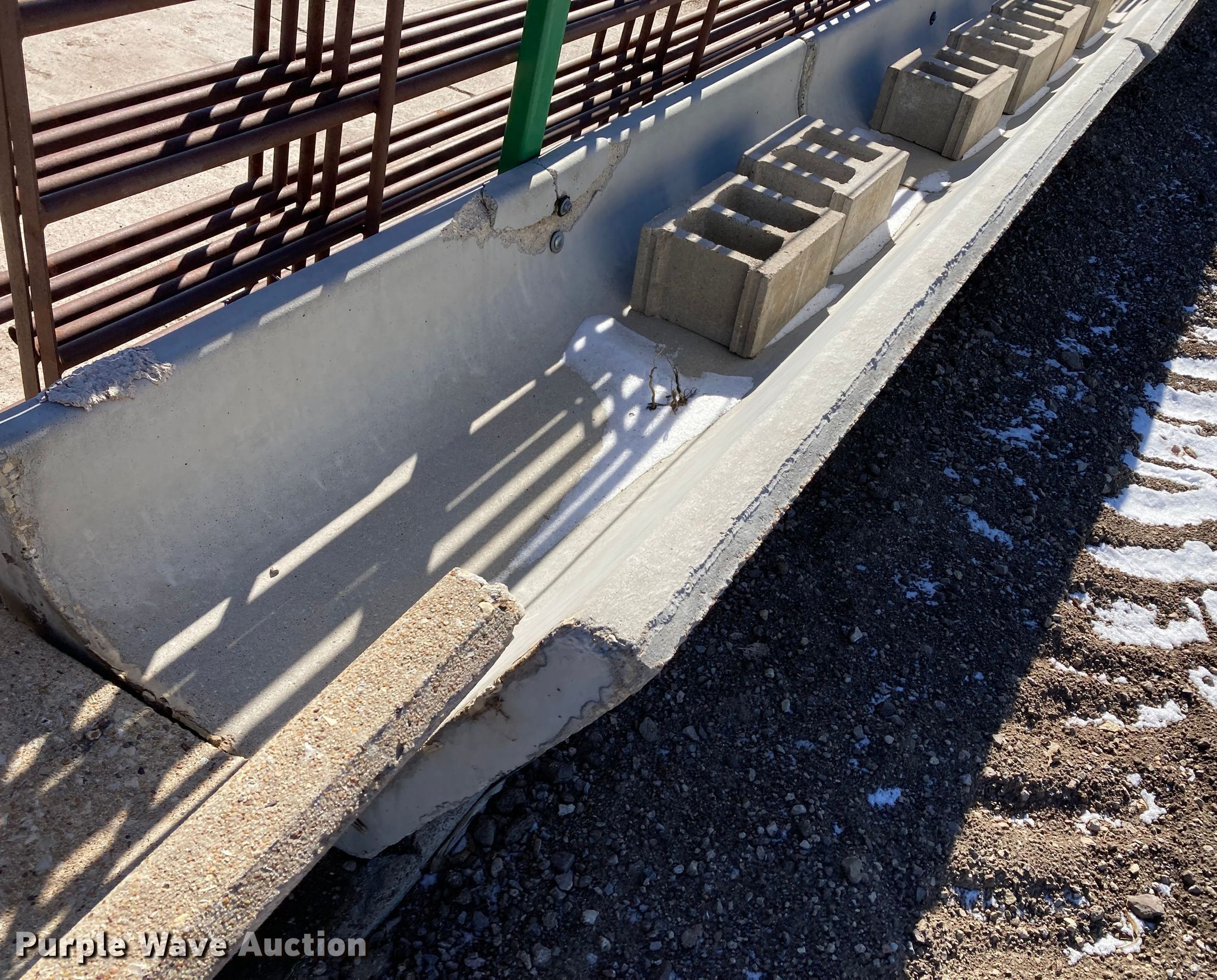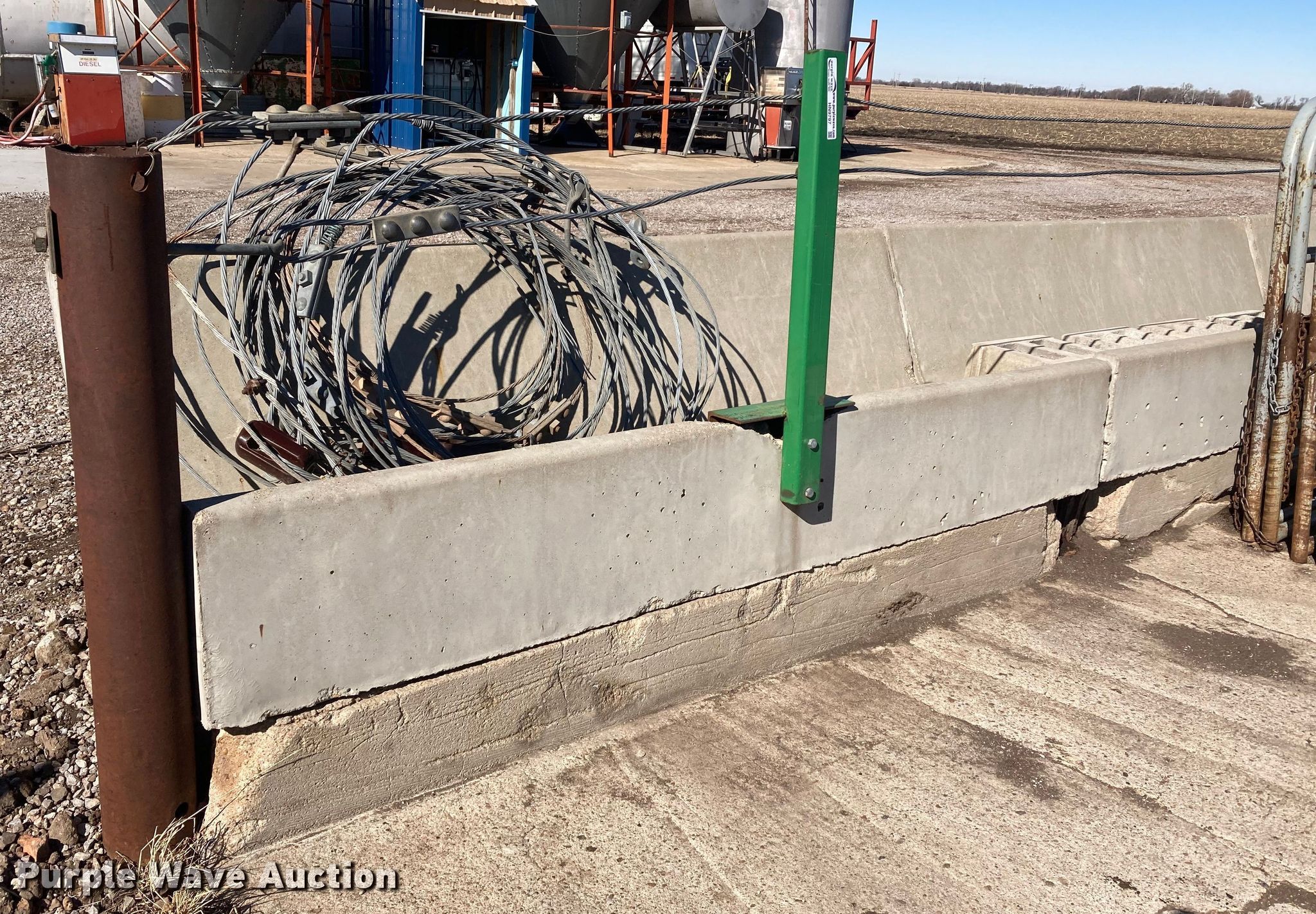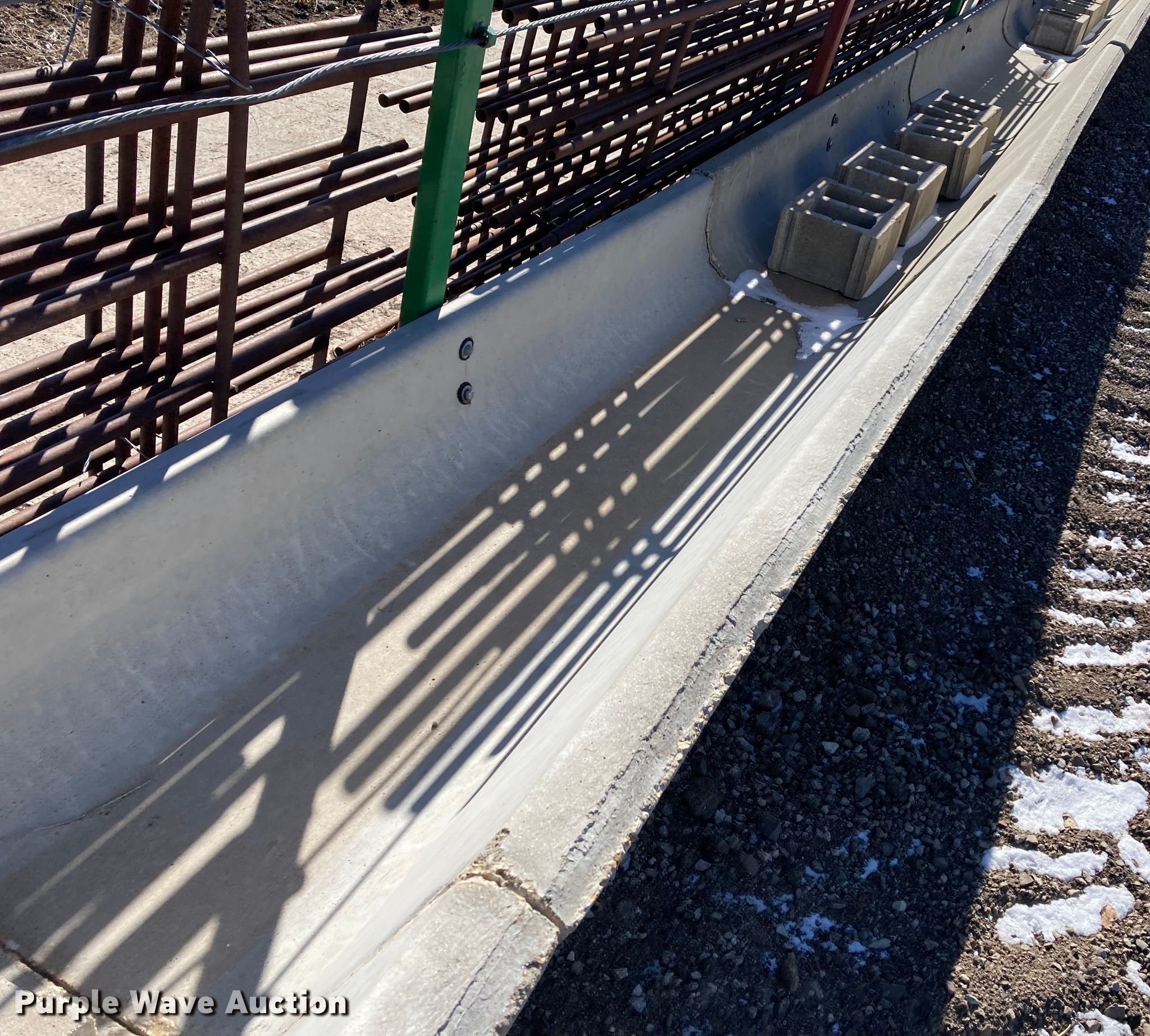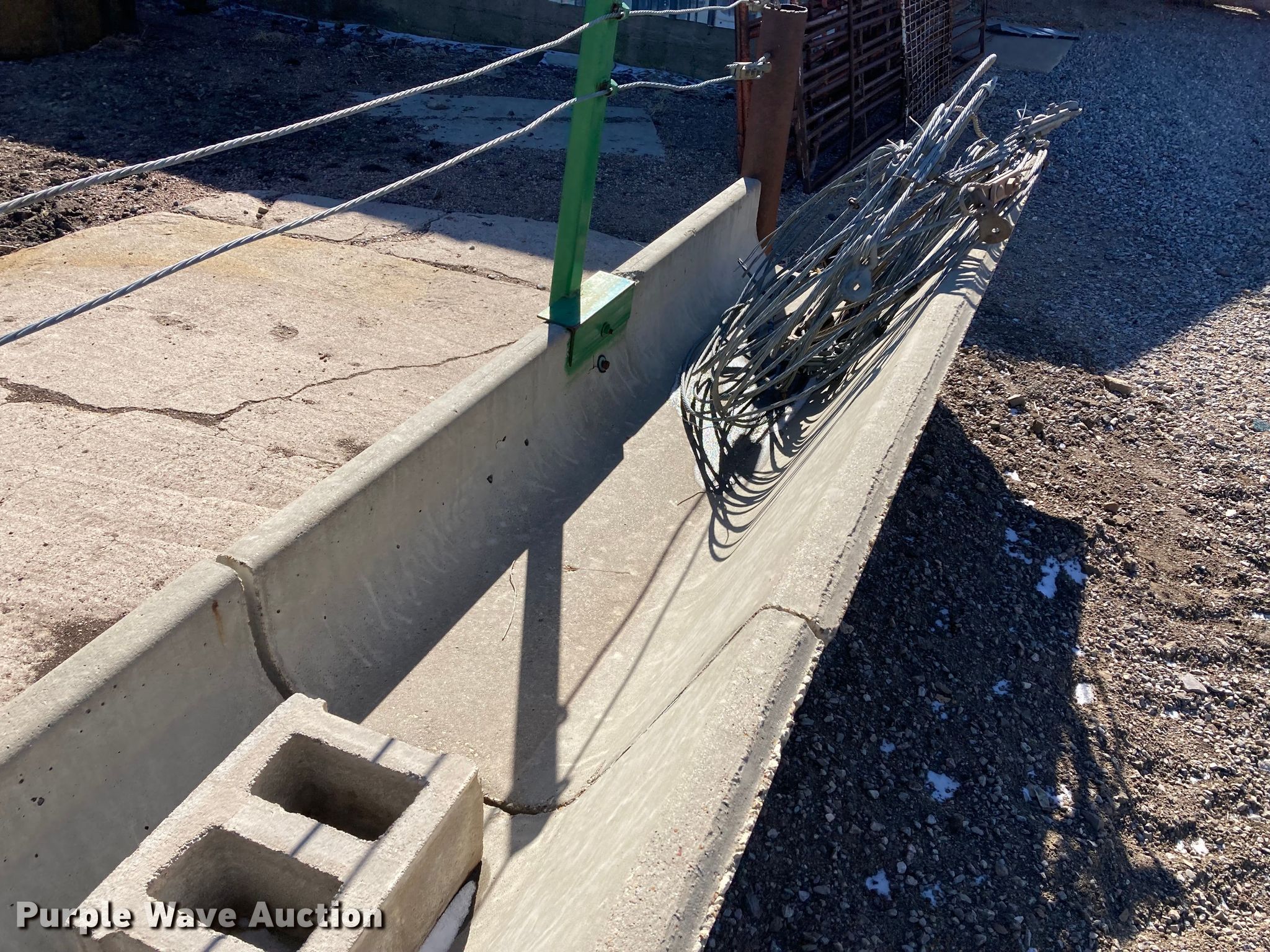 Purple Wave is selling a used Livestock Equip. in Kansas. This item is a Livestock equipment with the following: (12) 8'L concrete feed bunks, (2) end posts, (2) approx. 96'L x 3/8" diameter cables, Additional cable, (30) blocks and more