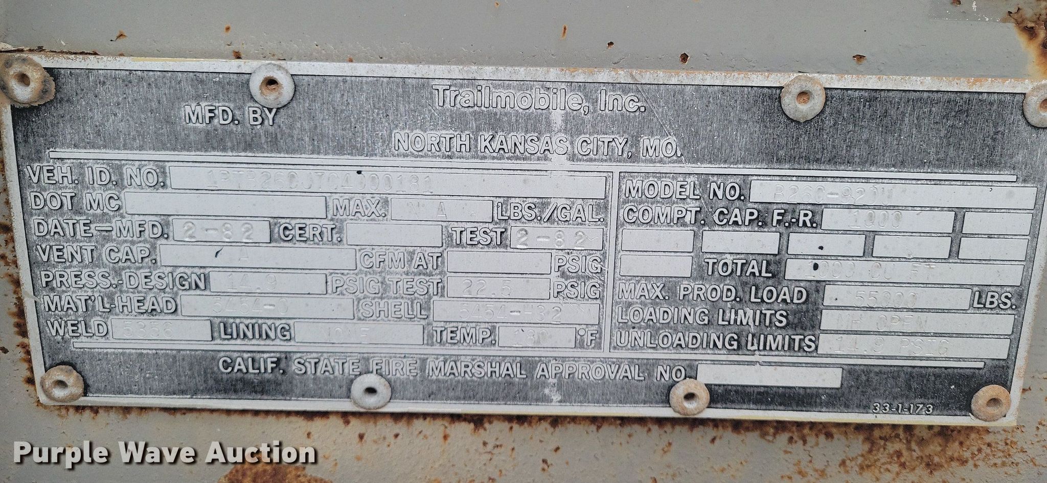 Purple Wave is selling a used Tank Trailer in Oklahoma. This item is a 1982 Trailmobile pneumatic dry bulk trailer with the following: VIN: 1PTB26CJ7C4000181