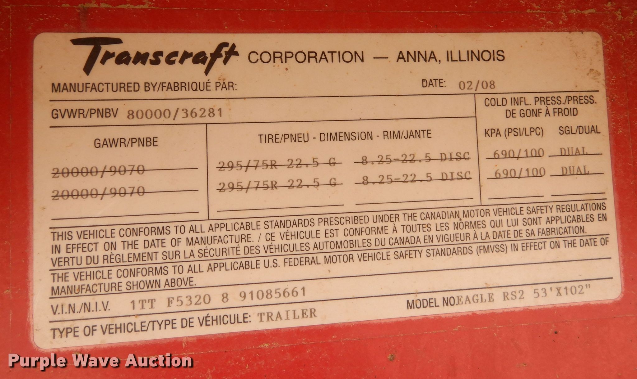 2009 Transcraft Eagle RS2 flatbed trailer. VIN: 1TTF5320891085661. Dimensions Overall: 53' L x 102" W. Features Deck type: Aluminum. Chassis Landing gear: Dual, Suspension: Air, Brakes: Air, Axles: Spread, GVWR: 80,000 lbs, GAWR: 20,000 lbs. Tires Steel wheels, Size: 295/75R22.5. Kansas title. Title distribution may be delayed up to 14 days from verification of funds. 301 N Garland St. Leoti, KS 67861