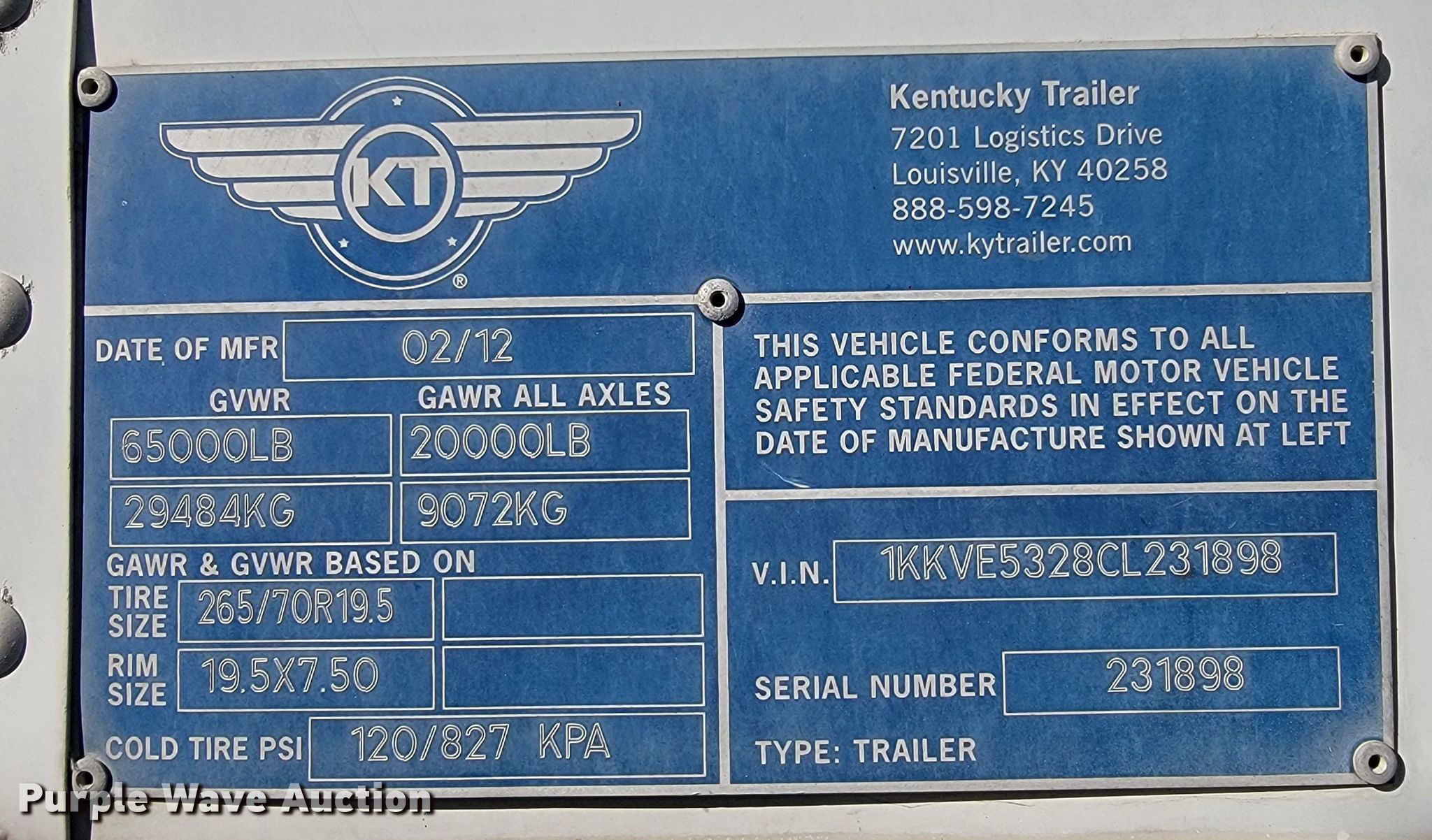 Purple Wave is selling a used Dry Van Trailer in Missouri. This item is a 2012 Kentucky Trailers dry van trailer with the following: VIN: 1KKVE5328CL231898
