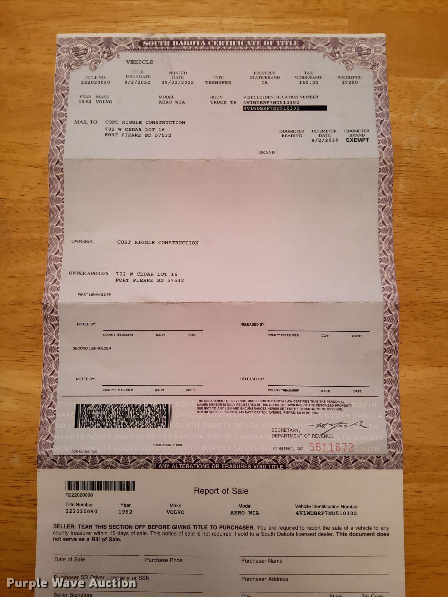 Purple Wave is selling a used Truck Tractor in South Dakota. This item is a 1992 Volvo Aero WIA semi truck with the following: Miles: Unknown, Last known mileage: 72,583, VIN: 4V1WDBRF7NU510302