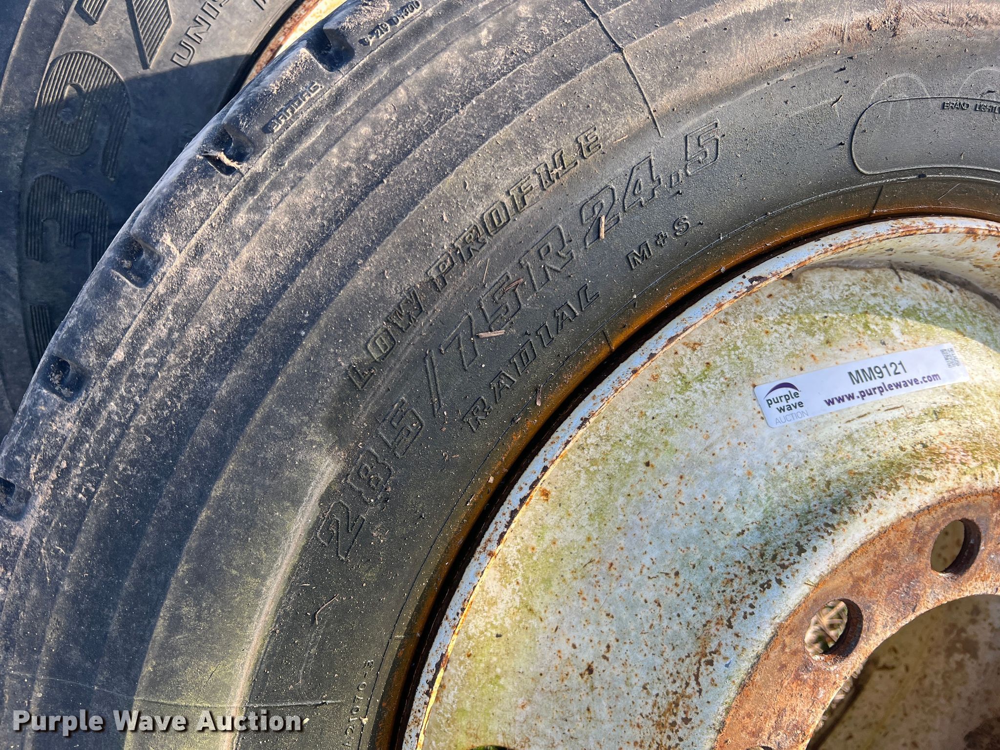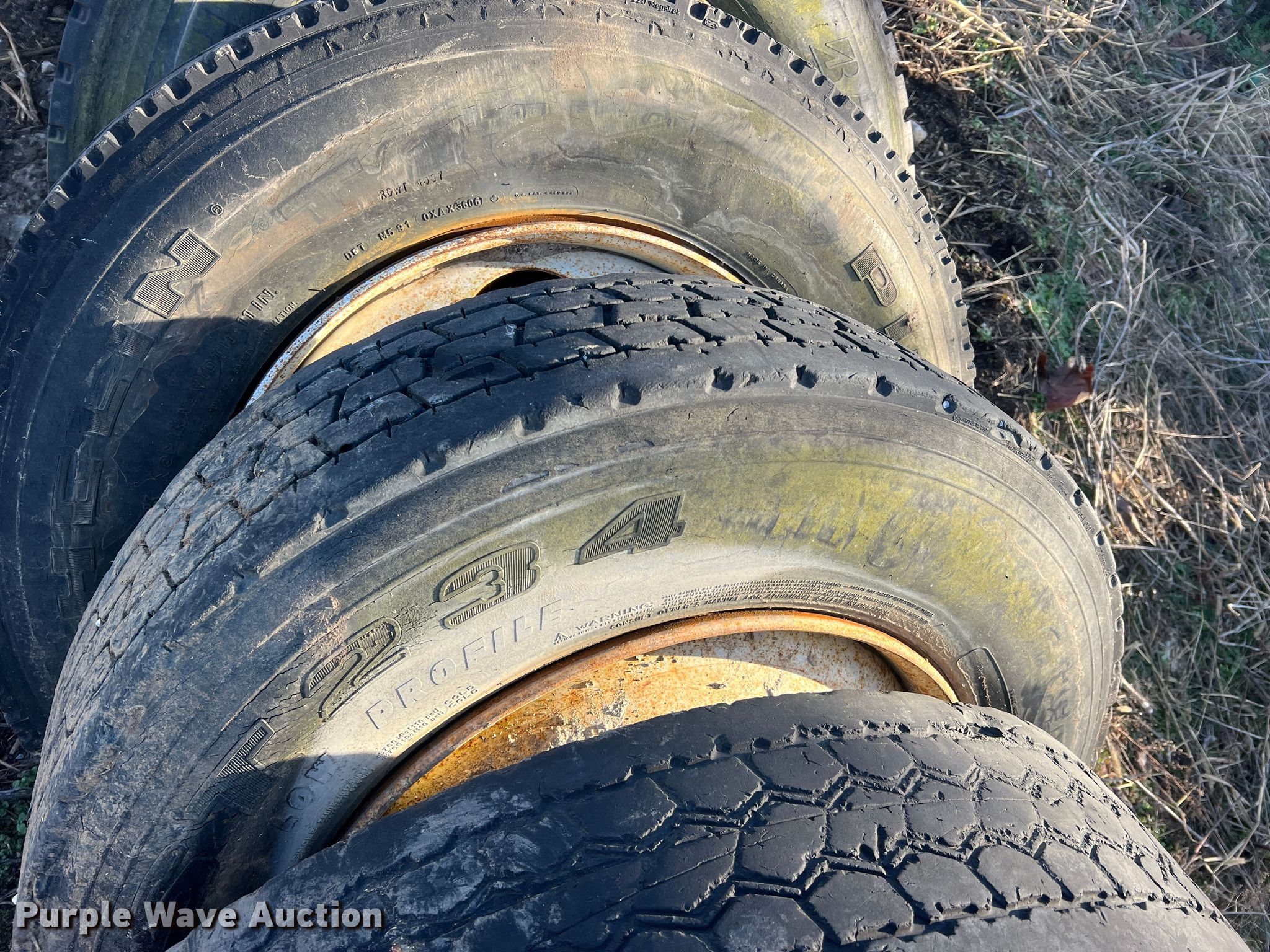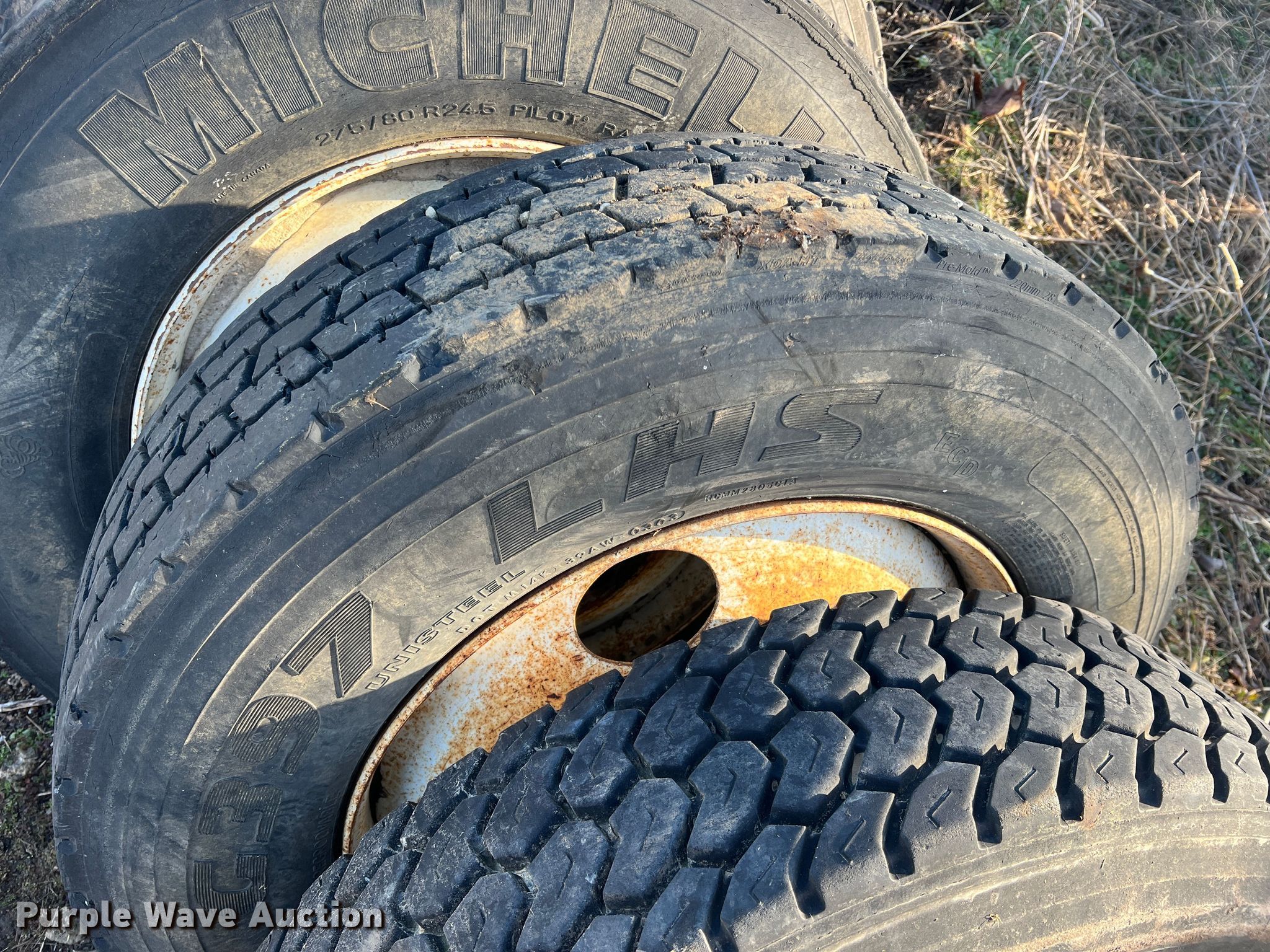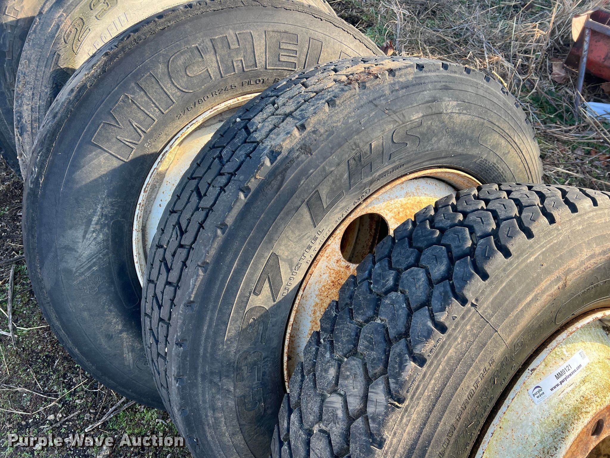 (8) wheels and tires. (4) 285/75R24.5 Ten lug, (4) 275/80R24.5 Ten lug. Luebbering Farms. 1884 County Rd 521. Koeltztown, MO 65048