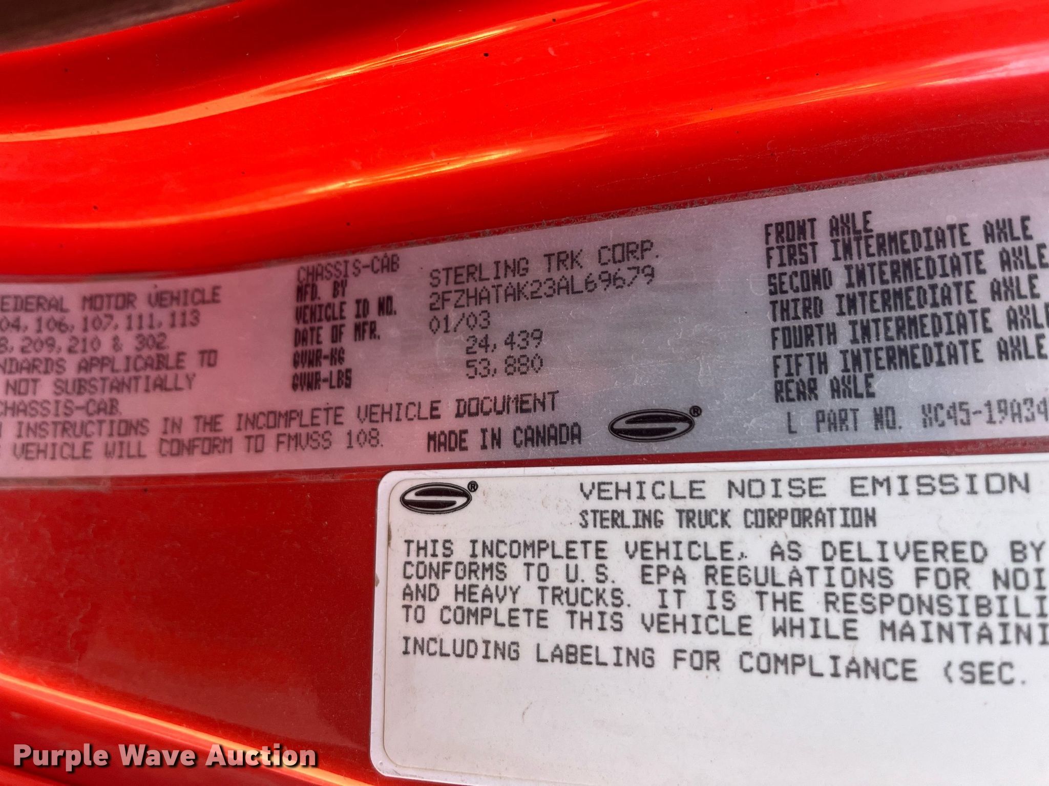 Purple Wave is selling a used Construction Dump Truck in Kansas. This item is a 2003 Sterling LT7501 dump truck with the following: Miles: 238,656 on odometer, Hours: 9,891 on meter, VIN: 2FZHATAK23AL69679, KDOT ID: 263-5033