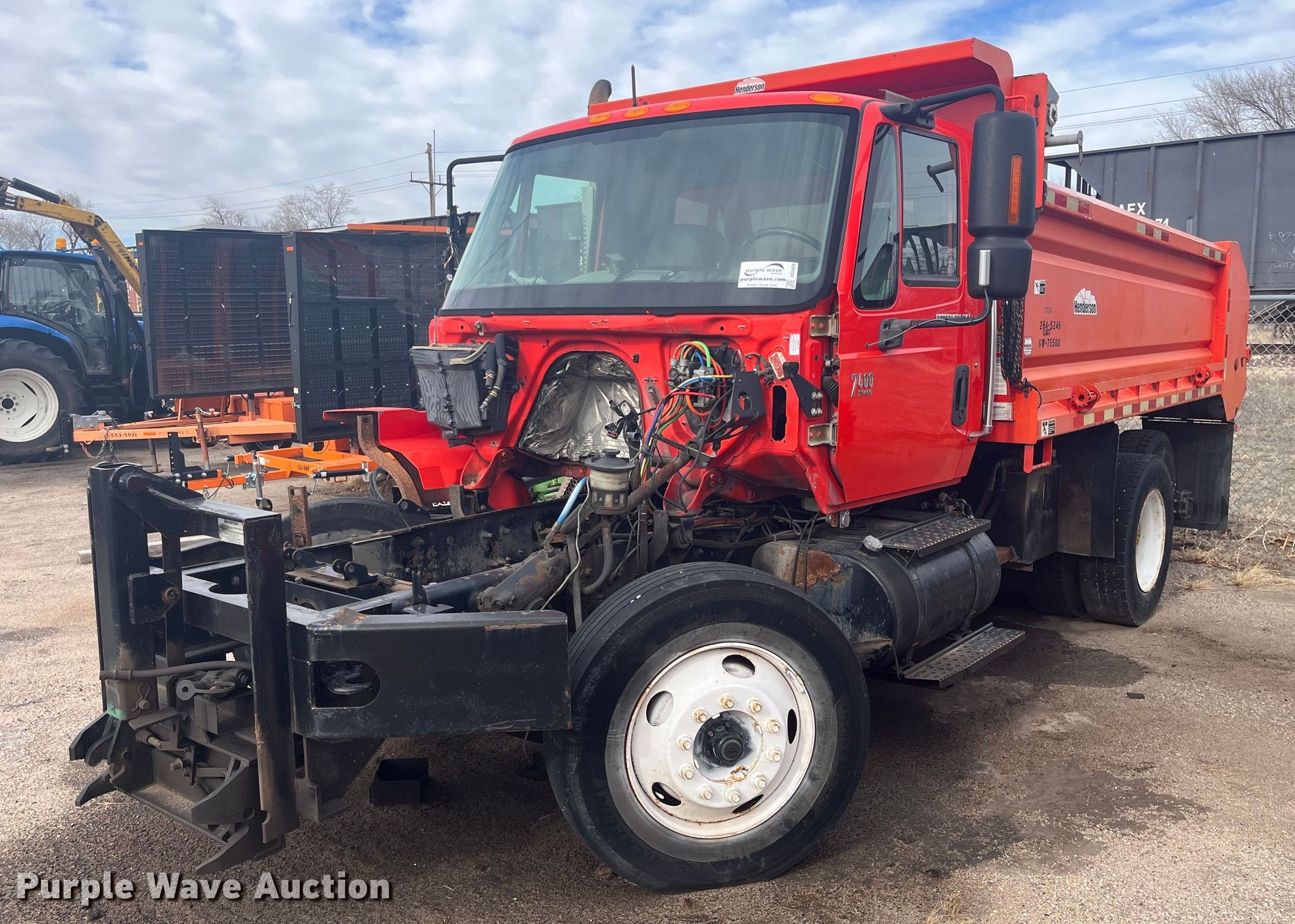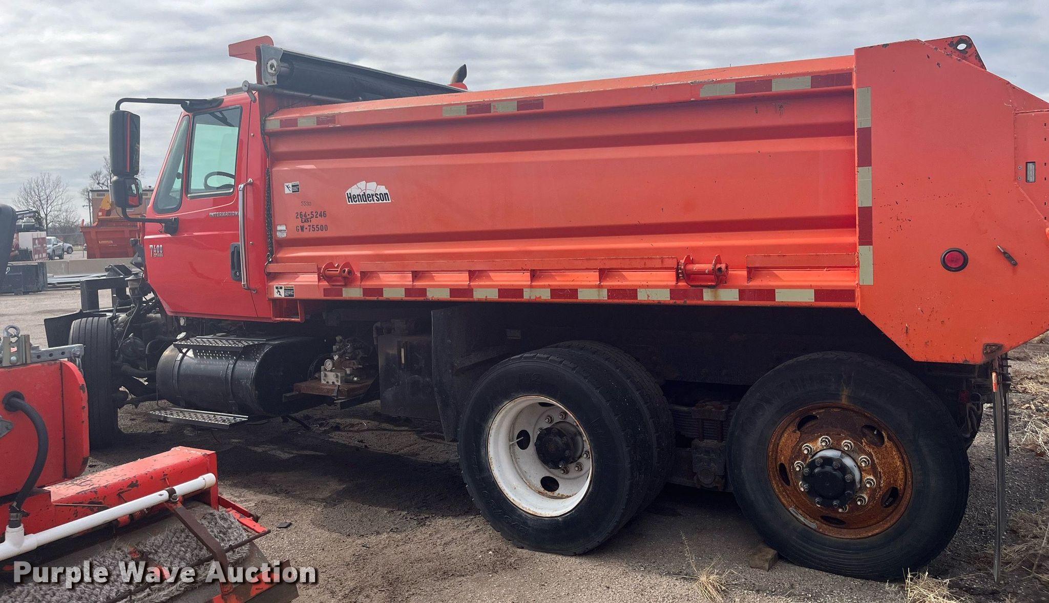 2007 International 7400 dump truck. Miles: Unknown Last recorded miles: 165,503, Actual mileage unknown, VIN: 1HTWHAAR97J391601, KDOT ID: 264-5246. Engine No engine. Transmission No transmission. Chassis Axles: Tandem, Suspension: Spring over walking beam, Brakes: Air. Interior AC, Heat, Cruise control. Features Dump bed Henderson 13.5X109427XKDOT, 13' 6" L x 92" W, Side height: 36", Roll tarp, Ram: Single , End gate: Air operated. Tires Size: 275/80R22.5. Notes Parts missing, Non-operational unit. Kansas title. Titles will be distributed after confirmation of payment and removal. Title distribution may be delayed up to 30 days from verification of funds. Kansas Department of Transportation - Hutchinson. 500 N. Hendricks. Hutchinson, KS 67501