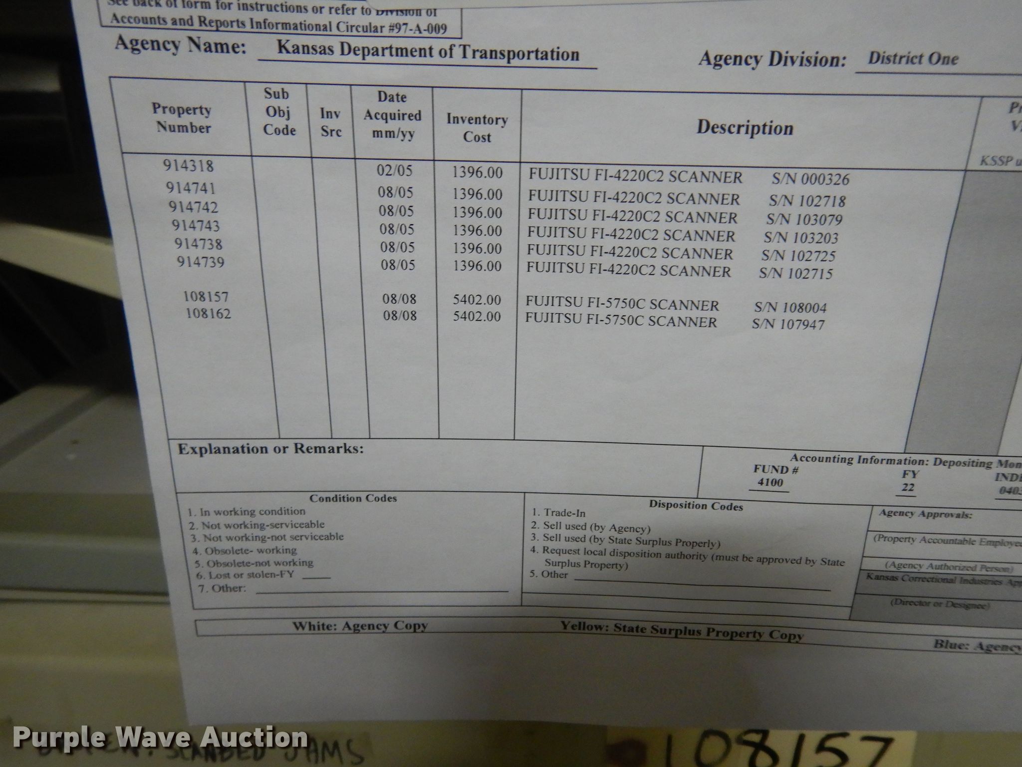 Purple Wave is selling a used Office Supplies and Equip. in Kansas. This item is a (8) scanners with the following: (2) Fuji FI-5750C, (6) Fujitsu DI-4220C2, Non-operational unit, KDOT ID: 108157, 108162, 914318, 914738, 914739, 914741, 914742, 914743