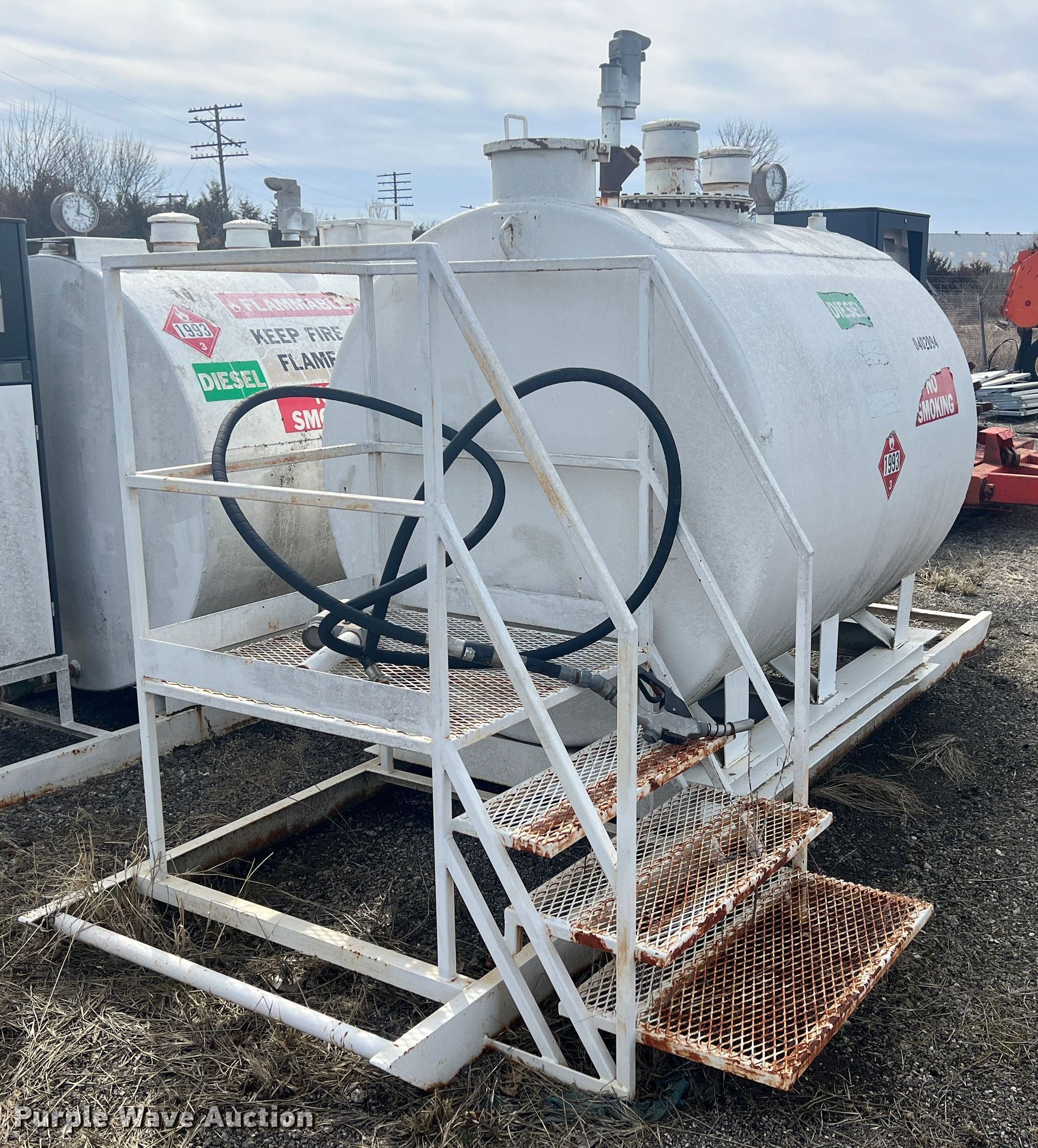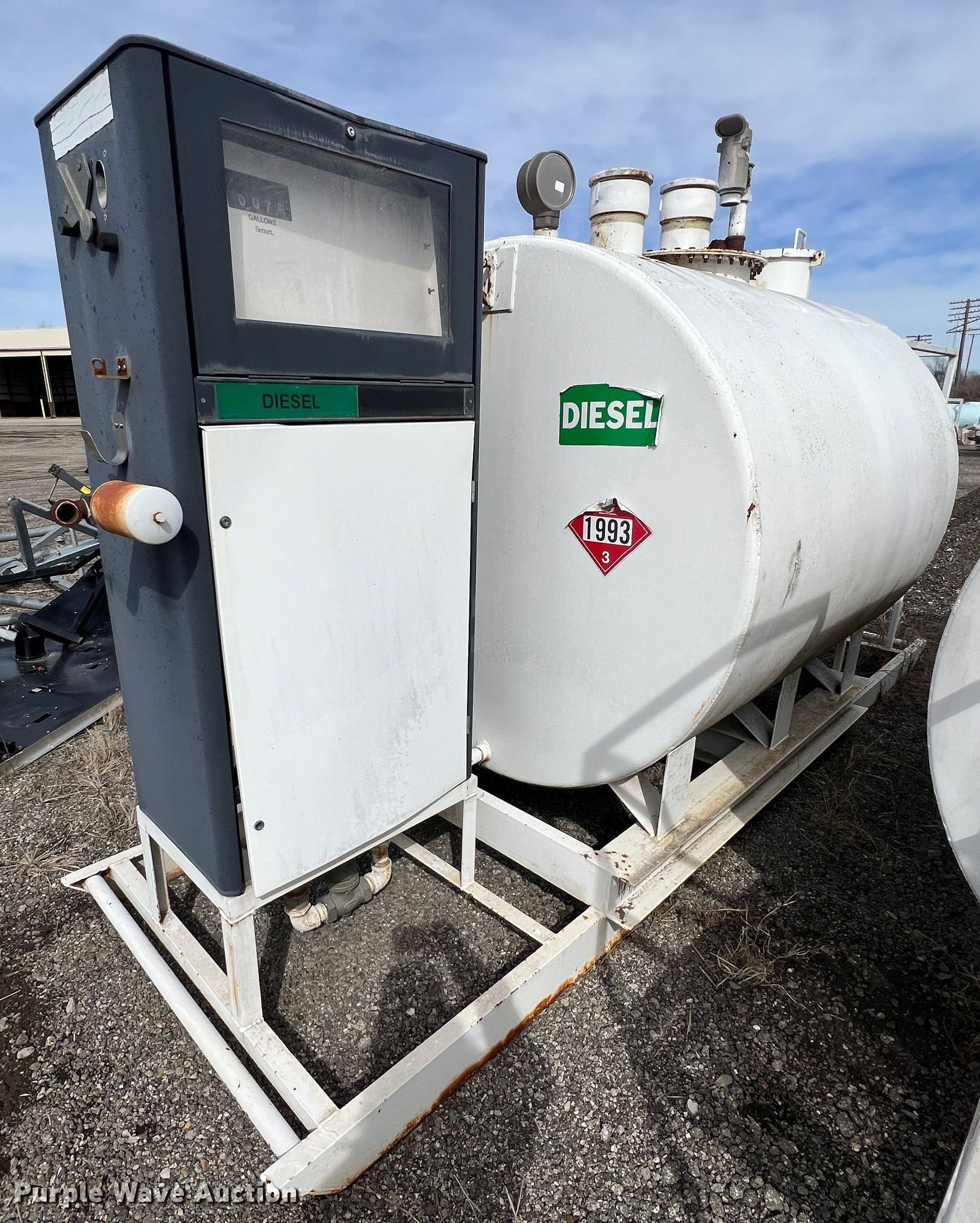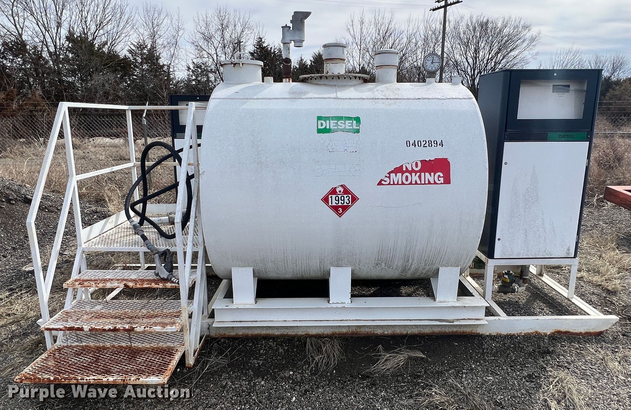 Purple Wave is selling a used Fuel and Lube in Kansas. This item is a 1994 A.M. Environmental fuel tank with the following: Capacity: 1,000 gallons, Bennet pump cabinet, 110V, Secondary containment, Previously used for diesel, Serial: 680455, KDOT ID: 040-2894