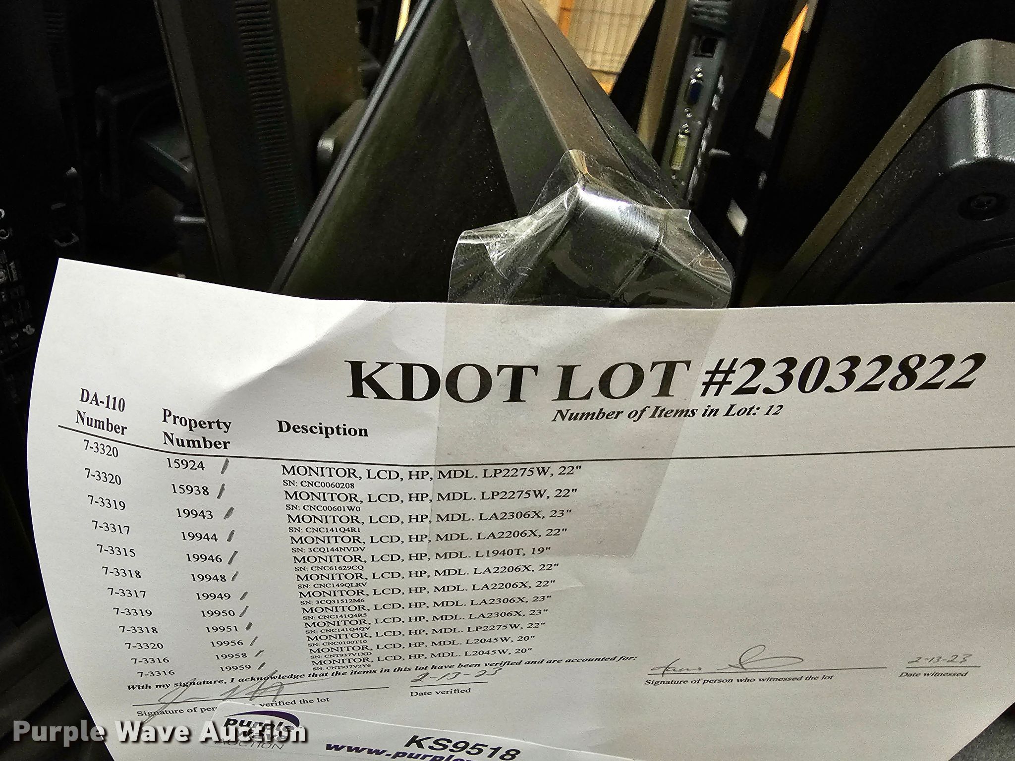 (12) HP monitors. 19" monitor, (2) 20" monitors, (6) 22" monitors, (3) 23" monitors, KDOT ID: 23032822. View inventory for more information. Purple Wave reserves the right to obtain additional buyer information prior to item removal. Kansas Department of Transportation - Topeka Warehouse. 2035 SW Western Ave. Topeka, KS 66604