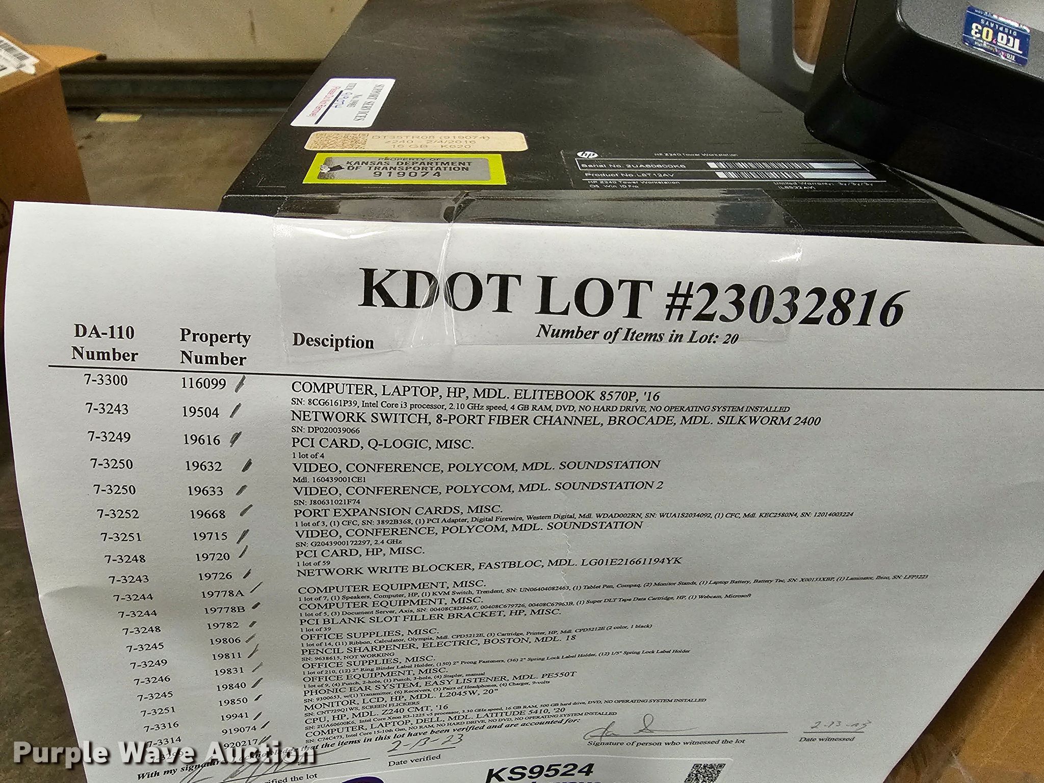 Purple Wave is selling a used Office Supplies and Equip. in Kansas. This item is a Office supplies and equipment with the following: Brocade Silkworm 2400 8-port fiber channel network switch, (4) Q-Logic PCI cards, Polycom Soundstation video conference units, (3) port expansion cards, (59) HP PCI cards, Fastbloc network write blocker, (39) HP PCI blank slot filler brackets, Boston 18 pencil sharpener, Non-operational unit, Easy Listerner PE550T phonic ear system, HP L2045W 20" monitor, Display issues, HP ELitebook 8570P laptop, Hard drives have been reformatted and no operating system installed, HP Z240 CMT CPU, Hard drives have been reformatted and no operating system installed, Dell Latitude 5410 laptop, Hard drives have been reformatted and no operating system installed, Computer equipment, Office supplies and more, KDOT ID: 23032816