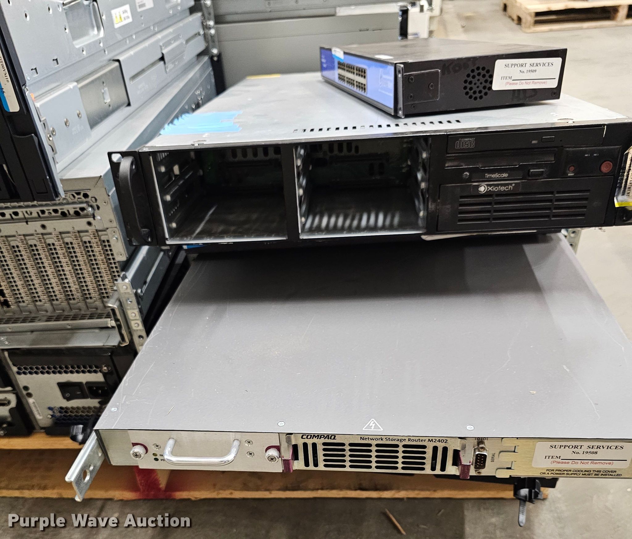Purple Wave is selling a used Electronics in Kansas. This item is a Electronics with the following: Xiotech Time Scale server, No hard drives, Brocade Silkworm 2400 8-port fiber channel network switch, Compaq M2402 fiber to SCSI bridge network router, Connect Gear 24-port ethernet switch, HP MSL8096 tape library, (2) Xiotech ISE2400 network storages, No hard drives, (4) HP Proliant DL585 G7 servers, No hard drives, KDOT ID: 23032814