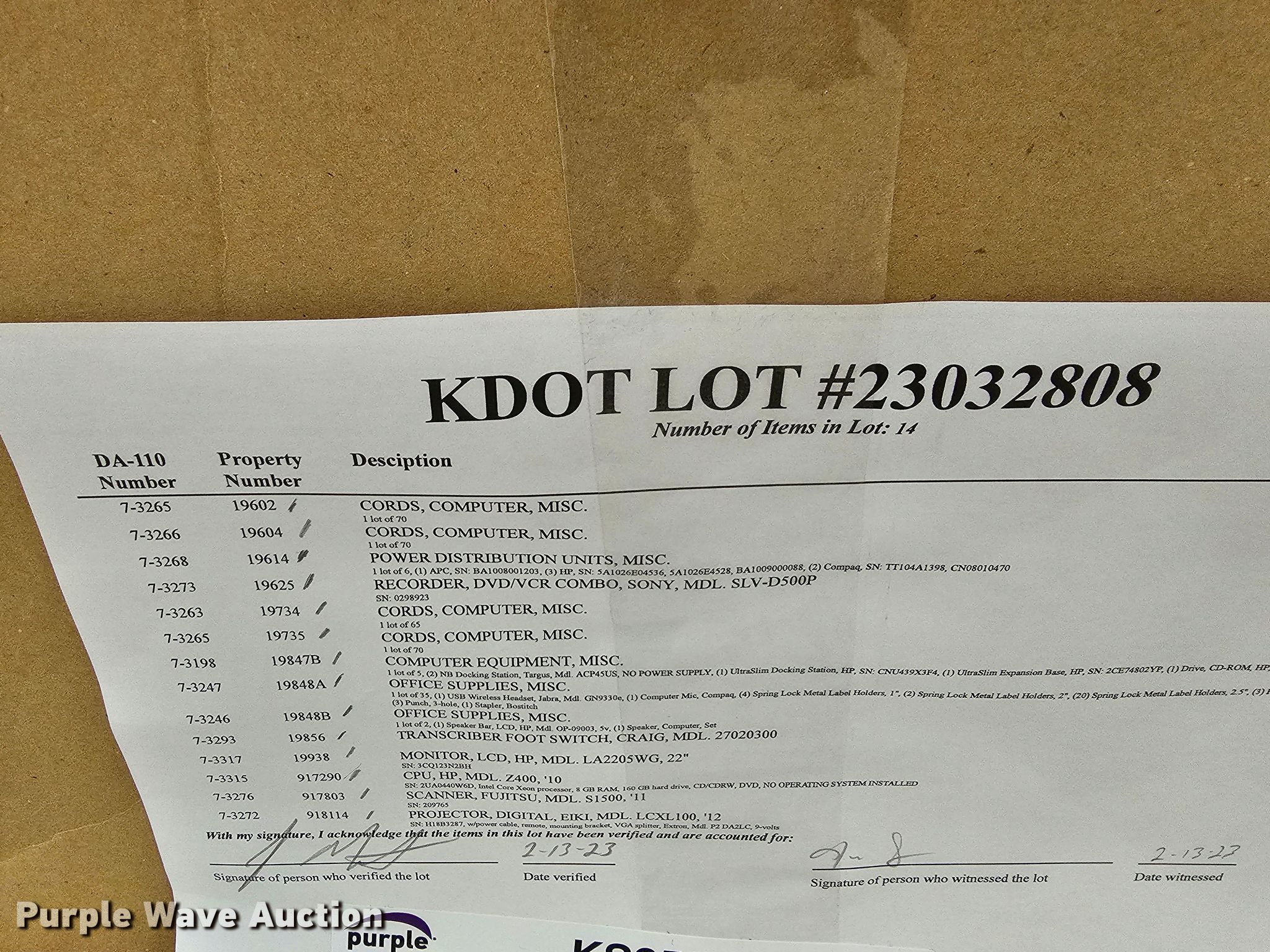 Office supplies and equipment. (275) computer cords, (6) power distribution units, Sony SLV-D500P DVD/VCR recorder, Computer equipment, Office supplies, Craig 27020300 transcriber foot switch, HP LA2205WG 22" monitor, HP Z400 CPU Intel Core Xeon processor, 160 GB HDD, 8 GB RAM, Hard drives have been reformatted and no operating system installed, Fujitsu S1500 scanner, Eiki LCXL100 projector and more, KDOT ID: 23032808. View inventory for more information. Purple Wave reserves the right to obtain additional buyer information prior to item removal. Kansas Department of Transportation - Topeka Warehouse. 2035 SW Western Ave. Topeka, KS 66604