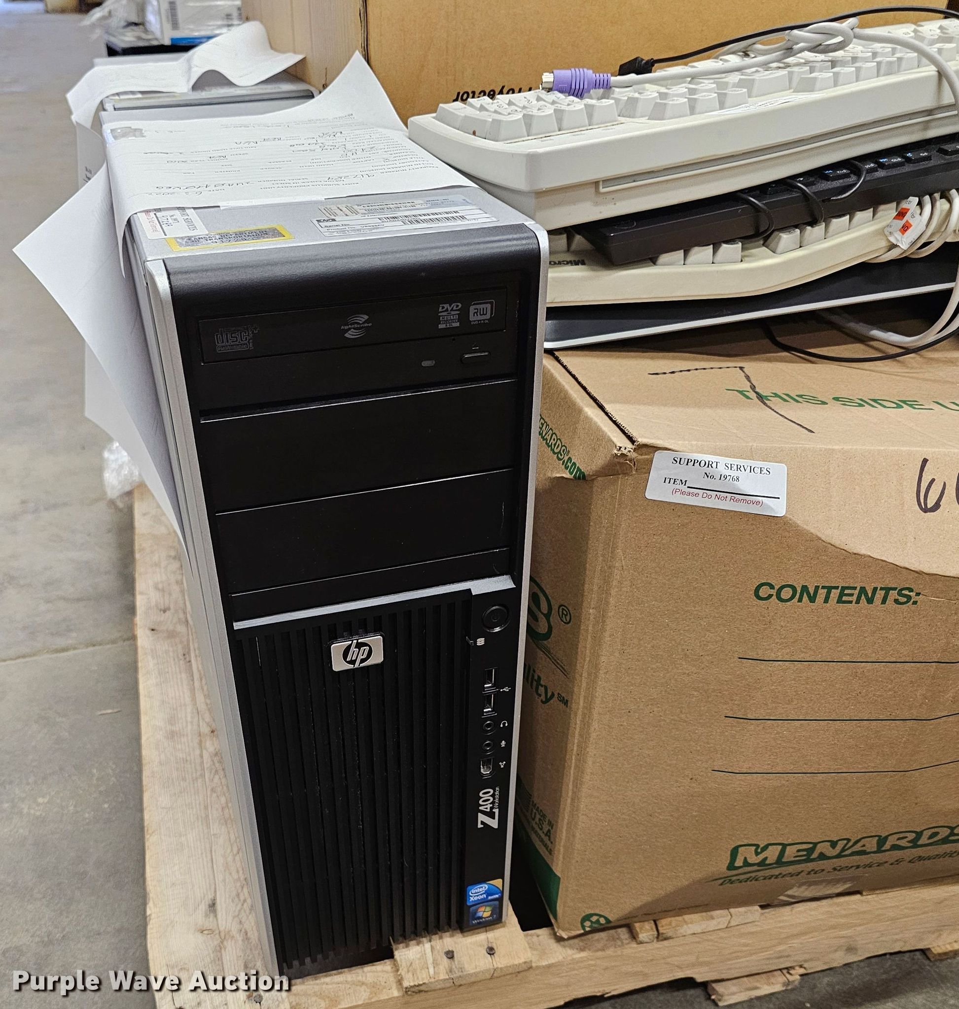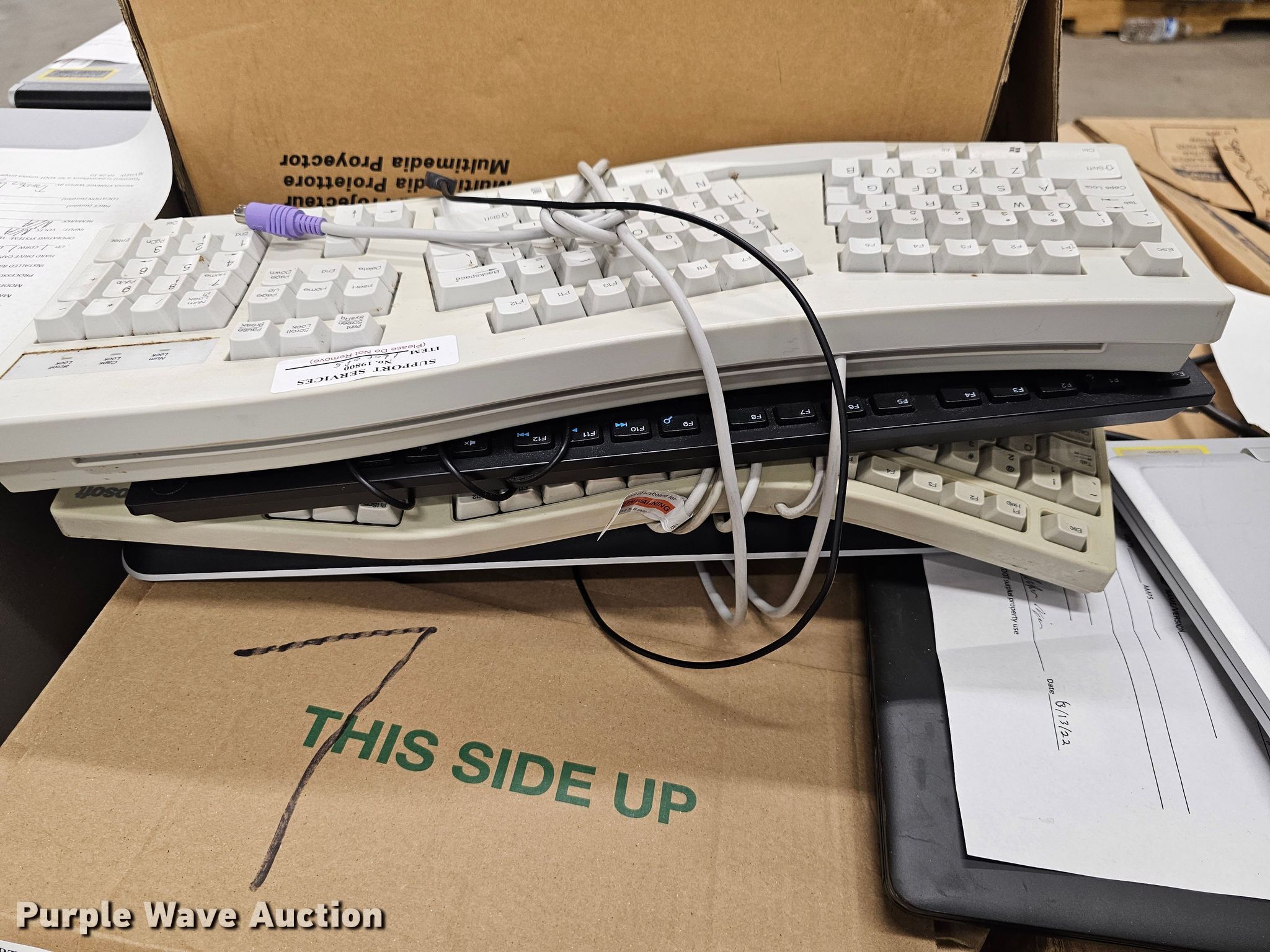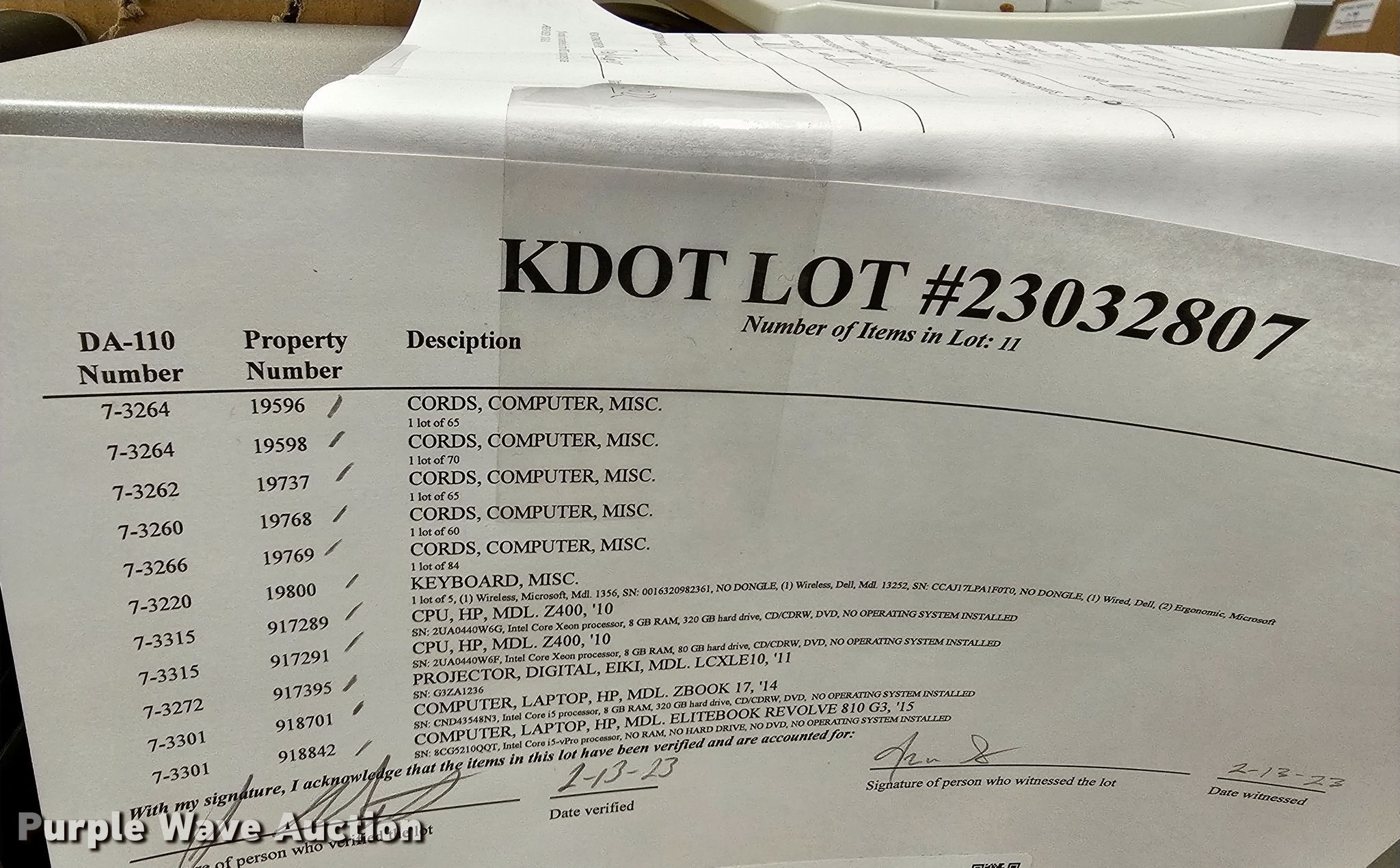 Purple Wave is selling a used Office Supplies and Equip. in Kansas. This item is a Office supplies and equipment with the following: (344) computer cords, (5) keyboards, (2) HP Z400 CPUs, Intel Core Xeon processors, 8 GB RAM, Eiki LCXLE10 projector, HP ZBook 17 laptop, Intel Core i5 processor, 320 GB HDD, HP Elitebook Revolve 810 G3 laptop, Intel Core i5-VPro processor, Hard drives have been reformatted and no operating system installed, KDOT ID: 23032807