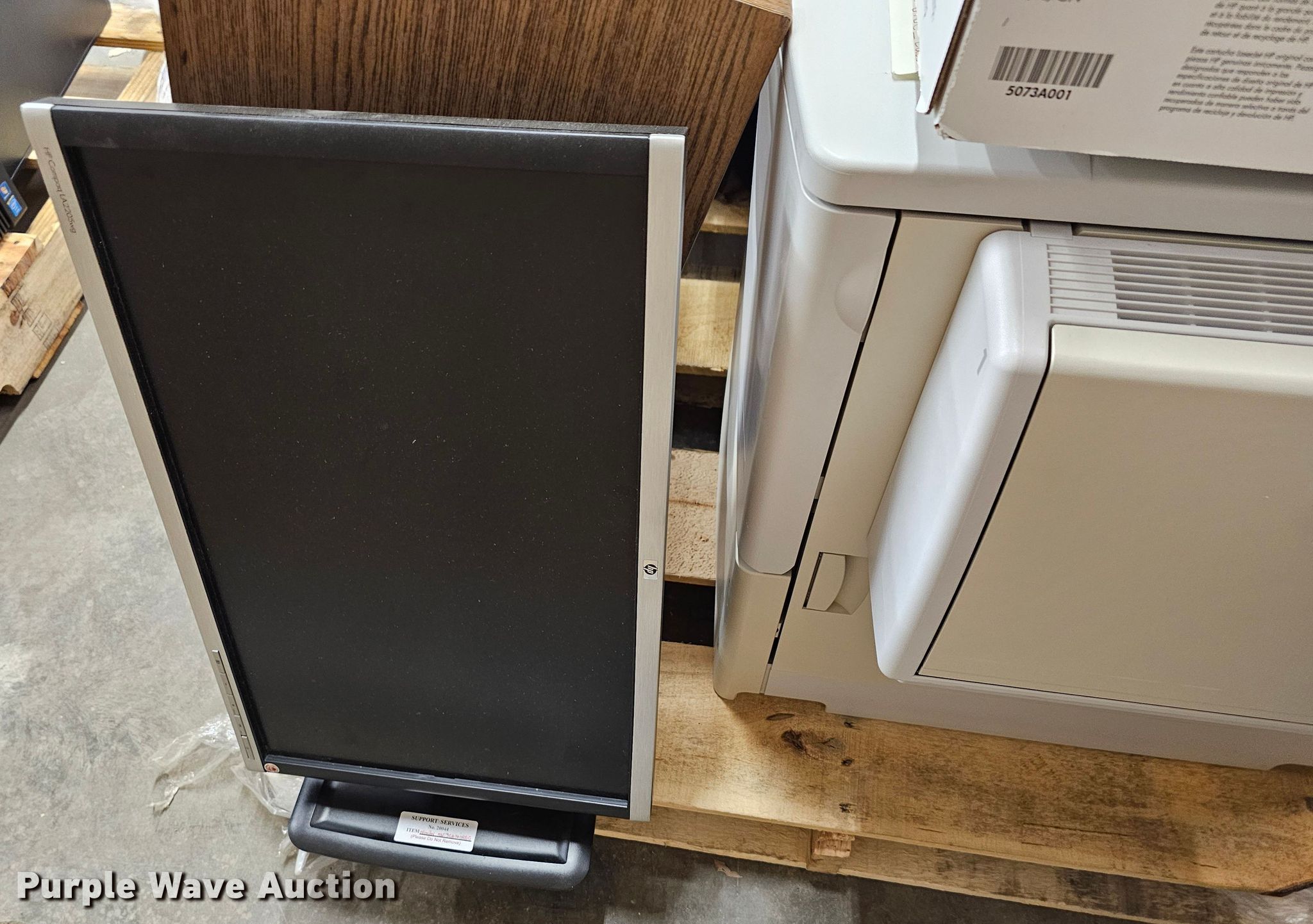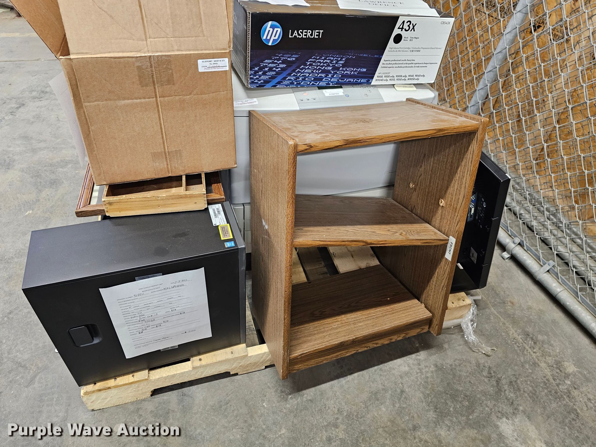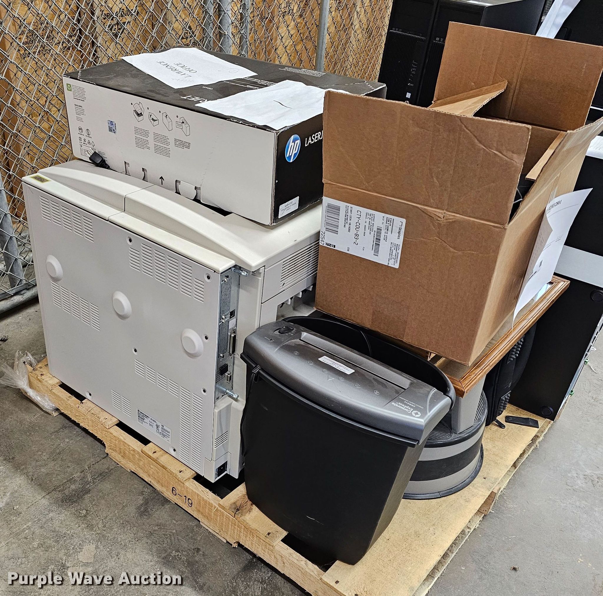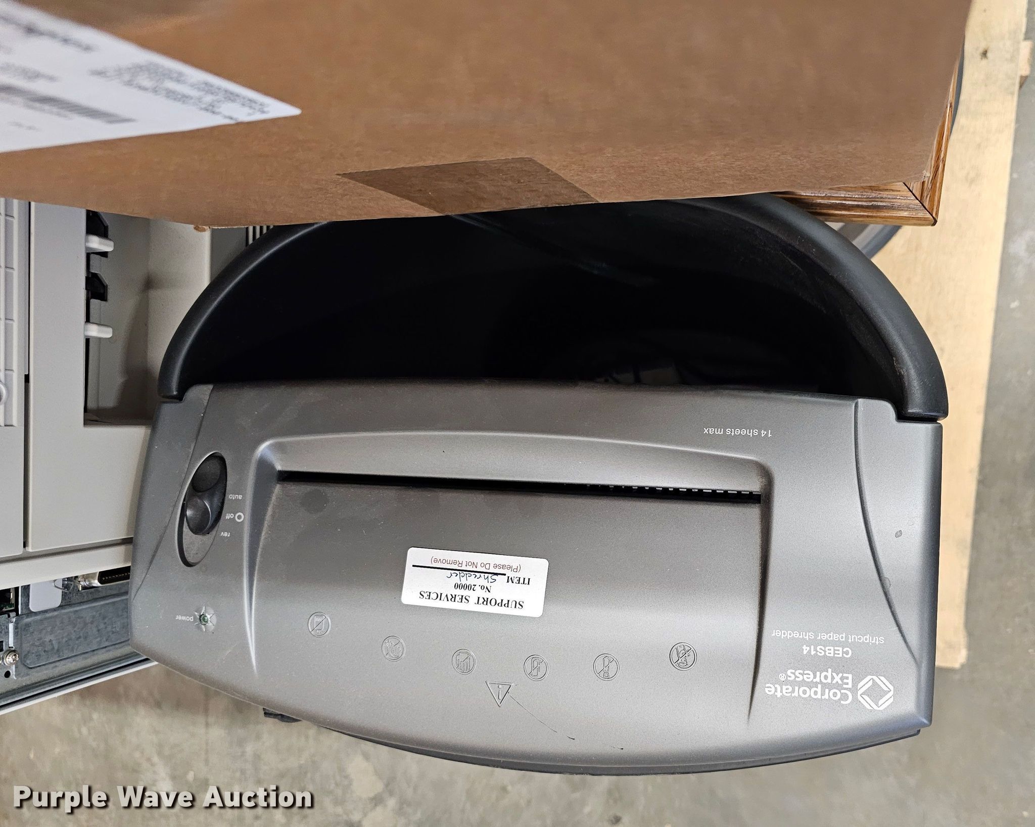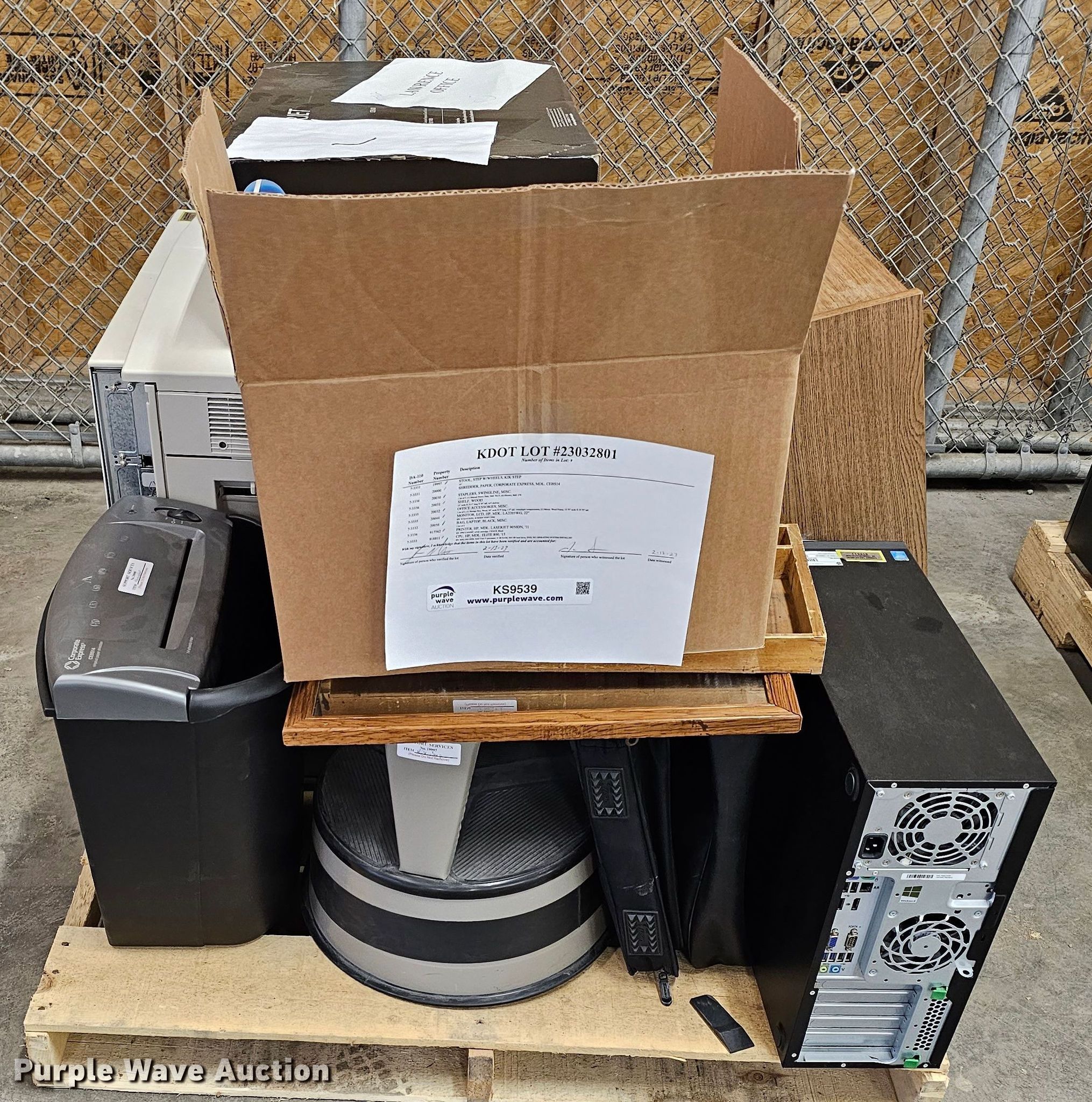 Purple Wave is selling a used Office Supplies and Equip. in Kansas. This item is a Office supplies and equipment with the following: Kik 16" step stool, Corporate Express CEBS14 paper shredder, (5) Swingline staplers, Wood shelf, 12"W x 19.5"D x 26"H, Storage box, Mirror, HP LA2205WG 22" monitor, Display issues, (2) laptop bags, HP Laserjet 9050DN printer, HP ELite 800 CPU, Intel Core i3 processor, 500 GB HDD, 8 GB RAM, Hard drives have been reformatted and no operating system installed, KDOT ID: 23032801