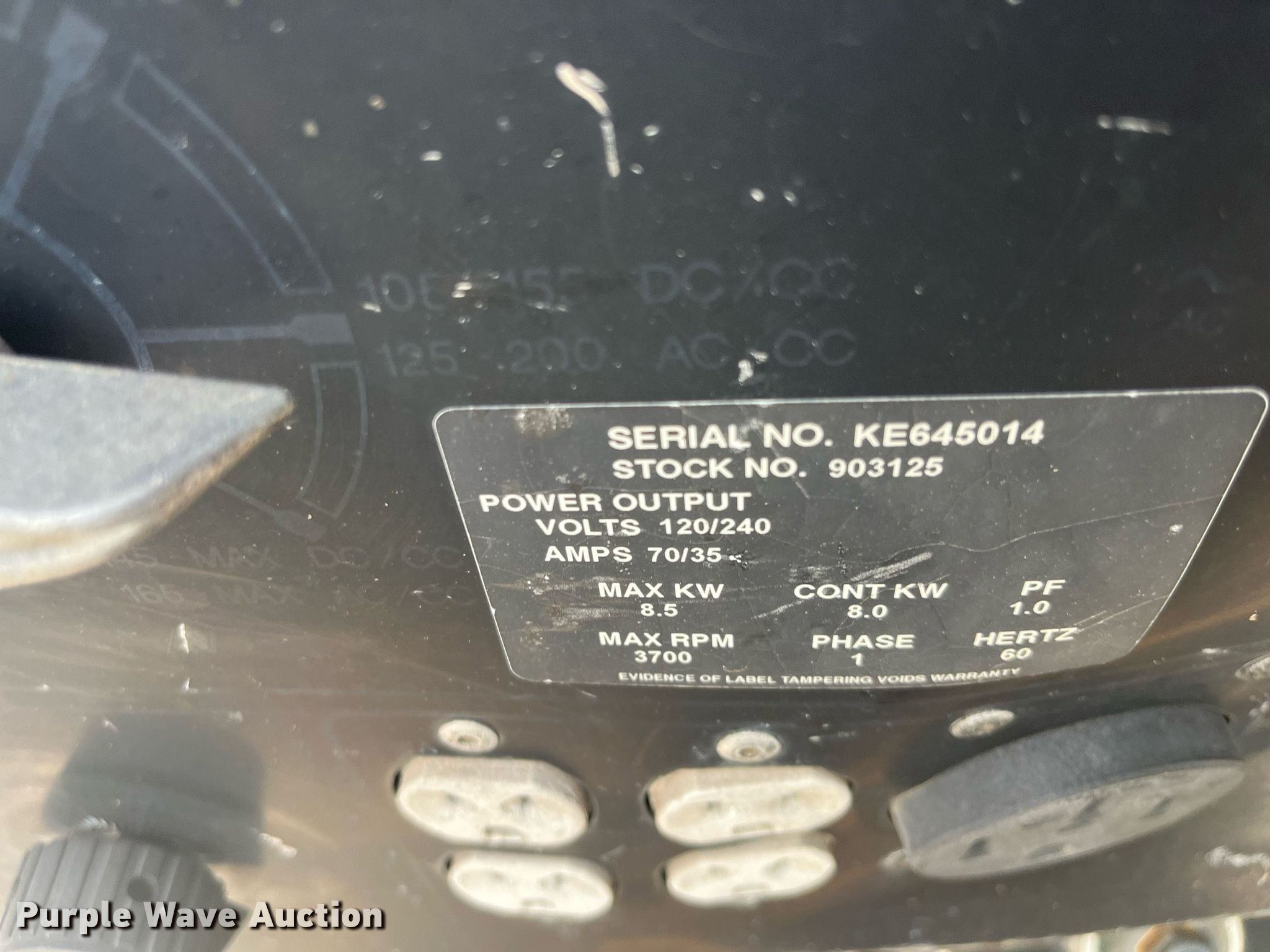 1994 Miller Bobcat 225G welder/generator. Serial: KE645014, KDOT ID: 811-5014. Engine Onan Performer 16, Cylinders: 2, Fuel type: Gas. Features Welder Capabilities: CC, CV, DC, AC, Generator Watts: 8,000, 240V outlets: 1, 120V outlets: 4. Notes No battery, Choke cable issues, may need replaced, Unknown operating condition. Kansas Department of Transportation - Hutchinson. 500 N. Hendricks. Hutchinson, KS 67501
