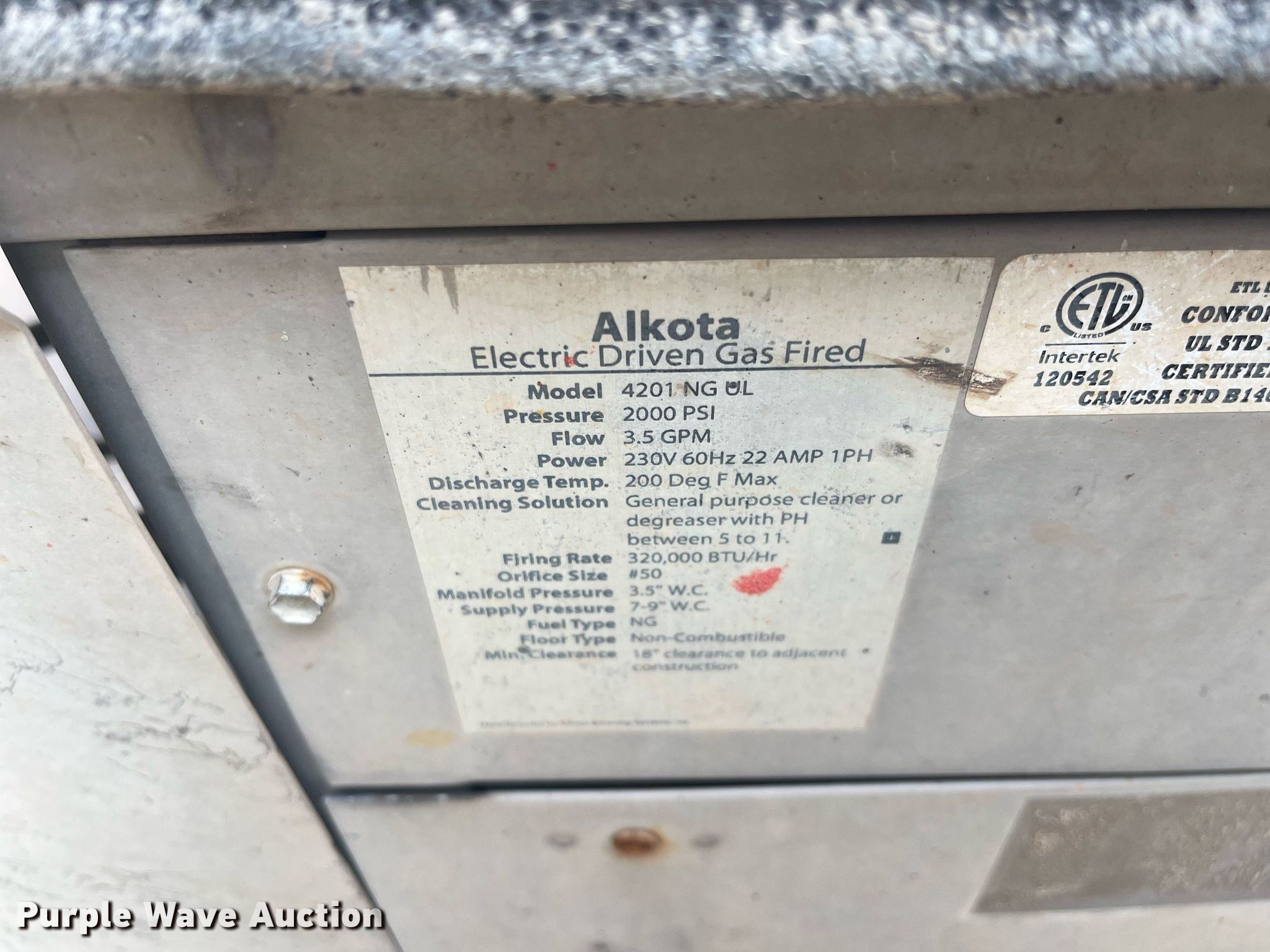 2012 Alkota 4201T-NG-UL pressure washer. Serial: 263770, KDOT ID: 875-5012. Electric Motor HP: 5, Phase: Single. Features GPM: 3.5, Natural gas fired burner. Notes Non-operational unit. Kansas Department of Transportation - Hutchinson. 500 N. Hendricks. Hutchinson, KS 67501