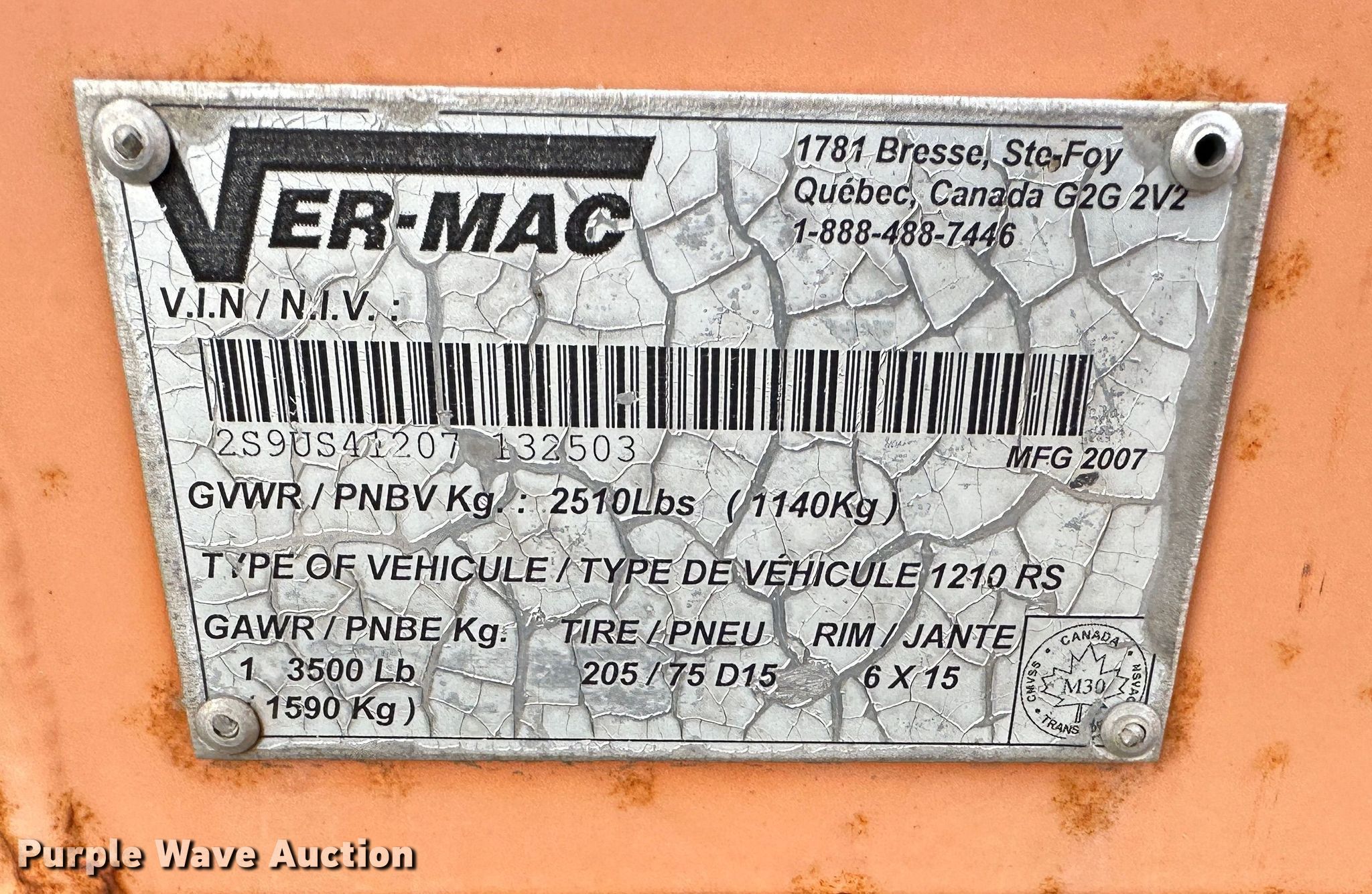2007 Ver-Mac PCMS1210 message board trailer. VIN: 2S9US41207S132503, KDOT ID: 553-2027. Features 44" x 40" solar panel, (6) 6V batteries. Trailer 16'L x 7.5'W, Ball hitch size: 2", Brakes: Hydraulic. Tires Size: 205/75R15. Kansas title. Titles will be distributed after confirmation of payment and removal. Title distribution may be delayed up to 30 days from verification of funds. Kansas Department of Transportation - Salina. 1006 North 3rd. Salina, KS 67401