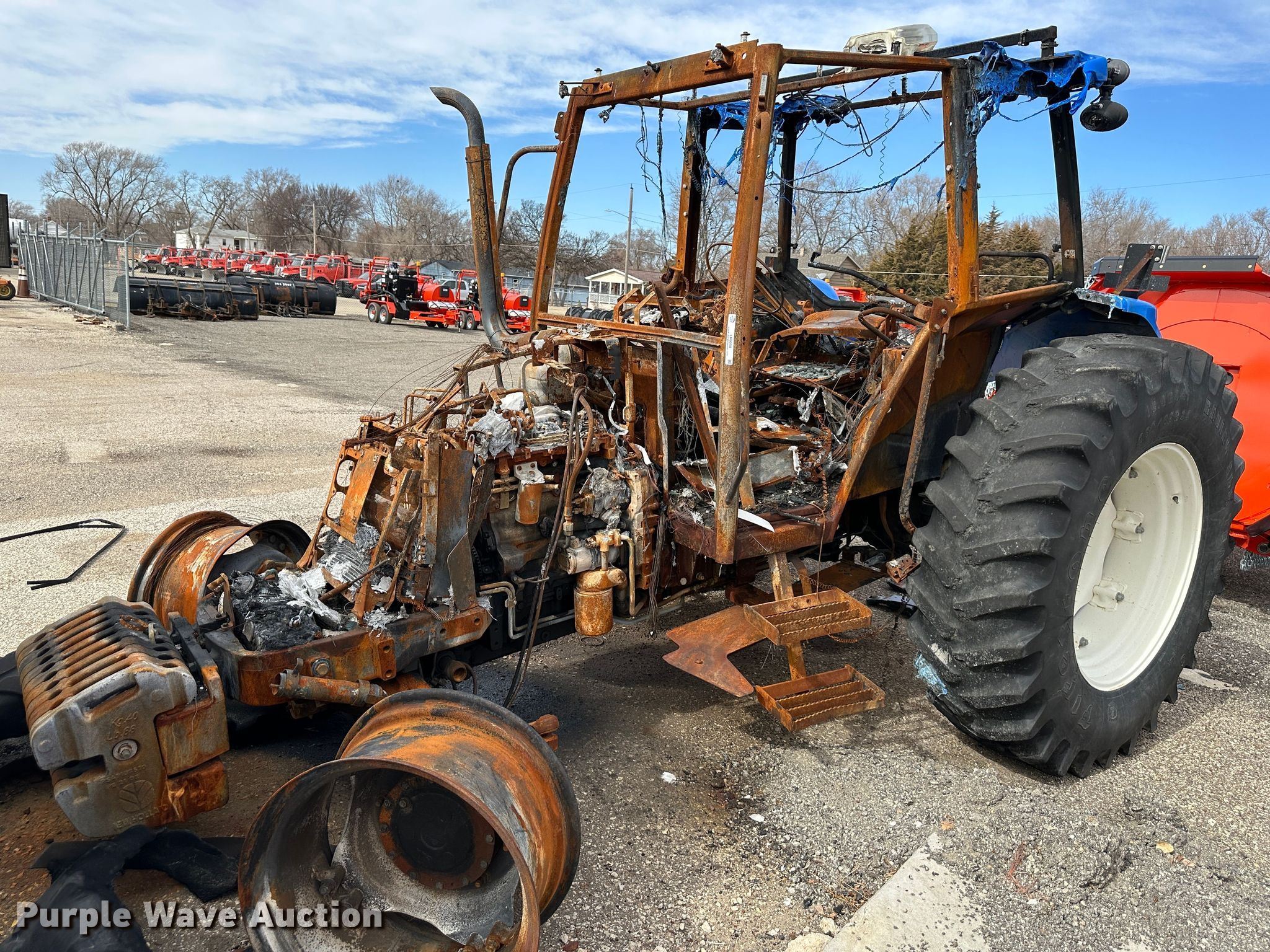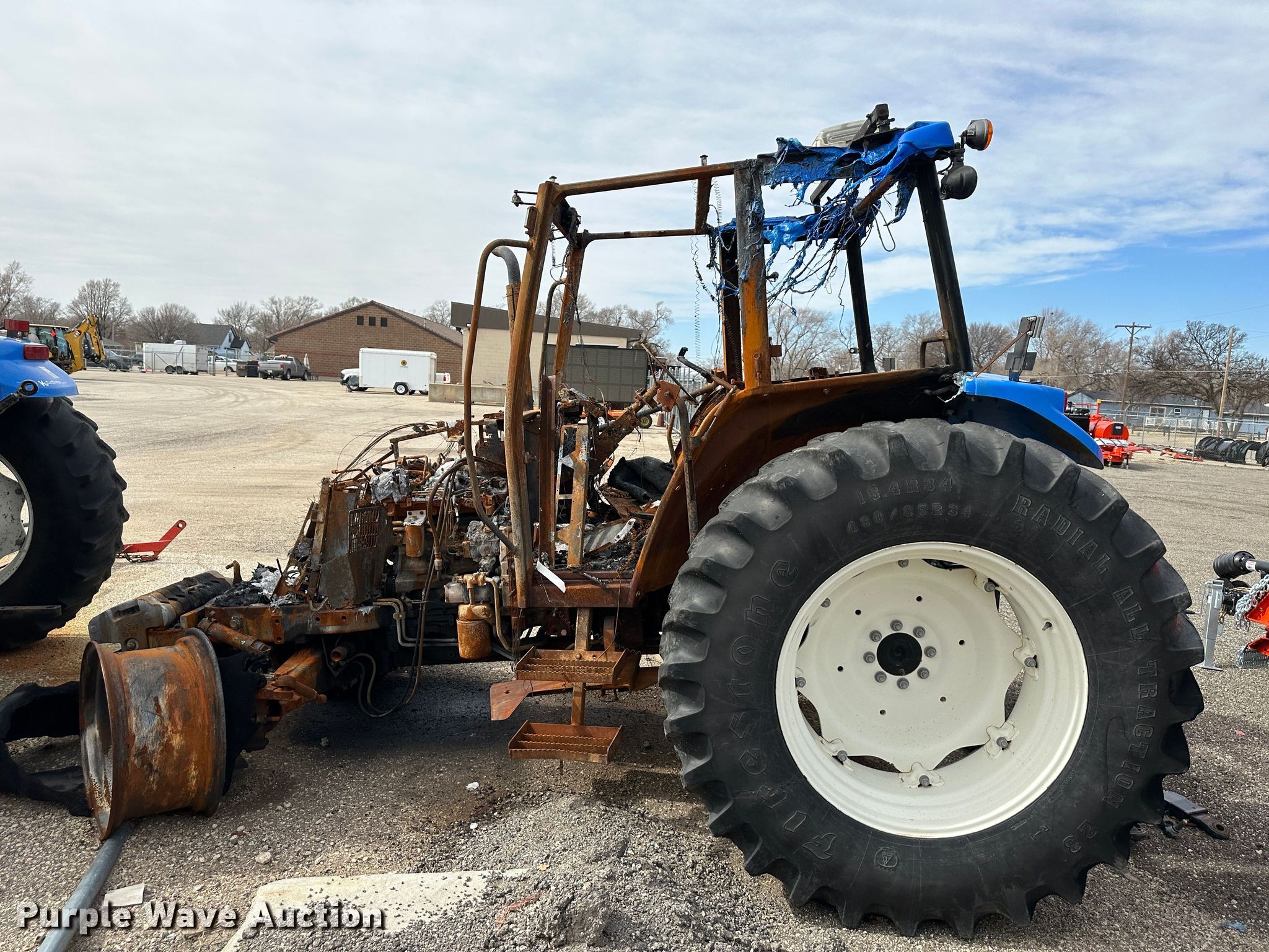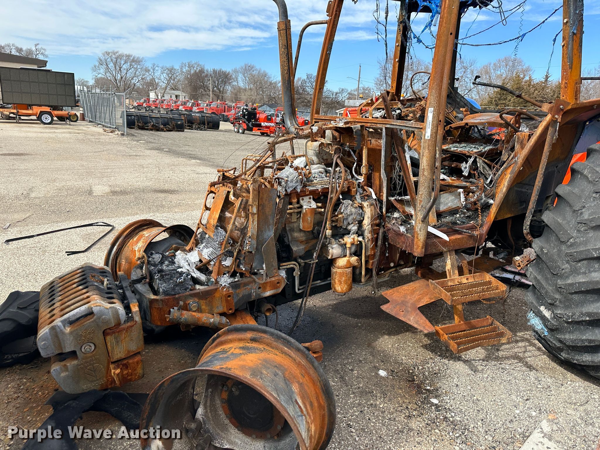 2011 New Holland T5070 MFWD tractor. Hours: Unknown Last recorded hours: 3,866, Serial: ZBJH08796, KDOT ID: 352-2021. Engine New Holland Tier III, Displacement: 4.5L, Cylinders: 4, Fuel type: Diesel. Transmission Synchro, 12F - 12R. Operators station AC, Heat. Features PTO: 540, 1000, Three point, Seven pin outlet, Hydraulic remote sets Rear: 3, Suitcase weights: 10. Tires Rear: 18.4R34. Notes Three point arms missing, PTO end shaft missing, Fire damage, Non-operational unit. Kansas Department of Transportation - Salina. 1006 North 3rd. Salina, KS 67401