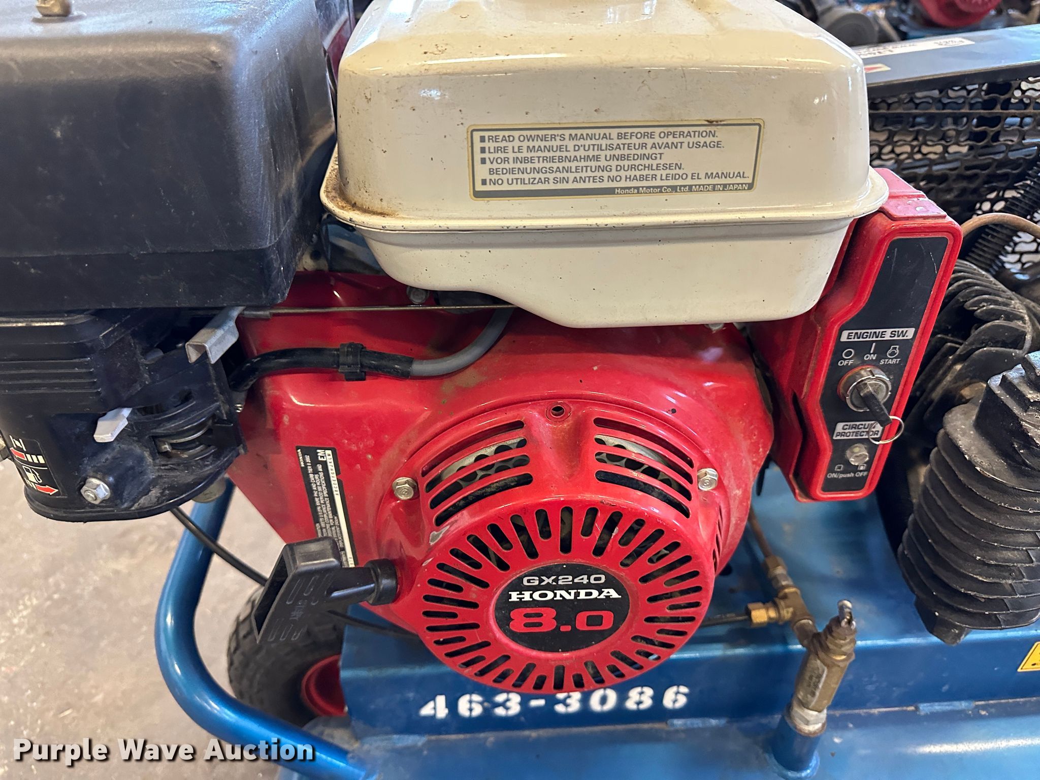 Puma TUE8008GE air compressor. Serial: 03025199, KDOT ID: 463-3086. Engine Honda GX240, Cylinders: 1, Fuel type: Gas, HP: 8. Features CFM: 14.8, PSI: 175, Tank capacity: 8 gallons. Kansas Department of Transportation - Norton. 312 S 2nd Ave. Norton, KS 67654