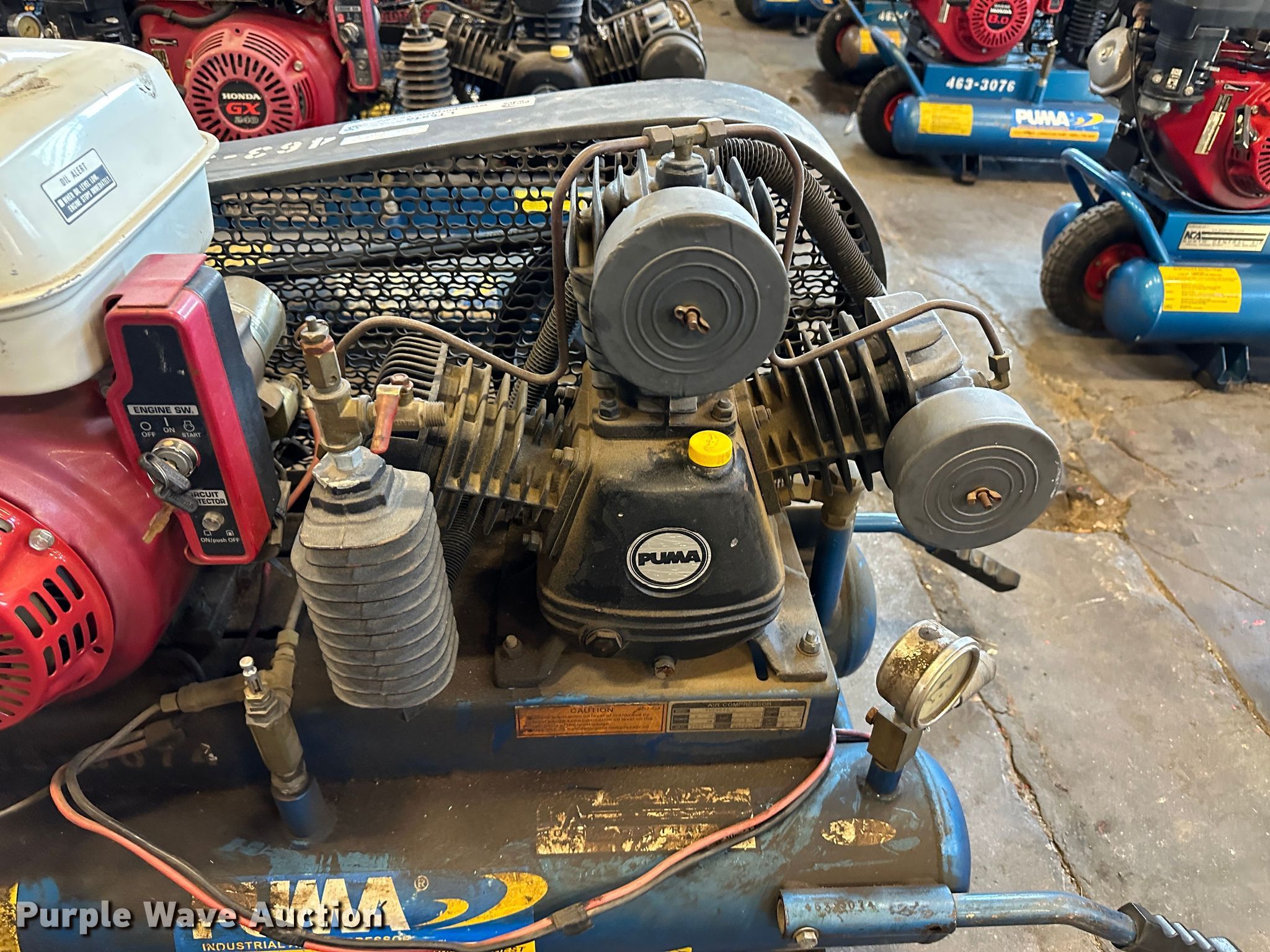 Puma TUE8008GE air compressor. Serial: N3022471, KDOT ID: 463-3074. Engine Honda GX240, Cylinders: 1, Fuel type: Gas, HP: 8. Features CFM: 14.8, PSI: 175, Tank capacity: 8 gallons. Kansas Department of Transportation - Norton. 312 S 2nd Ave. Norton, KS 67654