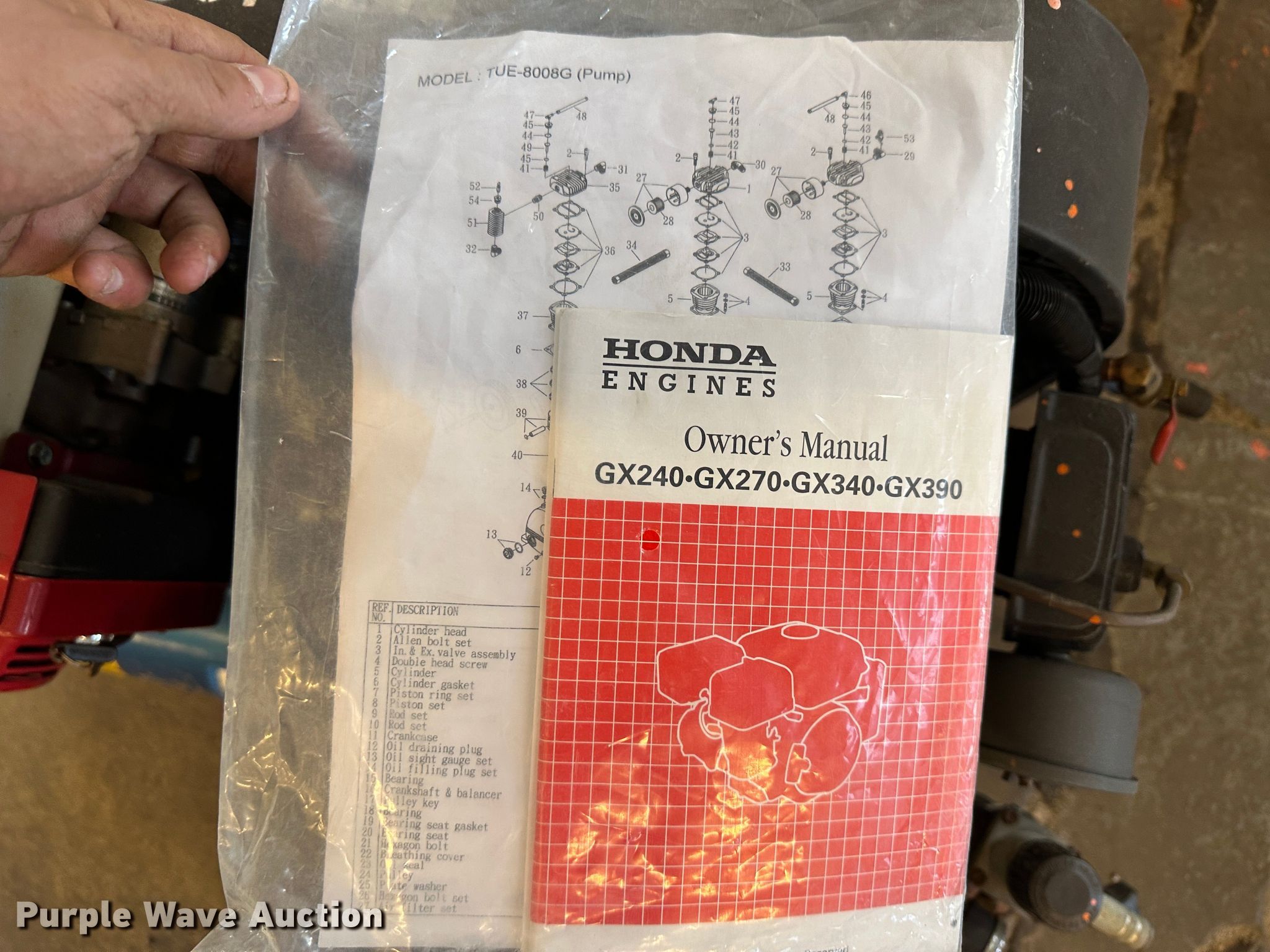 Puma TUE8008GE air compressor. Serial: 06022141, KDOT ID: 463-3026. Engine Honda GX240, Cylinders: 1, Fuel type: Gas, HP: 8. Features CFM: 14.8, PSI: 175, Tank capacity: 8 gallons. Kansas Department of Transportation - Norton. 312 S 2nd Ave. Norton, KS 67654